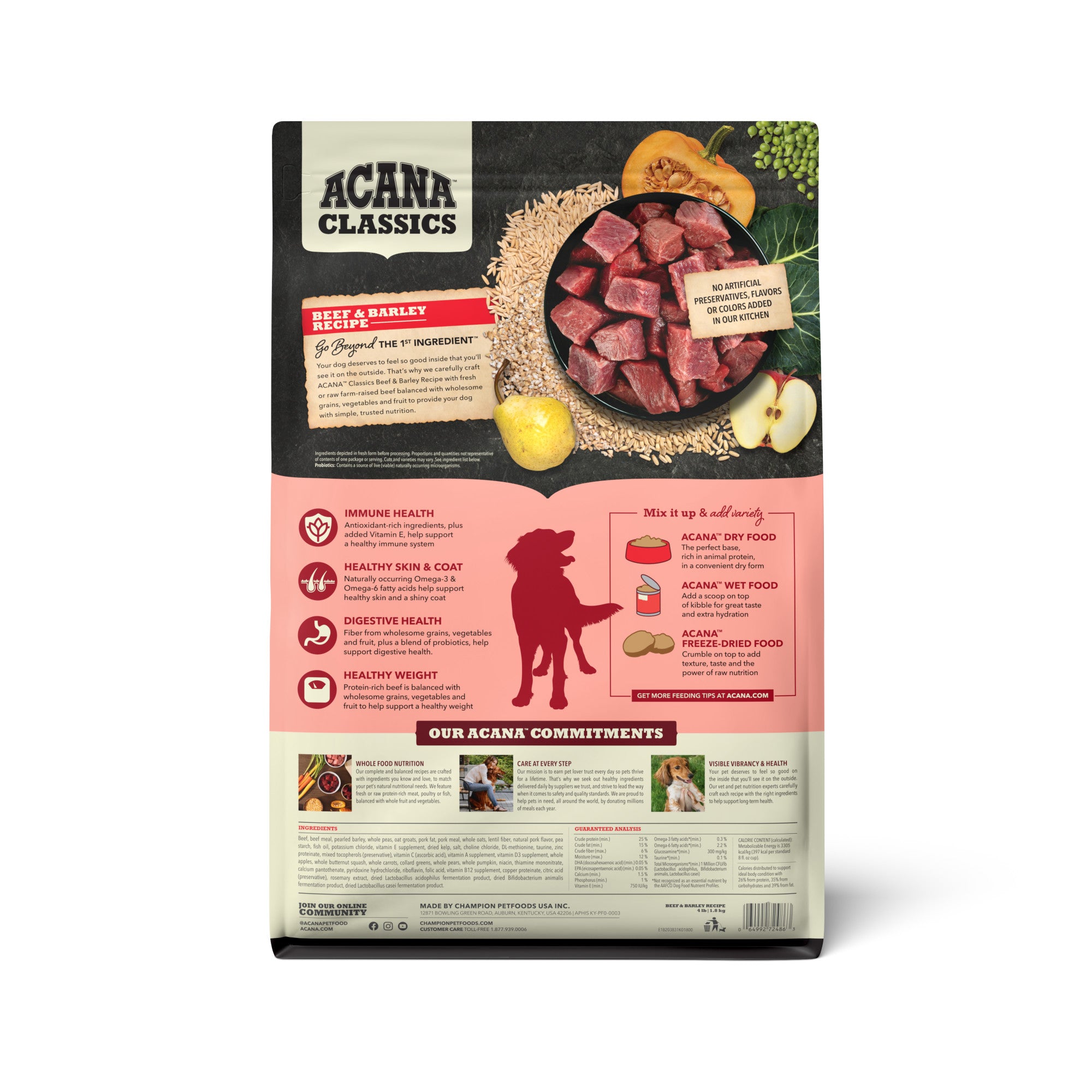 Shop / Unknown Type / ACANA Classics Dry Dog Food Beef & Barley Recipe 4lb ACANA Classics Dry Dog Food Beef & Barley Recipe 4lb ACANA 4lb $16.99 4lb Purchase Options Free In-Store Pick Up Not Available Save 10% on orders $49+ Set your store for inventory and store pickup details Zip Code Search Same-day Delivery* No minimum charge for delivery orders. *Order before 2pm and have it delivered today. Orders placed after 2pm will be delivered the next day. Must be inside delivery radius. Zip Code Unfortunately delivery is not available to this address. In order to ensure the best availability accuracy, changing your selected store will remove all items from your cart. You will need to re-add these items with your newly selected store if you choose to continue. Continue Cancel Ship it to Me Quantity Add To Cart Feeding guide disclaimer ✕ Feeding guides provide a starting point for the amount of food to give your pet each day. We recommend that you keep your pet in ideal body condition and not allow them to become overweight. The amount of food your pet needs can vary based on age, activity level or other food and treats given, so be sure to work with your veterinarian to determine an appropriate weight for your pet, and to make any necessary adjustments to their feeding. Information Help your dog feel so good inside, you’ll see it on the outside! Nurture your dog with the simple nutrition and wholesome ingredients in ACANA™ Classics Beef & Barley Recipe. Crafted with protein-rich farm-raised beef, this recipe is balanced with wholesome grains, vegetables and fruit, meaning it’s packed with nutrients, not fillers. Your dog will love its delicious taste, and you’ll love that its nutritious ingredients help support 4 key health benefits, including Immune Health, Healthy Skin and Coat, Digestive Health and Healthy Weight. Nourish your dog with quality nutrition fresh from our kitchen with ACANA Classics dog food! Helps support immune health with antioxidant-rich ingredients, plus added Vitamin E. Nurtures healthy skin and coat with naturally occurring Omega-3 and Omega-6 fatty acids. Fiber from wholesome grains, vegetables and fruit, plus a blend of probiotics, help support digestive health. Made in the USA with quality ingredients from around the world. Ingredients Beef, beef meal, pearled barley, whole peas, oat groats, pork fat, pork meal, whole oats, lentil fiber, natural pork flavor, pea starch, fish oil, potassium chloride, vitamin E supplement, dried kelp, salt, choline chloride, DL-methionine, taurine, zinc proteinate, mixed tocopherols (preservative), vitamin C (ascorbic acid), vitamin A supplement, vitamin D3 supplement, whole apples, whole butternut squash, whole carrots, collard greens, whole pears, whole pumpkin, niacin, thiamine mononitrate, calcium pantothenate, pyridoxine hydrochloride, riboflavin, folic acid, vitamin B12 supplement, copper proteinate, citric acid (preservative), rosemary extract, dried Lactobacillus acidophilus fermentation product, dried Bifidobacterium animalis fermentation product, dried Lactobacillus casei fermentation product. Guaranteed Analysis Crude protein 25% Fat content 15% Crude ash 6% Crude fiber 5% Moisture 12% Calcium 1.5% Phosphorus 1.0% Omega-6 fatty acids 2.2% Omega-3 fatty acids 0.3% DHA (docosahexaenoic acid) 0.05% EPA (eicosapentaenoic acid) 0.05% Customers also liked Customer Reviews
