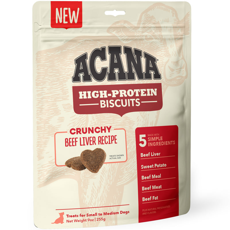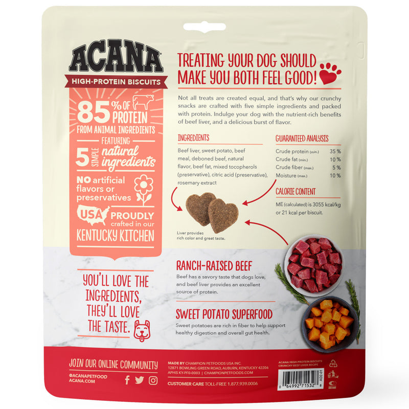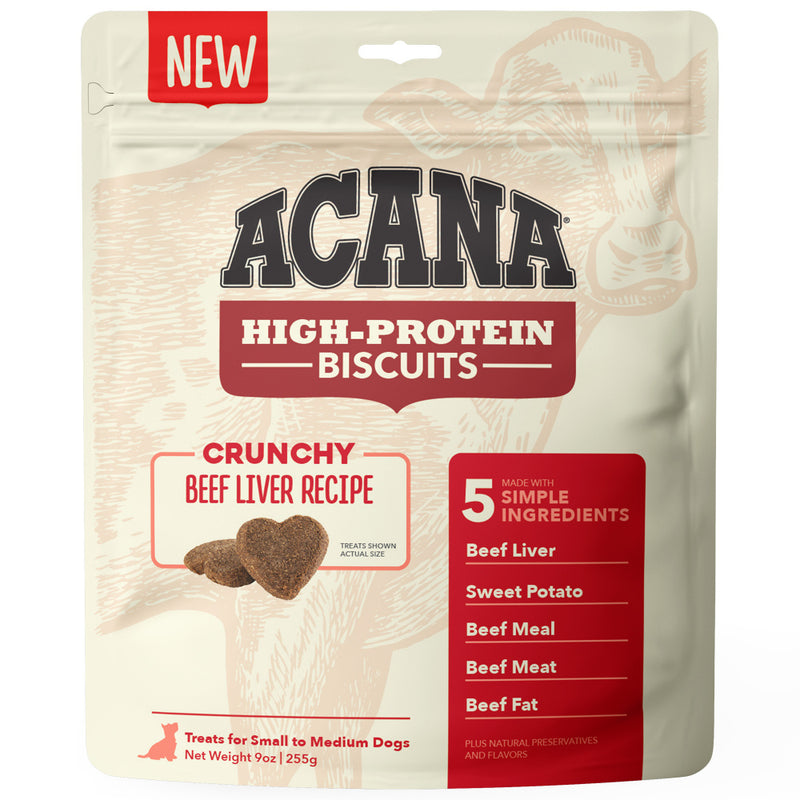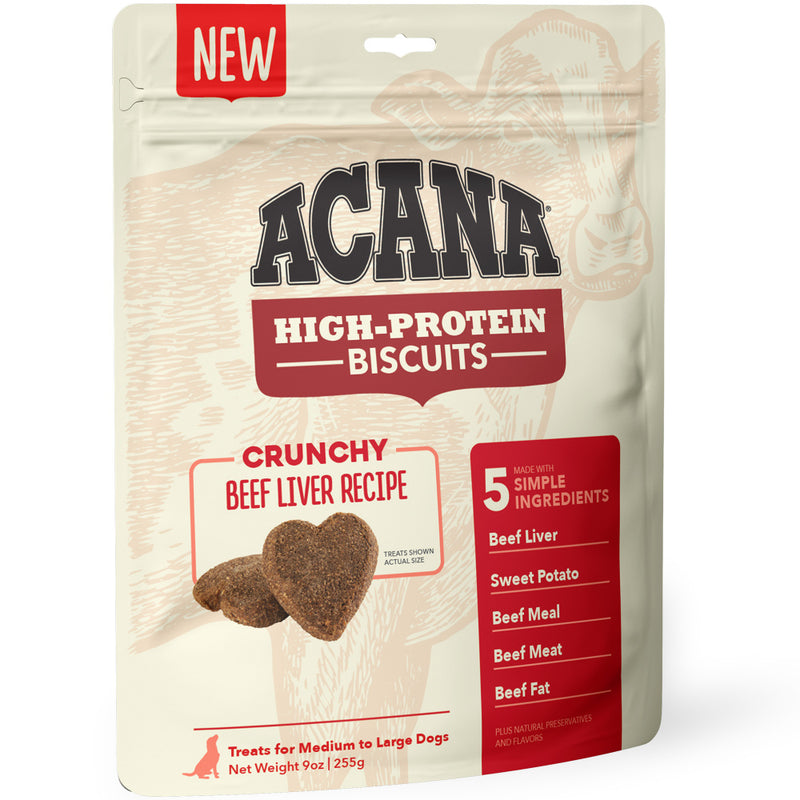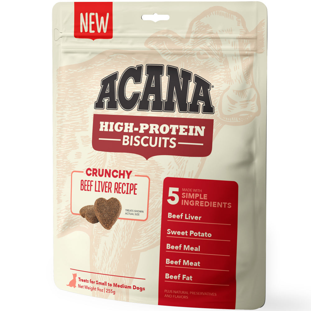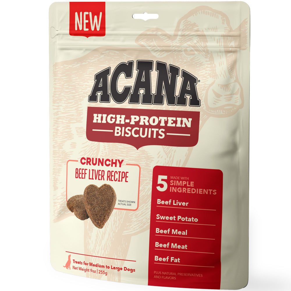 Shop / Food / ACANA Crunchy Biscuits High-Protein Beef Liver Recipe Dog Treats ACANA Crunchy Biscuits High-Protein Beef Liver Recipe Dog Treats ACANA Weight: 9 oz, Large/Medium Breed $7.99 9-oz, Large/Medium Breed Purchase Options Free In-Store Pick Up Not Available Save 10% on orders $49+ Set your store for inventory and store pickup details Zip Code Search Same-day Delivery* No minimum charge for delivery orders. *Order before 2pm and have it delivered today. Orders placed after 2pm will be delivered the next day. Must be inside delivery radius. Zip Code Unfortunately delivery is not available to this address. In order to ensure the best availability accuracy, changing your selected store will remove all items from your cart. You will need to re-add these items with your newly selected store if you choose to continue. Continue Cancel Ship it to Me Quantity Add To Cart Feeding guide disclaimer ✕ Feeding guides provide a starting point for the amount of food to give your pet each day. We recommend that you keep your pet in ideal body condition and not allow them to become overweight. The amount of food your pet needs can vary based on age, activity level or other food and treats given, so be sure to work with your veterinarian to determine an appropriate weight for your pet, and to make any necessary adjustments to their feeding. Information Made from just 5 simple ingredients, ACANA High-Protein Biscuits Beef Liver recipe are a great way to reward your dog with a delicious treat, without any guilt. They contain 85%* of total protein from animal ingredients like ranch-raised beef liver, and theyre also grain free. With no artificial preservatives added in our kitchen, treating your dog never felt so good. *85% of 33% to 38% crude protein, approximate and derived from unprocessed state of ingredients. Plus natural preservatives and flavors.Why We Love It 85%* of total protein from animal ingredients Beef has a savory taste that dog love and beef liver provides an excellent source of protein. Inclusions of sweet potatoes are rich in fiber to support healthy digestion and overall gut health About AcanaYour dog may not roam the wilderness like their ancestors did, but that doesn't mean you shouldn't feed them like they don't. ACANA makes only foods that are rich in meat and protein variety, with wholeprey meat ratios and limited carbohydrates, replacing fast carbs with low glycemic, healthy fruits and vegetables. With a state of art brand new kitchen in Kentucky, all ACANA foods are sourced and made right here in the USA by trusted farmers. With human grade ingredients that typically arrive at the kitchens within 48 hours of harvesting, fresh is the entire basis of ACANA's brand. Ingredients like heritage red meats from the Appalachian ranching country, free run poultry and eggs, wild caught fish from New England, whole fruits and vegetables like Bartlett pears and butternut squash, and locally grown botanicals from Kentucky, ACANA believes the healthiest foods are made here at home in Kentucky, never outsourced. ACANA nourishes your pet's instinct for real, fresh meats and high quality grain-free carbohydrates. It's everything Mother Nature intended, and nothing she did not. Ingredients Beef liver, sweet potato, beef meal, deboned beef, natural flavor, beef fat, mixed tocopherols (preservative), citric acid (preservative), rosemary extract Guaranteed Analysis Nutrient Guaranteed Units Crude Protein 35% min Crude Fat 10% min Crude Fiber 5% max Moisture 10% max Customers also liked Customer Reviews