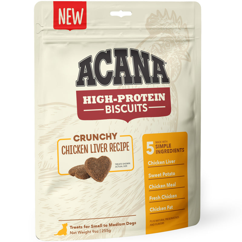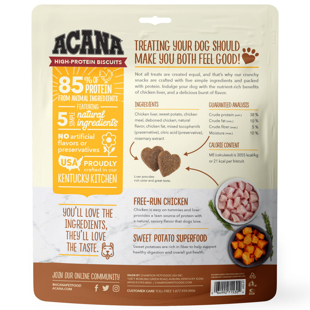 Shop / Food / ACANA Crunchy Biscuits High-Protein Chicken Liver Recipe Dog Treats ACANA Crunchy Biscuits High-Protein Chicken Liver Recipe Dog Treats ACANA Weight: 9 oz, Large/Medium Breed $7.99 9-oz, Large/Medium Breed Purchase Options Free In-Store Pick Up Not Available Save 10% on orders $49+ Set your store for inventory and store pickup details Zip Code Search Same-day Delivery* No minimum charge for delivery orders. *Order before 2pm and have it delivered today. Orders placed after 2pm will be delivered the next day. Must be inside delivery radius. Zip Code Unfortunately delivery is not available to this address. In order to ensure the best availability accuracy, changing your selected store will remove all items from your cart. You will need to re-add these items with your newly selected store if you choose to continue. Continue Cancel Ship it to Me Quantity Add To Cart Feeding guide disclaimer ✕ Feeding guides provide a starting point for the amount of food to give your pet each day. We recommend that you keep your pet in ideal body condition and not allow them to become overweight. The amount of food your pet needs can vary based on age, activity level or other food and treats given, so be sure to work with your veterinarian to determine an appropriate weight for your pet, and to make any necessary adjustments to their feeding. Information Made from just 5 simple ingredients, ACANA High-Protein Biscuits Chicken Liver recipe are a great way to reward your dog with a delicious treat, without any guilt. They contain 85%* of total protein from animal ingredients like free-run chicken liver, and theyre also grain free. With no artificial preservatives added in our kitchen, treating your dog never felt so good. *85% of 33% to 38% crude protein, approximate and derived from unprocessed state of ingredients.Plus natural preservatives and flavors.Why We Love It 85%* of total protein from animal ingredients Chicken is easy on the tummies and liver provides a lean source of protein with a savoury flavor that dogs love. Inclusions of sweet potatoes are rich in fiber to support healthy digestion and overall gut health About AcanaYour dog may not roam the wilderness like their ancestors did, but that doesn't mean you shouldn't feed them like they don't. ACANA makes only foods that are rich in meat and protein variety, with wholeprey meat ratios and limited carbohydrates, replacing fast carbs with low glycemic, healthy fruits and vegetables. With a state of art brand new kitchen in Kentucky, all ACANA foods are sourced and made right here in the USA by trusted farmers. With human grade ingredients that typically arrive at the kitchens within 48 hours of harvesting, fresh is the entire basis of ACANA's brand. Ingredients like heritage red meats from the Appalachian ranching country, free run poultry and eggs, wild caught fish from New England, whole fruits and vegetables like Bartlett pears and butternut squash, and locally grown botanicals from Kentucky, ACANA believes the healthiest foods are made here at home in Kentucky, never outsourced. ACANA nourishes your pet's instinct for real, fresh meats and high quality grain-free carbohydrates. It's everything Mother Nature intended, and nothing she did not. Ingredients Chicken liver, sweet potato, chicken meal, deboned chicken, natural flavor, chicken fat, mixed tocopherols (preservative), citric acid (preservative), rosemary extract Guaranteed Analysis Nutrient Guaranteed Units Crude Protein 38% min Crude Fat 10% min Crude Fiber 5% max Moisture 10% max Customers also liked Customer Reviews