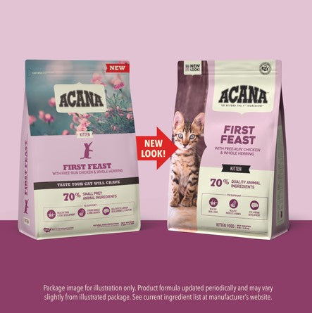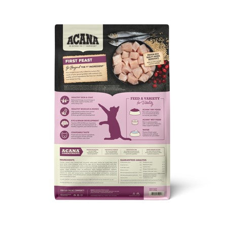 Shop / Unknown Type / ACANA First Feast Dry Cat Food ACANA First Feast Dry Cat Food ACANA Weight: 4 lb $21.99 4-lb Purchase Options Free In-Store Pick Up Not Available Save 10% on orders $49+ Set your store for inventory and store pickup details Zip Code Search Same-day Delivery* No minimum charge for delivery orders. *Order before 2pm and have it delivered today. Orders placed after 2pm will be delivered the next day. Must be inside delivery radius. Zip Code Unfortunately delivery is not available to this address. In order to ensure the best availability accuracy, changing your selected store will remove all items from your cart. You will need to re-add these items with your newly selected store if you choose to continue. Continue Cancel Ship it to Me Quantity Add To Cart Feeding guide disclaimer ✕ Feeding guides provide a starting point for the amount of food to give your pet each day. We recommend that you keep your pet in ideal body condition and not allow them to become overweight. The amount of food your pet needs can vary based on age, activity level or other food and treats given, so be sure to work with your veterinarian to determine an appropriate weight for your pet, and to make any necessary adjustments to their feeding. Information Your kitten is an obligate carnivore, genetically designed for a diet that is rich in protein from whole animal ingredients. Crafted to provide everything your kitten needs for peak growth and development, ACANA First Feast is brimming with 70% free-run chicken and whole herring in WholePrey ratios of meat, organs, and cartilage or bone, providing your kitten with everything they need in order to grow up healthy, happy, and strong, with a delicious flavor that they’ll love. -70% small prey animal ingredients -Taurine, EPA, and DHA promote the growth and development of healthy cognitive and retinal function -Balanced Omega-3 and Omega-6 fatty acids support healthy skin and a shiny coat -High-quality protein supports muscle and bone growth and development" Ingredients Chicken, chicken meal, herring meal, oat groats, whole peas, chicken fat, turkey meal, whole green lentils, whole chickpeas, whole herring, eggs, fish oil, natural chicken flavor, lentil fiber, quail, chicken liver, chicken heart, whole cranberries, dried kelp, choline chloride, zinc proteinate, mixed tocopherols (preservative), vitamin E supplement, taurine, vitamin D3 supplement, vitamin A acetate, copper proteinate, biotin, DL-methionine, niacin, thiamine mononitrate, riboflavin, calcium pantothenate, pyridoxine hydrochloride, folic acid, vitamin B12 supplement, ascorbic acid (vitamin C), citric acid (preservative), rosemary extract, dried Lactobacillus acidophilus fermentation product, dried Bifidobacterium animalis fermentation product, dried Lactobacillus casei fermentation product Guaranteed Analysis Nutrient Guaranteed Units Crude Protein 36% min Crude Fat 18% min Crude Fiber 4% max Moisture 10% max Calcium 1.7% min Phosphorus 1.1% min Magnesium 0.1% min Taurine 0.1% min Omega-3 Fatty Acids 0.9% min Omega-6 Fatty Acids 2.8% min DHA 0.2% min EPA 0.15% min Total Microorganisms 100MM CFU/lb min Customers also liked Customer Reviews