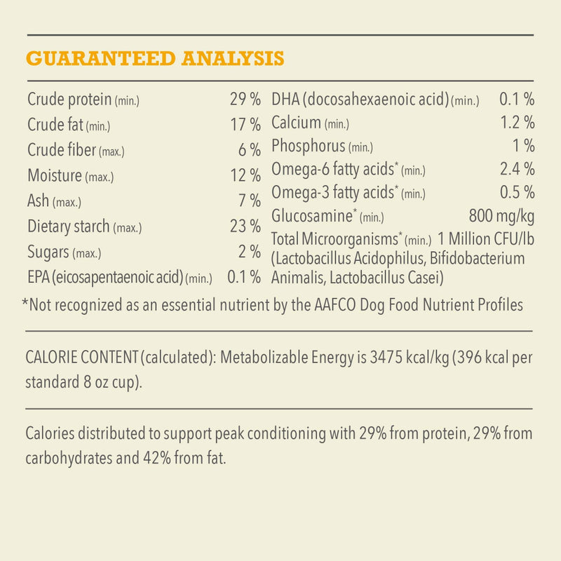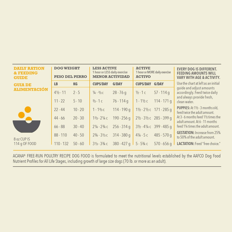Shop / Unknown Type / ACANA Free Run Poultry Formula Grain Free Dry Dog Food ACANA Free Run Poultry Formula Grain Free Dry Dog Food ACANA $49.99 13 lb 25 lb 13-lb 25-lb Purchase Options Free In-Store Pick Up Not Available Save 10% on orders $49+ Set your store for inventory and store pickup details Zip Code Search Same-day Delivery* No minimum charge for delivery orders. *Order before 2pm and have it delivered today. Orders placed after 2pm will be delivered the next day. Must be inside delivery radius. Zip Code Unfortunately delivery is not available to this address. In order to ensure the best availability accuracy, changing your selected store will remove all items from your cart. You will need to re-add these items with your newly selected store if you choose to continue. Continue Cancel Ship it to Me Quantity Add To Cart Feeding guide disclaimer ✕ Feeding guides provide a starting point for the amount of food to give your pet each day. We recommend that you keep your pet in ideal body condition and not allow them to become overweight. The amount of food your pet needs can vary based on age, activity level or other food and treats given, so be sure to work with your veterinarian to determine an appropriate weight for your pet, and to make any necessary adjustments to their feeding. Information Go Beyond the 1st Ingredient™ with ACANA® recipes that are thoughtfully crafted from start to finish. ACANA Free-Run Poultry recipe is balanced with 60%* quality animal ingredients like free-chicken and turkey**, cage-free eggs, and 40%+ fruits, vegetables, and botanicals. Artificial colors, flavors or preservatives are never added in our kitchen. Our premium ingredients come from a curated group of farmers, ranchers and fishers we’ve known and trusted for decades, and we approach every batch with an unsurpassed commitment to safety and quality in our award-winning Kentucky kitchen. The result is a protein-rich, nutritious, and delicious dog food to help them live a healthy, happy life. • Approximate and derived from the unprocessed state of the ingredients. **Our free-run chickens and turkeys are not housed in cages and are able to move in a barn without outdoor access. +We also add vitamins, minerals, natural preservatives and probiotics. Why We Love It First two ingredients are fresh or raw chicken & turkey; nutrient-dense and high in protein. Our fresh ingredients use refrigeration as the sole method of preservation and our raw ingredients are frozen at their peak freshness. Includes fresh or raw vegetables & fruit like whole pumpkin, collard greens, apples, and pears. Grain-free with no added soy, corn, wheat or tapioca. About ACANA Your dog may not roam the wilderness like their ancestors did, but that doesn't mean you shouldn't feed them like they don't. ACANA makes only foods that are rich in meat and protein variety, with wholeprey meat ratios and limited carbohydrates, replacing fast carbs with low glycemic, healthy fruits and vegetables. With a state of art brand new kitchen in Kentucky, all ACANA foods are sourced and made right here in the USA by trusted farmers. With human grade ingredients that typically arrive at the kitchens within 48 hours of harvesting, fresh is the entire basis of ACANA's brand. Ingredients like heritage red meats from the Appalachian ranching country, free run poultry and eggs, wild caught fish from New England, whole fruits and vegetables like Bartlett pears and butternut squash, and locally grown botanicals from Kentucky, ACANA believes the healthiest foods are made here at home in Kentucky, never outsourced. ACANA nourishes your pet's instinct for real, fresh meats and high quality grain-free carbohydrates. It's everything Mother Nature intended, and nothing she did not. Ingredients Deboned chicken, deboned turkey, chicken meal, whole red lentils, whole pinto beans, whole green peas, chicken liver, chicken fat, catfish meal, whole chickpeas, whole green lentils, whole yellow peas, lentil fiber, turkey giblets (liver, heart, gizzard), eggs, fish oil, Natural chicken flavor, chicken heart, pea starch, salt, dried kelp, whole pumpkin, mixed tocopherols (preservative), zinc proteinate, calcium pantothenate, collard greens, whole apples, whole pears, vitamin A acetate, vitamin D3 supplement, vitamin E supplement, riboflavin, folic acid, freeze-dried chicken liver, freeze-dried turkey liver, copper proteinate, dried chicory root, turmeric, sarsaparilla, althea root, rose hips, juniper berries, citric acid (preservative), rosemary extract, dried Lactobacillus acidophilus fermentation product, dried Bifidobacterium animalis fermentation product, dried Lactobacillus casei fermentation product. Guaranteed Analysis Nutrient Guaranteed Units Crude Protein 29% min Crude Fat 17% min Crude Fiber 6% max Moisture 12% max Ash 7% max EPA 0.1% DHA 0.1% Calcium 1.2% Phosphorus 1% Omega-3 Fatty Acids 2.4% Omega-6 Fatty Acids 0.5% Glucosamine 800mg/kg Total Microorganisms 1 Million CFU/lb Customers also liked Customer Reviews