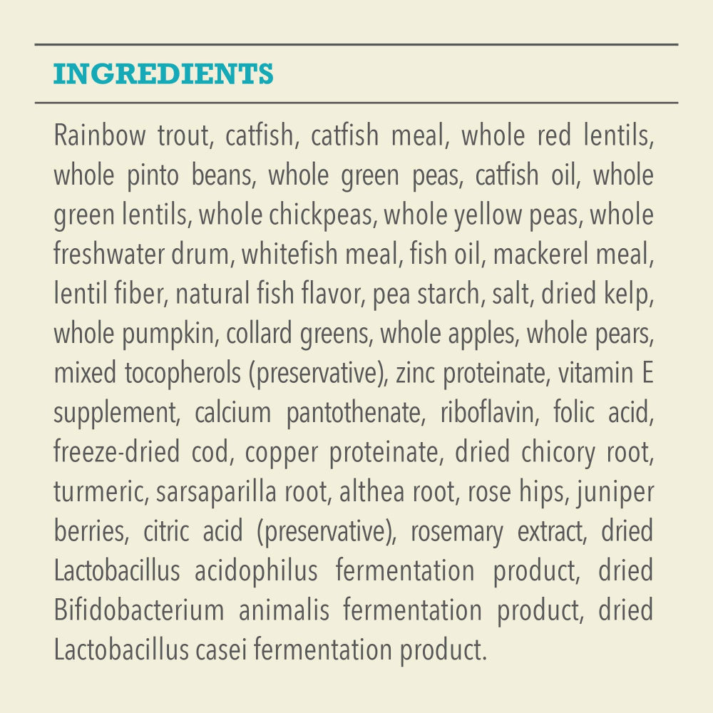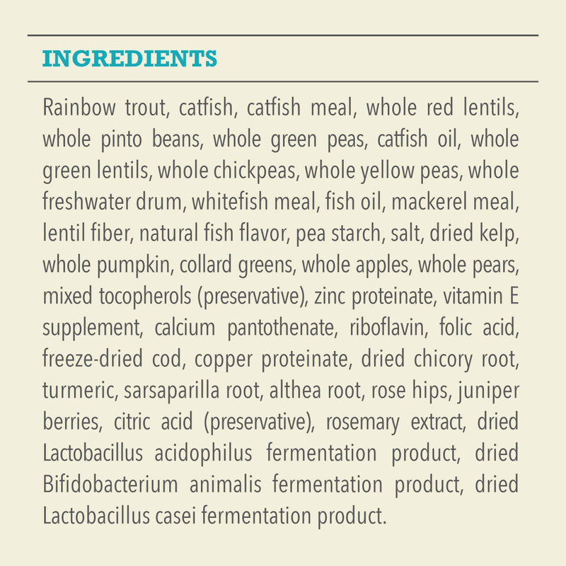 Shop / Unknown Type / ACANA Freshwater Fish Formula Grain Free Dry Dog Food ACANA Freshwater Fish Formula Grain Free Dry Dog Food ACANA $26.99 4.5 lb 13 lb 25 lb 4.5-lb 13-lb 25-lb Purchase Options Free In-Store Pick Up Not Available Save 10% on orders $49+ Set your store for inventory and store pickup details Zip Code Search Same-day Delivery* No minimum charge for delivery orders. *Order before 2pm and have it delivered today. Orders placed after 2pm will be delivered the next day. Must be inside delivery radius. Zip Code Unfortunately delivery is not available to this address. In order to ensure the best availability accuracy, changing your selected store will remove all items from your cart. You will need to re-add these items with your newly selected store if you choose to continue. Continue Cancel Ship it to Me Quantity Add To Cart Feeding guide disclaimer ✕ Feeding guides provide a starting point for the amount of food to give your pet each day. We recommend that you keep your pet in ideal body condition and not allow them to become overweight. The amount of food your pet needs can vary based on age, activity level or other food and treats given, so be sure to work with your veterinarian to determine an appropriate weight for your pet, and to make any necessary adjustments to their feeding. Information Go Beyond the 1st Ingredient™ with ACANA® recipes that are thoughtfully crafted from start to finish. ACANA Freshwater Fish recipe is balanced with 60%* quality animal ingredients like rainbow trout, catfish, and perch, and 40%+ fruits, vegetables, and botanicals. Artificial colors, flavors or preservatives are never added in our kitchen. Our premium ingredients come from a curated group of farmers, ranchers and fishers we’ve known and trusted for decades, and we approach every batch with an unsurpassed commitment to safety and quality in our award-winning Kentucky kitchen. The result is a protein-rich, nutritious, and delicious dog food to help them live a healthy, happy life. *Approximate and derived from the unprocessed state of the ingredients. +We also add vitamins, minerals, natural preservatives and probiotics. Why We Love It First two ingredients are raw rainbow trout and catfish; nutrient-dense and high in protein. Our raw ingredients are frozen at their peak freshness. Includes fresh or raw vegetables & fruit like whole pumpkin, collard greens, apples, and pears. Grain-free with no added soy, corn, wheat or tapioca. About ACANA Your dog may not roam the wilderness like their ancestors did, but that doesn't mean you shouldn't feed them like they don't. ACANA makes only foods that are rich in meat and protein variety, with wholeprey meat ratios and limited carbohydrates, replacing fast carbs with low glycemic, healthy fruits and vegetables. With a state of art brand new kitchen in Kentucky, all ACANA foods are sourced and made right here in the USA by trusted farmers. With human grade ingredients that typically arrive at the kitchens within 48 hours of harvesting, fresh is the entire basis of ACANA's brand. Ingredients like heritage red meats from the Appalachian ranching country, free run poultry and eggs, wild caught fish from New England, whole fruits and vegetables like Bartlett pears and butternut squash, and locally grown botanicals from Kentucky, ACANA believes the healthiest foods are made here at home in Kentucky, never outsourced. ACANA nourishes your pet's instinct for real, fresh meats and high quality grain-free carbohydrates. It's everything Mother Nature intended, and nothing she did not. Ingredients Rainbow trout, catfish, catfish meal, whole red lentils, whole pinto beans, whole green peas, catfish oil, whole green lentils, whole chickpeas, whole yellow peas, whole perch, whitefish meal, fish oil, mackerel meal, lentil fiber, natural fish flavor, pea starch, salt, dried kelp, whole pumpkin, collard greens, whole apples, whole pears, mixed tocopherols (preservative), zinc proteinate, vitamin E supplement, calcium pantothenate, riboflavin, folic acid, freeze dried cod liver, copper proteinate, dried chicory root, turmeric, sarsaparilla, althea root, rose hips, juniper berries, citric acid (preservative), rosemary extract, dried Lactobacillus acidophilus fermentation product, dried Bifidobacterium animalis fermentation product, dried Lactobacillus casei fermentation product. Guaranteed Analysis Nutrient Guaranteed Units Crude Protein 29% min Crude Fat 17% min Crude Fiber 6% max Moisture 12% max DHA 0.2% min EPA 0.2% min Calcium 1.2% min Phosphorus 1% min Omega-6 Fatty Acids 2% min Omega-3 Fatty Acids 1% min Total Microorganisms 100MM CFU/lb min Glucosamine 300 mg/kg min Customers also liked Customer Reviews