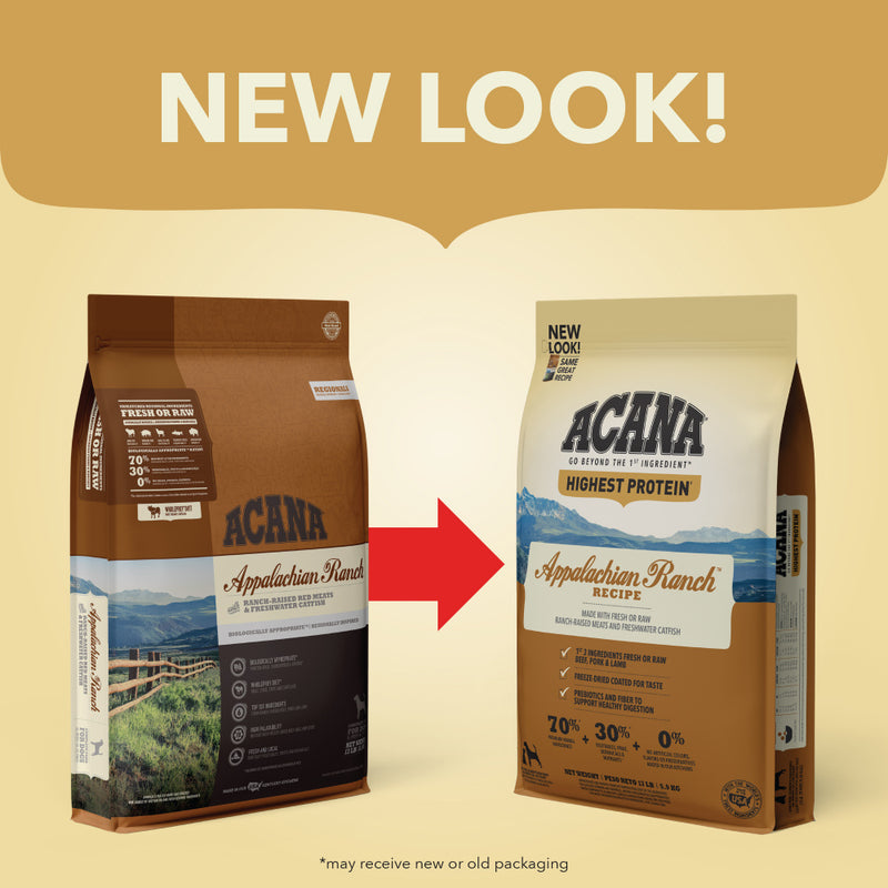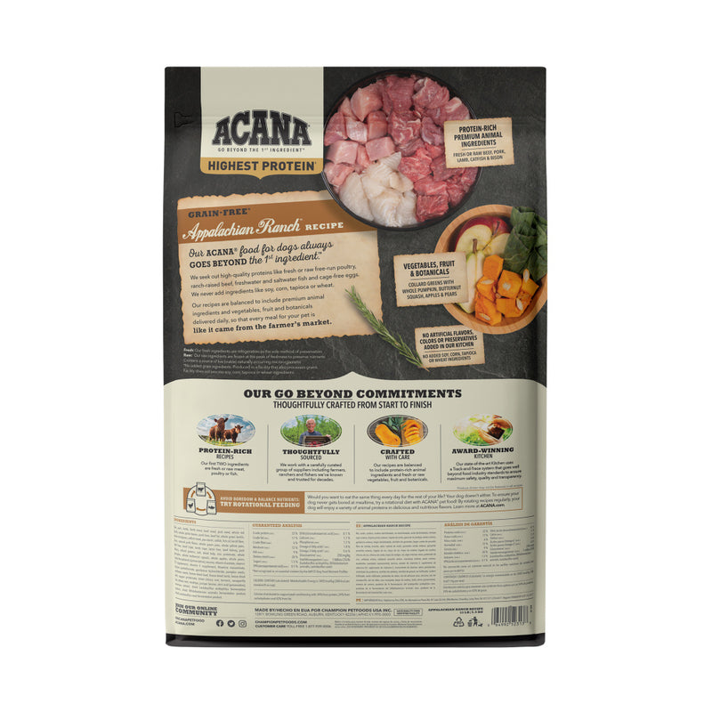 Shop / Unknown Type / ACANA Regionals Appalachian Ranch Grain Free Dry Dog Food ACANA Regionals Appalachian Ranch Grain Free Dry Dog Food ACANA $30.99 4.5 lb 25 lb 4.5-lb 25-lb Purchase Options Free In-Store Pick Up Not Available Save 10% on orders $49+ Set your store for inventory and store pickup details Zip Code Search Same-day Delivery* No minimum charge for delivery orders. *Order before 2pm and have it delivered today. Orders placed after 2pm will be delivered the next day. Must be inside delivery radius. Zip Code Unfortunately delivery is not available to this address. In order to ensure the best availability accuracy, changing your selected store will remove all items from your cart. You will need to re-add these items with your newly selected store if you choose to continue. Continue Cancel Ship it to Me Quantity Add To Cart Feeding guide disclaimer ✕ Feeding guides provide a starting point for the amount of food to give your pet each day. We recommend that you keep your pet in ideal body condition and not allow them to become overweight. The amount of food your pet needs can vary based on age, activity level or other food and treats given, so be sure to work with your veterinarian to determine an appropriate weight for your pet, and to make any necessary adjustments to their feeding. Information Go Beyond the 1st Ingredient™ with ACANA® recipes that are thoughtfully crafted from start to finish. With the highest protein offering in ACANA pet foods, our Highest Protein Appalachian Ranch Recipe is rich with 70%* quality animal ingredients like ranch-raised beef, Yorkshire pork, grass-fed lamb, catfish and bison, balanced with 30%+ fruits, vegetables, and botanicals, many delivered daily. Artificial colors, flavors or preservatives are never added in our kitchen. Our premium ingredients come from a curated group of farmers, ranchers and fishers we’ve known and trusted for decades, and we approach every batch with an unsurpassed commitment to safety and quality in our award-winning Kentucky kitchen. The result is a protein-rich, nutritious, and delicious dog food to help them live a healthy, happy life. *Approximate and derived from the unprocessed state of the ingredients. +We also add vitamins, minerals, natural preservatives and probiotics.Why We Love It First three ingredients are fresh or raw beef, pork, and lamb; nutrient-dense and high in protein. Our fresh ingredients use refrigeration as the sole method of preservation and our raw ingredients are frozen at their peak freshness. Includes fresh or raw vegetables & fruit like collard greens, whole pumpkin, butternut squash, apples, and pears; nutritious and high in fiber. Grain-free with no added soy, corn, wheat or tapioca. ACANA's Appalachian Ranch formula is a grain-free, protein-packed recipe loaded with over 70% of ranch-raised red meats and freshwater catfish! Honoring the Appalachian ranching heritage, this region-inspired recipes features a biologically appropriate variety of premium ingredients including Angus beef, Yorkshire pork and grass-fed Kentucky lamb, bison and freshwater catfish. All ingredients are raised and fished on local Kentucky ranches by farmers ACANA knows and trusts and deemed fit for human consumption before arriving fresh and whole. Staying true to your dog's evolutionary diet, ACANA formulas feature wholeprey ratios in order to mimic the diet mother nature intend so your dog can maintain optimum weight and peak health. By utilizing the whole animal or fish, including organs and cartilage, your dog absorbs all the necessary nutrients naturally and completely. Muscle meat provides protein; liver, kidney and tripe supply vitamins and minerals; while bones and cartilage deliver calcium and phophorus. Glucosamine and chondroitin are derived naturally from high quality meat ingredients, not synthetics. Quality fish ingredients are naturally rich in essential fatty acids like Omega-3, DHA and EPA to promote healthy skin and shiny coats. A fresh assortment of fruits and vegetables are grown on neighboring farms to provide a tasty and natural source of vitamins, minerals and amino acids necessary to keep dogs of all breeds and ages in peak physical health. Why We Love It Loaded with 70% red meat and fish ingredients Featuring WholePrey ratios of Angus beef, Yorkshire pork and grass-fed Kentucky lamb, bison and freshwater catfish Grain-free, carbohydrate-limited About ACANAYour dog may not roam the wilderness like their ancestors did, but that doesn't mean you shouldn't feed them like they don't. ACANA makes only foods that are rich in meat and protein variety, with wholeprey meat ratios and limited carbohydrates, replacing fast carbs with low glycemic, healthy fruits and vegetables. With a state of art brand new kitchen in Kentucky, all ACANA foods are sourced and made right here in the USA by trusted farmers. With human grade ingredients that typically arrive at the kitchens within 48 hours of harvesting, fresh is the entire basis of ACANA's brand. Ingredients like heritage red meats from the Appalachian ranching country, free run poultry and eggs, wild caught fish from New England, whole fruits and vegetables like Bartlett pears and butternut squash, and locally grown botanicals from Kentucky, ACANA believes the healthiest foods are made here at home in Kentucky, never outsourced. ACANA nourishes your pet's instinct for real, fresh meats and high quality grain-free carbohydrates. It's everything Mother Nature intended, and nothing she did not. Ingredients Beef, pork, lamb, lamb meal, beef meal, pork meal, whole red lentils, whole pinto beans, pork liver, beef fat, whole green lentils, whole chickpeas, catfish meal, pea starch, catfish, fish oil, lentil fiber, bison, natural pork flavor, whole green peas, whole yellow peas, beef liver, beef tripe, lamb tripe, lamb liver, beef kidney, pork kidney, collard greens, salt, dried kelp, zinc proteinate, whole pumpkin, whole butternut squash, whole apple