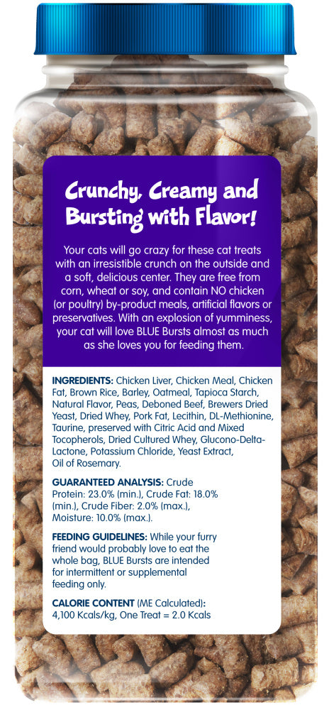 Shop / Unknown Type / Blue Buffalo Bursts Filled Chicken Liver & Beef Cat Treats Blue Buffalo Bursts Filled Chicken Liver & Beef Cat Treats Blue Buffalo Weight: 2 oz $1.69 2-oz Purchase Options Free In-Store Pick Up Not Available Save 10% on orders $49+ Set your store for inventory and store pickup details Zip Code Search Same-day Delivery* No minimum charge for delivery orders. *Order before 2pm and have it delivered today. Orders placed after 2pm will be delivered the next day. Must be inside delivery radius. Zip Code Unfortunately delivery is not available to this address. In order to ensure the best availability accuracy, changing your selected store will remove all items from your cart. You will need to re-add these items with your newly selected store if you choose to continue. Continue Cancel Ship it to Me Quantity Add To Cart Feeding guide disclaimer ✕ Feeding guides provide a starting point for the amount of food to give your pet each day. We recommend that you keep your pet in ideal body condition and not allow them to become overweight. The amount of food your pet needs can vary based on age, activity level or other food and treats given, so be sure to work with your veterinarian to determine an appropriate weight for your pet, and to make any necessary adjustments to their feeding. Information Treat your feline friend to an explosion of flavor and texture with BLUE Bursts. With a crunchy outer shell and a creamy center of mouthwatering chicken liver and beef, these deliriously delicious cat treats are made to keep your kitty purring for more just shake the bag and cats come running! And with real meat first and NO poultry by-product meals, these cat treats feature the ingredients youll feel good about giving.Why We Love It STARTS WITH REAL CHICKEN LIVER AND BEEF: Unlike many other brands, these crunchy cat treats feature real meat as the first ingredient to tempt your feline friend TWO TEMPTING TEXTURES: Give your cat the best of both worlds these cat treats feature a crunchy shell and a delicious creamy center cats cant resist HEALTHY CAT TREATS: BLUE Bursts treats for cats are packed with the healthy, wholesome ingredients youll feel good about giving About Blue BuffaloBLUE Buffalo's True Blue promise is the pillar of their business, straight to every customer; the finest natural ingredients, and no chicken/poultry by-product meals, corn, wheat, soy, artificial preservatives, colors or flavors. BLUE Buffalo is the only food made with unique Lifesource Bits; a precise blend of vitamins, minerals and antioxidants created by veterinarians and animal nutritionists. With recipes for all tastes and diets, including limited ingredient diets, high protein, grain-free, wholesome grains, and exotic proteins, BLUE Buffalo always starts with real meat, and ends with good health. Ingredients Chicken Liver, Chicken Meal, Chicken Fat, Brown Rice, Barley, Oatmeal, Tapioca Starch, Natural Flavor, Peas, Deboned Beef, Brewers Dried Yeast, Dried Whey, Pork Fat, Lecithin, DL-Methionine, Taurine, preserved with Citric Acid and Mixed Tocopherols, Dried Cultured Whey, Glucono-Delta-Lactone, Potassium Chloride, Yeast Extract, Oil of Rosemary. Guaranteed Analysis Nutrient Guaranteed Units Crude Protein 23% min Crude Fat 18% min Crude Fiber 2% max Moisture 10% max Customers also liked Customer Reviews