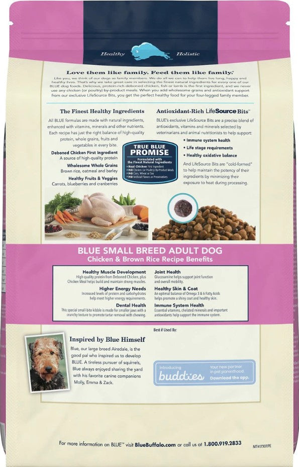 Shop / No Corn No Wheat No Soy / Blue Buffalo Life Protection Natural Chicken & Brown Rice Recipe Small Breed Adult Dry Dog Food Blue Buffalo Life Protection Natural Chicken & Brown Rice Recipe Small Breed Adult Dry Dog Food Blue Buffalo Weight: 15 lb $43.99 15-lb Purchase Options Free In-Store Pick Up Not Available Save 10% on orders $49+ Set your store for inventory and store pickup details Zip Code Search Same-day Delivery* No minimum charge for delivery orders. *Order before 2pm and have it delivered today. Orders placed after 2pm will be delivered the next day. Must be inside delivery radius. Zip Code Unfortunately delivery is not available to this address. In order to ensure the best availability accuracy, changing your selected store will remove all items from your cart. You will need to re-add these items with your newly selected store if you choose to continue. Continue Cancel Ship it to Me Quantity Add To Cart Feeding guide disclaimer ✕ Feeding guides provide a starting point for the amount of food to give your pet each day. We recommend that you keep your pet in ideal body condition and not allow them to become overweight. The amount of food your pet needs can vary based on age, activity level or other food and treats given, so be sure to work with your veterinarian to determine an appropriate weight for your pet, and to make any necessary adjustments to their feeding. Information To help support the special needs of smaller dogs, BLUE Life Protection Formula dog food for Small Breeds is made with increased protein and carbohydrates to meet higher energy needs. It contains the ingredients you’ll love feeding as much as they’ll love eating. BLUE Life Protection Formula dog food is a product of the Blue Buffalo company. Based in the United States, Blue Buffalo makes premium-quality pet foods featuring real meat, fruit and vegetables.Why We Love It REAL MEAT FIRST: Blue Buffalo foods always feature real meat as the first ingredient. High-quality protein from real chicken helps your dog build and maintain healthy muscles. Plus they contain wholesome whole grains, garden veggies and fruit. SMALL BREED DOG FOOD: Specially formulated for the wellness of adult small breed dogs, BLUE Life Protection® Formula Small Breed dry dog food contains increased levels of protein and carbohydrates to meet the energy needs of smaller dogs with a kibble size ideal for smaller jaws. WITH LIFESOURCE BITS®: This formula contains BLUE’s exclusive LifeSource Bits – a precise blend of antioxidants, vitamins and minerals carefully selected by holistic veterinarians and animal nutritionists, to support immune system health, life stage requirements, and a healthy oxidative balance. A NATURAL DOG FOOD: BLUE dog foods are made with the finest natural ingredients enhanced with vitamins and minerals. BLUE contains NO chicken (or poultry) by-product meals, corn, wheat, soy, artificial flavors or preservatives. About Blue BuffaloBLUE Buffalo's True Blue promise is the pillar of their business, straight to every customer; the finest natural ingredients, and no chicken/poultry by-product meals, corn, wheat, soy, artificial preservatives, colors or flavors. BLUE Buffalo is the only food made with unique Lifesource Bits; a precise blend of vitamins, minerals and antioxidants created by veterinarians and animal nutritionists. With recipes for all tastes and diets, including limited ingredient diets, high protein, grain-free, wholesome grains, and exotic proteins, BLUE Buffalo always starts with real meat, and ends with good health. Ingredients Deboned Chicken, Chicken Meal, Brown Rice, Oatmeal, Barley, Menhaden Fish Meal (source of Omega 3 Fatty Acids), Chicken Fat (preserved with Mixed Tocopherols), Flaxseed (source of Omega 6 Fatty Acids), Natural Flavor, Pea Starch, Dried Tomato Pomace, Peas, Pea Protein, Dried Egg Product, Salt, Potassium Chloride, Dehydrated Alfalfa Meal, Potatoes, Dried Chicory Root, Pea Fiber, Alfalfa Nutrient Concentrate, Calcium Carbonate, Choline Chloride, DL-Methionine, Preserved with Mixed Tocopherols, Sweet Potatoes, Carrots, Garlic, Zinc Amino Acid Chelate, Zinc Sulfate, Vegetable Juice for color, Ferrous Sulfate, Vitamin E Supplement, Iron Amino Acid Chelate, Blueberries, Cranberries, Barley Grass, Parsley, Turmeric, Dried Kelp, Yucca Schidigera Extract, Glucosamine Hydrochloride, Niacin (Vitamin B3), Calcium Pantothenate (Vitamin B5), L-Carnitine, L-Ascorbyl-2-Polyphosphate (source of Vitamin C), L-Lysine, Copper Sulfate, Biotin (Vitamin B7), Vitamin A Supplement, Copper Amino Acid Chelate, Manganese Sulfate, Taurine, Manganese Amino Acid Chelate, Thiamine Mononitrate (Vitamin B1), Riboflavin (Vitamin B2), Vitamin D3 Supplement, Vitamin B12 Supplement, Pyridoxine Hydrochloride (Vitamin B6), Calcium Iodate, Dried Yeast, Dried Enterococcus faecium fermentation product, Dried Lactobacillus acidophilus fermentation product, Dried Aspergillus niger fermentation extract, Dried Trichoderma longibrachiatum fermentation extract, Dried Bacillus subtilis fermentation extract, Folic Acid (Vitamin B9), Sodium Selenite, Oil of Rosemary Guaranteed Analysis Nutrient Guaranteed Units Crude Protein 26% min Crude Fat 15% min Crude Fiber 4% max Moisture 10% max Calcium 1.2% min Phosphorus .9% min Omega-3 Fatty Acids .5% min Omega-6 Fatty Acids 3% min Glucosamine 400 mg/kg min Customers also liked Customer Reviews