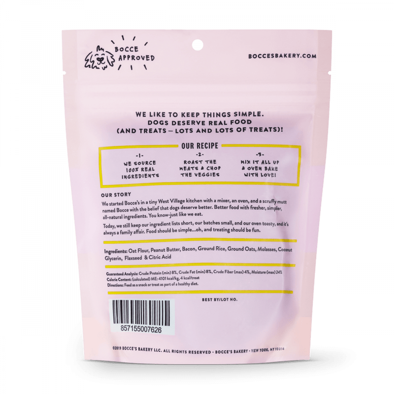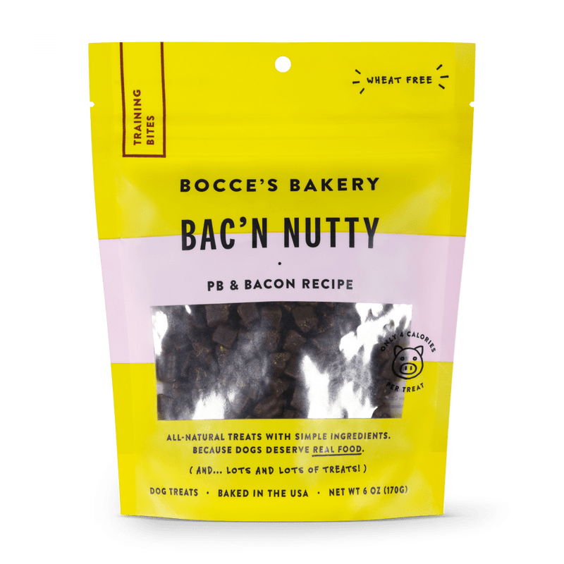 Shop / Unknown Type / Bocce's Bakery Every Day Bac'n Nutty Training Bites Dog Treats Bocce's Bakery Every Day Bac'n Nutty Training Bites Dog Treats Bocces Bakery Weight: 6 oz $7.99 6-oz Purchase Options Free In-Store Pick Up Not Available Save 10% on orders $49+ Set your store for inventory and store pickup details Zip Code Search Same-day Delivery* No minimum charge for delivery orders. *Order before 2pm and have it delivered today. Orders placed after 2pm will be delivered the next day. Must be inside delivery radius. Zip Code Unfortunately delivery is not available to this address. In order to ensure the best availability accuracy, changing your selected store will remove all items from your cart. You will need to re-add these items with your newly selected store if you choose to continue. Continue Cancel Ship it to Me Quantity Add To Cart Feeding guide disclaimer ✕ Feeding guides provide a starting point for the amount of food to give your pet each day. We recommend that you keep your pet in ideal body condition and not allow them to become overweight. The amount of food your pet needs can vary based on age, activity level or other food and treats given, so be sure to work with your veterinarian to determine an appropriate weight for your pet, and to make any necessary adjustments to their feeding. Information Perfectly sized training bites to reward all those sitting pups, those instagram posing mutts, and the slightly naughtier puppies who need a little daily bribing. Why We Love It Wheat-Free 100% Real Ingredients Baked in the USA About Bocce's BakeryBocce is a 5 year old mutt with one scruffy hairdo and a tail that won’t stop wagging! At a doctor’s checkup, Bocce’s was told that he was carrying a few extra pounds. Oh my! So I started looking into what he was eating. I was shocked with the amount of preservatives, and ingredients that I had never heard of in his food ...and treats. We decided to make a change. I combined my love of cooking using organic, seasonal ingredients, with Bocce’s love of biscuits. And Bocce’s Bakery was born! We’ve come up with all-natural biscuits, in delectable flavors, all doggies are sure to love. Still baked by hand, in small batches, with the freshest ingredients we can find. We hope you enjoy our treats. Andrea & Bocce PS: Oh...and Bocce is now at his ideal weight, but we have yet to find a cure for his frizzy hair! Ingredients Oat Flour, Peanut Butter, Bacon, Ground Rice, Ground Oats, Molasses, Coconut Glycerin, Flaxseed, Citric Acid..that's it! Guaranteed Analysis Nutrient Guaranteed Units Crude Protein 9% min Crude Fat 6% min Crude Fiber 4% max Crude Moisture 24% max Customers also liked Customer Reviews