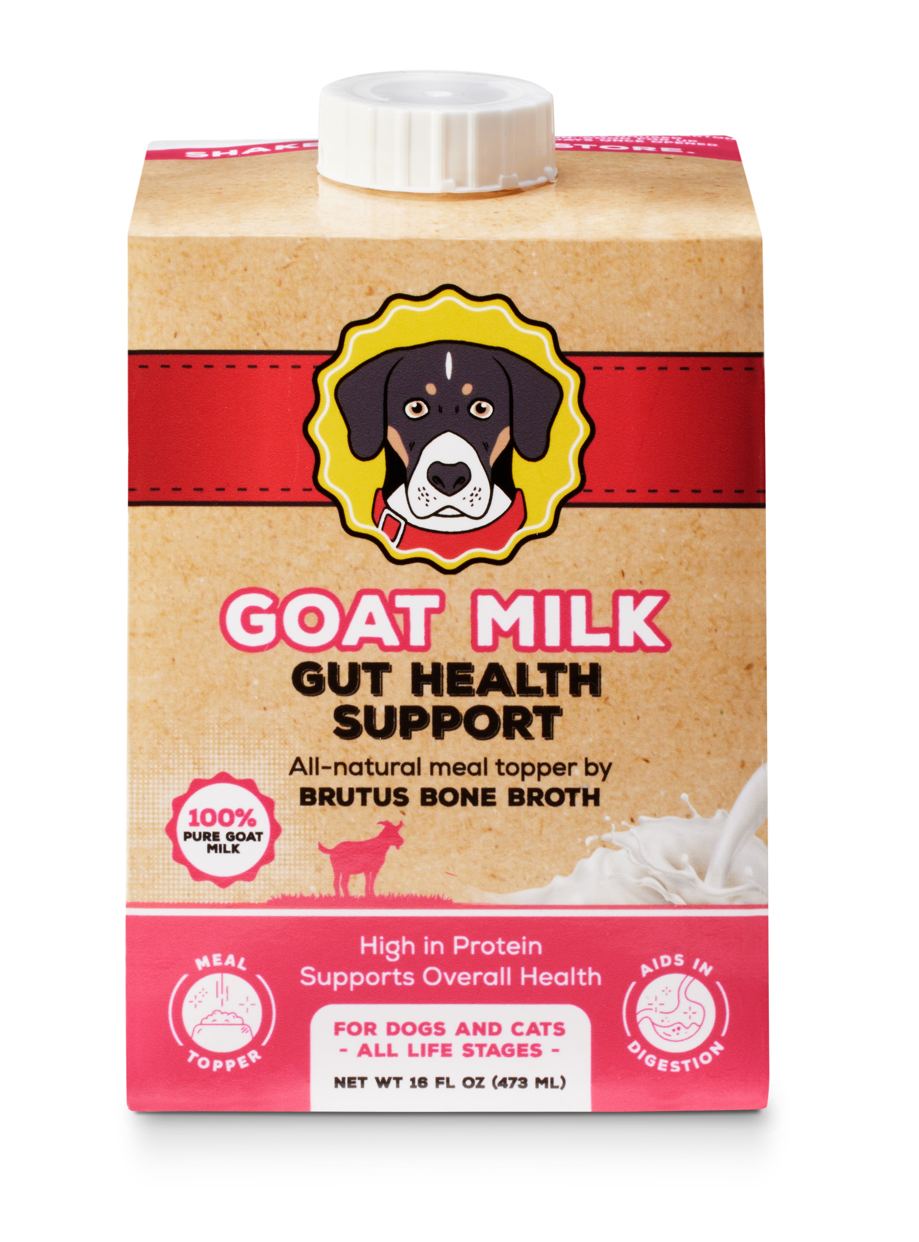 Shop / Unknown Type / Brutus Broth Goat Milk Food Topper 16oz Brutus Broth Goat Milk Food Topper 16oz Brutus Broth SKU: 2516959 16oz $7.99 16oz Purchase Options Free In-Store Pick Up Not Available Save 10% on orders $49+ Set your store for inventory and store pickup details Zip Code Search Same-day Delivery* No minimum charge for delivery orders. *Order before 2pm and have it delivered today. Orders placed after 2pm will be delivered the next day. Must be inside delivery radius. Zip Code Unfortunately delivery is not available to this address. In order to ensure the best availability accuracy, changing your selected store will remove all items from your cart. You will need to re-add these items with your newly selected store if you choose to continue. Continue Cancel Ship it to Me Quantity Add To Cart Feeding guide disclaimer ✕ Feeding guides provide a starting point for the amount of food to give your pet each day. We recommend that you keep your pet in ideal body condition and not allow them to become overweight. The amount of food your pet needs can vary based on age, activity level or other food and treats given, so be sure to work with your veterinarian to determine an appropriate weight for your pet, and to make any necessary adjustments to their feeding. Information Ultra-nutritious. Ultra-digestible. Ultra-delicious. Goat Milk by Brutus Broth is a nutrient-dense, naturally hydrating, and creamy superfood designed to support digestion, hydration, and overall wellness for both dogs and cats. Made from 100% pure goat milk, it’s easy to digest, low in lactose, and perfect for picky eaters or pets needing an extra nutritional boost. Use as a meal topper, daily treat, hydrating snack, or enrichment pour-over—no refrigeration needed until opened. Why Pet Parents Love It 100% pure goat milk — nothing added Natural enzymes & probiotics for gut + digestive support Low in lactose — gentle on sensitive stomachs Great for dogs & cats of all ages Boosts hydration & meal appeal First shelf-stable goat milk — convenient & easy to store Perfect meal topper or daily treat Ingredients Goat Milk GUARANTEED ANALYSIS Crude Protein 3.3% min, Crude Fat 3.4% min,Crude Fiber 0.0% max, Moisture 82.5% max. Customers also liked Customer Reviews