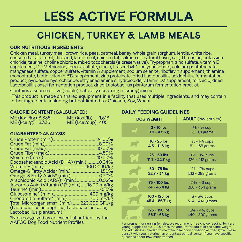 Shop / Weight Control / Canidae Platinum Formula for Less Active & Senior Dogs Dry Dog Food Canidae Platinum Formula for Less Active & Senior Dogs Dry Dog Food Canidae Weight: 15 lb $39.99 15-lb Purchase Options Free In-Store Pick Up Not Available Save 10% on orders $49+ Set your store for inventory and store pickup details Zip Code Search Same-day Delivery* No minimum charge for delivery orders. *Order before 2pm and have it delivered today. Orders placed after 2pm will be delivered the next day. Must be inside delivery radius. Zip Code Unfortunately delivery is not available to this address. In order to ensure the best availability accuracy, changing your selected store will remove all items from your cart. You will need to re-add these items with your newly selected store if you choose to continue. Continue Cancel Ship it to Me Quantity Add To Cart Feeding guide disclaimer ✕ Feeding guides provide a starting point for the amount of food to give your pet each day. We recommend that you keep your pet in ideal body condition and not allow them to become overweight. The amount of food your pet needs can vary based on age, activity level or other food and treats given, so be sure to work with your veterinarian to determine an appropriate weight for your pet, and to make any necessary adjustments to their feeding. Information With the needs of senior dogs as well as less active adults in mind, All Life Stages Less Active Dry Dog Food: Chicken, Turkey, & Lamb Meal provides optimal nutrition with lower fat to help maintain a healthy weight. Probiotics have been added to help with digestion as well as omegas for added skin and coat care! Canidae Platinum Formula for Less Active & Senior Dogs Dry Dog Food is made with high quality ingredients with no corn, wheat, soy, or by-products!Why We Love It Lower fat food for seniors and less active adults! No corn, wheat, soy, or by-products! Made in the USA About CanidaeCANIDAE® has been making great foods for our pets and yours since 1996. Working with farmers and suppliers for the best ingredients, establishing our Texas cookery, and taking the first steps at CANIDAE® Farms toward getting involved in the growing of some of the ingredients we use are all important parts of our commitment to pets and their people. CANIDAE® remains an independently owned brand pet lovers can trust to provide innovative and authentic foods for the beloved dogs and cats that enrich our lives in so many ways. Try one of our 5-star rated, top reviewed pet food brands today! Ingredients Chicken meal, brown rice, white rice, rice bran, peas, potatoes, oatmeal, cracked pearled barley, millet, turkey meal, lamb meal, chicken fat, tomato pomace, natural flavor, flaxseed, oceanfish meal, salmon oil, choline chloride, salt, potassium chloride, suncured alfalfa, inulin (from chicory root), lecithin, sage extract, cranberries, beta-carotene, rosemary extract, sunflower oil, yucca schidigera extract, dried enterococcus faecium fermentation product, dried lactobacillus acidophilus fermentation product, dried lactobacillus casei fermentation product, dried lactobacillus plantarum fermentation product, dried trichoderma longibrachiatum fermentation extract, vitamins (vitamin E supplement, thiamine mononitrate, ascorbic acid, vitamin A supplement, biotin, niacin, calcium pantothenate, pyridoxine hydrochloride (vitamin B6), vitamin B12 supplement, riboflavin, vitamin D3 supplement, folic acid), minerals (iron proteinate, zinc proteinate, copper proteinate, ferrous sulfate, zinc sulfate, copper sulfate, potassium iodide, manganese proteinate, manganous oxide, manganese sulfate, sodium selenite), mixed tocopherols (a preservative), papaya, pineapple. Contains a source of live naturally occurring microorganisms. Guaranteed Analysis Nutrient Guaranteed Units Crude Protein 24.0% min Crude Fat 8% min Crude Fiber 4.50% max Moisture 10.0% max Vitamin E 100 IU/kg min Alpha Linolenic Acid (Omega 3) 0.7% min Glucosamine Hcl 400 mg/kg min Chondroitin Sulfate 700 mg/kg min Ascorbic Acid (Vitamin C) 15 mg/kg min Customers also liked Customer Reviews