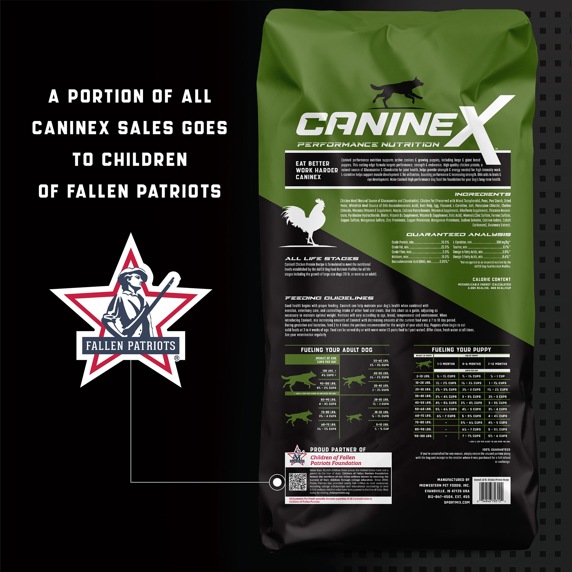 Shop / Unknown Type / CanineX Chicken Protein Grain-Free Dry Dog Food 40 lb CanineX Chicken Protein Grain-Free Dry Dog Food 40 lb CanineX 40lb $56.99 40lb Purchase Options Free In-Store Pick Up Not Available Save 10% on orders $49+ Set your store for inventory and store pickup details Zip Code Search Same-day Delivery* No minimum charge for delivery orders. *Order before 2pm and have it delivered today. Orders placed after 2pm will be delivered the next day. Must be inside delivery radius. Zip Code Unfortunately delivery is not available to this address. In order to ensure the best availability accuracy, changing your selected store will remove all items from your cart. You will need to re-add these items with your newly selected store if you choose to continue. Continue Cancel Ship it to Me Quantity Add To Cart Feeding guide disclaimer ✕ Feeding guides provide a starting point for the amount of food to give your pet each day. We recommend that you keep your pet in ideal body condition and not allow them to become overweight. The amount of food your pet needs can vary based on age, activity level or other food and treats given, so be sure to work with your veterinarian to determine an appropriate weight for your pet, and to make any necessary adjustments to their feeding. Information Give your active canine companion the fuel he needs with SPORTMiX’s CanineX Dry Dog Food. This recipe is specially formulated to give dogs the long-lasting energy, strength and mental focus they need to carry out their daily dog duties. This protein-rich recipe is crafted with chicken meal, egg and nutrient-rich fruits and vegetables like peas, blueberries, cranberries, spinach and carrots to support healthy digestion. Infused with L-carnitine—an amino acid that helps support lean muscle mass, healthy brain function and a healthy immune system. CanineX is also grain-free, gluten-free and made without corn, wheat, soy or by-products for a meal you can feel good about feeding your pup. Ingredients Ingredients: Chicken Meal (Natural Source of Glucosamine and Chondroitin), Chicken Fat (Preserved with Mixed Tocopherols), Peas, Pea Starch, Whitefish Meal (source of DHA-Docosahexaenoic Acid), Dried Yeast, Flaxseed, Dried Egg, Dried Beet Pulp, L-carnitine, Taurine, Salt, Potassium Chloride, Choline Chloride, Vitamins (Vitamin E Supplement, Niacin, Calcium Pantothenate, Vitamin A Supplement, Riboflavin Supplement, Thiamine Mononitrate, Pyridoxine Hydrochloride, Biotin, Vitamin B12 Supplement, Vitamin D3 Supplement, Folic Acid), Minerals (Zinc Sulfate, Ferrous Sulfate, Copper Sulfate, Manganese Sulfate, Zinc Proteinate, Copper Proteinate, Manganese Proteinate, Sodium Selenite, Calcium Iodate, Cobalt Carbonate), Rosemary Extract. Guaranteed Analysis Guaranteed Analysis: Crude Protein, minimum 30.0%, Crude Fat, minimum 22.0%, Crude Fiber, maximum 5.0%, Moisture, maximum 10.0%, Docosahexaenoic Acid (DHA), minimum0.05%, L-Carnitine, minimum 300 mg/kg, Taurine, minimum 0.1%, Omega-6 Fatty Acids, minimum 3.0%, Omega-3 Fatty Acids, minimum 0.6% Customers also liked Customer Reviews