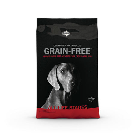 Shop / Unknown Type / Diamond Naturals Grain-Free Pasture-Raised Beef & Sweet Potato Dry Dog Food Formula Diamond Naturals Grain-Free Pasture-Raised Beef & Sweet Potato Dry Dog Food Formula Diamond $15.99 5lb 14lb 5lb 14lb Purchase Options Free In-Store Pick Up Not Available Save 10% on orders $49+ Set your store for inventory and store pickup details Zip Code Search Same-day Delivery* No minimum charge for delivery orders. *Order before 2pm and have it delivered today. Orders placed after 2pm will be delivered the next day. Must be inside delivery radius. Zip Code Unfortunately delivery is not available to this address. In order to ensure the best availability accuracy, changing your selected store will remove all items from your cart. You will need to re-add these items with your newly selected store if you choose to continue. Continue Cancel Ship it to Me Quantity Add To Cart Feeding guide disclaimer ✕ Feeding guides provide a starting point for the amount of food to give your pet each day. We recommend that you keep your pet in ideal body condition and not allow them to become overweight. The amount of food your pet needs can vary based on age, activity level or other food and treats given, so be sure to work with your veterinarian to determine an appropriate weight for your pet, and to make any necessary adjustments to their feeding. Information A protein-based diet free of grains most closely mimics a dog's ancestral diet. That's why the first ingredient in this Diamond Naturals Grain-Free formula is real meat for great taste and nutrition. Sweet potatoes provide complex carbohydrates for all-day energy, while vegetables and fruits add powerful antioxidants for health and vitality. Ingredients Beef, lamb meal, sweet potatoes, peas, lentils, pea flour, canola oil (preserved with mixed tocopherols), tomato pomace, fish meal, natural flavor, flaxseed, salmon oil (source of DHA), salt, DL-Methionine, choline chloride, taurine, dried chicory root, yucca schidigera extract, tomatoes, blueberries, raspberries, dried Lactobacillus plantarum fermentation product, dried Bacillus subtilis fermentation product, dried Lactobacillus acidophilus fermentation product, dried Enterococcus faecium fermentation product, dried Bifidobacterium animalis fermentation product, vitamin E supplement, iron proteinate, zinc proteinate, copper proteinate, ferrous sulfate, zinc sulfate, manganese sulfate, copper sulfate, potassium iodide, thiamine mononitrate, manganese proteinate, ascorbic acid, vitamin A supplement, biotin, niacin, calcium pantothenate, sodium selenite, pyridoxine hydrochloride, vitamin B12 supplement, riboflavin, vitamin D3 supplement, folic acid.Contains a source of live (viable), naturally occurring microorganisms. Guaranteed Analysis Crude Protein 24% MinimumCrude Fat 14% MinimumCrude Fiber 5% MaximumMoisture 10% MaximumDHA (Docosahexaenoic Acid) 0.05% MinimumZinc 150 mg/kg MinimumSelenium 0.35 mg/kg MinimumVitamin E 150 IU/kg MinimumTaurine* 0.12% MinimumOmega-6 Fatty Acids* 2.4% MinimumOmega-3 Fatty Acids* 0.3% MinimumTotal Microorganisms* Not Less Than 80,000,000 CFU/lb(Lactobacillus plantarum, Bacillus subtilis, Lactobacillus acidophilus, Enterococcus faecium, Bifidobacterium animalis)*Not recognized as an essential nutrient by the AAFCO Dog Food Nutrient Profiles." Customers also liked Customer Reviews
