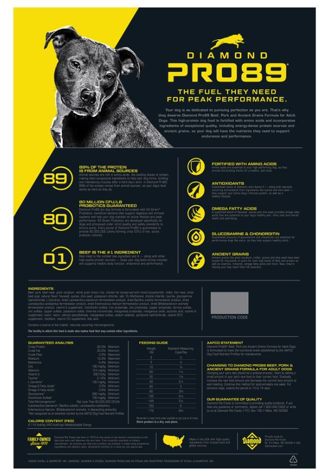 Shop / Dog Food / Diamond Pro89 Beef, Pork, & Ancient Grains Formula Adult Dry Dog Food Diamond Pro89 Beef, Pork, & Ancient Grains Formula Adult Dry Dog Food Diamond Weight: 40 lb $59.99 40-lb Purchase Options Free In-Store Pick Up Not Available Save 10% on orders $49+ Set your store for inventory and store pickup details Zip Code Search Same-day Delivery* No minimum charge for delivery orders. *Order before 2pm and have it delivered today. Orders placed after 2pm will be delivered the next day. Must be inside delivery radius. Zip Code Unfortunately delivery is not available to this address. In order to ensure the best availability accuracy, changing your selected store will remove all items from your cart. You will need to re-add these items with your newly selected store if you choose to continue. Continue Cancel Ship it to Me Quantity Add To Cart Feeding guide disclaimer ✕ Feeding guides provide a starting point for the amount of food to give your pet each day. We recommend that you keep your pet in ideal body condition and not allow them to become overweight. The amount of food your pet needs can vary based on age, activity level or other food and treats given, so be sure to work with your veterinarian to determine an appropriate weight for your pet, and to make any necessary adjustments to their feeding. Information Your dog is dedicated to pursuing perfection as you are. That's why they deserve Diamond Pro89 Beef, Pork and Ancient Grains Formula for Adult Dogs. This high-protein dog food is fortified with amino acids and incorporates ingredients of exceptional quality, including energy-dense protein sources and ancient grains, so your dog will have the nutrients they need to support endurance and performance. Ingredients Beef, pork, beef meal, grain sorghum, whole grain brown rice, chicken fat (preserved with mixed tocopherols), millet, fish meal, dried beet pulp, natural flavor, flaxseed, quinoa, chia seed, potassium chloride, salt, DL-Methionine, choline chloride, taurine, glucosamine hydrochloride, L-Carnitine, dried Lactobacillus plantarum fermentation product, dried Bacillus subtilis fermentation product, dried Lactobacillus acidophilus fermentation product, dried Enterococcus faecium fermentation product, dried Bifidobacterium animalis fermentation product, vitamin E supplement, chondroitin sulfate, iron proteinate, zinc proteinate, copper proteinate, ferrous sulfate, zinc sulfate, copper sulfate, potassium iodide, thiamine mononitrate, manganese proteinate, manganous oxide, ascorbic acid, vitamin A supplement, biotin, niacin, calcium pantothenate, manganese sulfate, sodium selenite, pyridoxine hydrochloride, vitamin B12 supplement, riboflavin, vitamin D3 supplement, folic acid. Contains a source of live (viable), naturally occurring microorganisms. The facility in which this food is made also makes food that may contain other ingredients. Guaranteed Analysis Nutrient Guaranteed Units Crude Protein 30% min Crude Fat 20% min Crude Fiber 2.2% max Moisture 10% max Zinc 180 mg/kg min Methionine 0.4% Min Customers also liked Customer Reviews