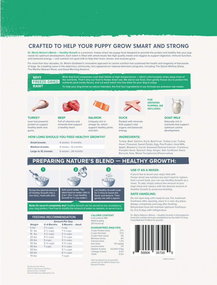 Shop / Unknown Type / Dr. Marty Nature's Blend for Puppies Freeze Dried Raw Dog Food Dr. Marty Nature's Blend for Puppies Freeze Dried Raw Dog Food Dr. Marty $14.99 Save $3Discount will apply in cart 6 oz 16 oz 6-oz 16-oz Purchase Options Free In-Store Pick Up Not Available Save 10% on orders $49+ Set your store for inventory and store pickup details Zip Code Search Same-day Delivery* No minimum charge for delivery orders. *Order before 2pm and have it delivered today. Orders placed after 2pm will be delivered the next day. Must be inside delivery radius. Zip Code Unfortunately delivery is not available to this address. In order to ensure the best availability accuracy, changing your selected store will remove all items from your cart. You will need to re-add these items with your newly selected store if you choose to continue. Continue Cancel Ship it to Me Quantity Add To Cart Feeding guide disclaimer ✕ Feeding guides provide a starting point for the amount of food to give your pet each day. We recommend that you keep your pet in ideal body condition and not allow them to become overweight. The amount of food your pet needs can vary based on age, activity level or other food and treats given, so be sure to work with your veterinarian to determine an appropriate weight for your pet, and to make any necessary adjustments to their feeding. Information Dr. Marty Nature's Blend is a premium, freeze-dried raw dog food formulated to support the health, happiness, and longevity of all adult dogs Unlike kibble cooked at high heat, Dr. Marty's freeze dried raw dog food locks in nutrients without harmful AGEs. No fillers, artificial preservatives, or synthetic additives—just pure, complete nutrition in every bite Zero artificial preservatives, additives, fillers or synthetic ingredients Use it as a mixer- If you'd like to boost your dog's diet with freeze-dried raw nutrition but don't want to replace their current food, you can use Nature's Blend as a mixer. Simply reduce the amount of Nature's Blend to avoid overfeeding Dr. Marty's freeze dried raw dog food is made in an FDA-audited, BRC-certified facility using HPP to eliminate pathogens. Each lot is tested for E.coli, Listeria, and Salmonella before release by our Quality Team Ingredients Turkey, Beef, Salmon, Duck, Beef Liver, Turkey Liver, Turkey Heart, Flaxseed, Sweet Potato, Egg, Pea Protein, Goat Milk, Apple, Blueberry, Carrot, Seaweed Derived Calcium, Cranberry, Pumpkin Seed, Spinach, Kelp, Ginger, Salt, Sunflower Seed, Broccoli, Kale, Mixed Tocopherols Guaranteed Analysis Nutrient Guaranteed Units Crude Protein 37% min Crude Fat 27% min Crude Fiber 4% max Moisture 6% max Customers also liked Customer Reviews