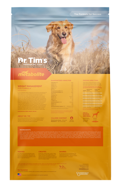 Shop / Dry Food / Dr. Tim's Metabolite Weight Management Formula Dry Dog Food Dr. Tim's Metabolite Weight Management Formula Dry Dog Food Dr. Tim's $47.99 Sorry, this product is currently out of stock. Feeding guide disclaimer ✕ Feeding guides provide a starting point for the amount of food to give your pet each day. We recommend that you keep your pet in ideal body condition and not allow them to become overweight. The amount of food your pet needs can vary based on age, activity level or other food and treats given, so be sure to work with your veterinarian to determine an appropriate weight for your pet, and to make any necessary adjustments to their feeding. Information Dr. Tim’s Metabolite Weight Management Formula uses a novel approach to taking weight off your dog by rethinking the process and turning it into a win/win lifestyle for your pet AND you. Our high levels of protein, complimentary fiber structure and moderate fat content work in tandem with your pet’s natural metabolism to support weight loss. Our formula acts as a lock and key, opening one metabolic route after another to ensure your dog is optimizing their natural ability to burn calories, and also ensures you won’t give up due to excessive begging. Metabolite incorporates all angles of the weight loss process, from the molecular structure of the ingredients to the psychology of the pet owner, to build and maintain your dog’s healthy weight while understanding the behavioral difficulties of an overweight dog who’s always hungry. Metabolite is made without corn, wheat or soy for the sensitive dog. Metabolite Weight Management Dog Food has been formulated through the combined efforts of a Ph.D. canine nutritionist and a practicing small animal veterinarian experienced in competitive dog sports. Ingredients Chicken meal, brown rice, whole oat groats, dried field peas, powdered cellulose, dried plain beet pulp (sugar removed), salmon meal, chicken fat (preserved with mixed natural tocopherols, a source of vitamin E), dried egg product, dried porcine plasma, chicken liver meal, whole ground flaxseed meal, calcium carbonate, dried carrots, dried celery, dried beets, dried parsley, dried lettuce, dried watercress, dried spinach, salt, menhaden fish oil (preserved with mixed natural tocopherols, a source of vitamin E), lecithin (sunflower derived), dried chicory root (source of inulin), DL-Methionine, dried Bacillus coagulans fermentation product, choline chloride, L-Lysine, dried kelp, potassium chloride, yucca schidigera extract, psyllium seed husk, L-ascorbyl-2-polyphosphate (source of vitamin C), calcium carbonate, zinc proteinate, manganese proteinate, copper proteinate, zinc sulfate, vitamin E supplement, ferrous sulfate, niacin supplement, copper sulfate, thiamine mononitrate, d-calcium pantothenate, vitamin A supplement, manganous oxide, pyridoxine hydrochloride, sodium selenite, riboflavin supplement, vitamin D3 supplement, biotin, vitamin B12 supplement, calcium iodate, L-carnitine, folic acid Guaranteed Analysis Nutrient Guaranteed Units Crude Protein 30.0% min Crude Fat 8.0% min Crude Fat 10.0% max Moisture 10% max Ash 7% max Calcium 1% min Phosphorus .8% min DHA .08% min EPA .07% min Selenium 0.35 mg/kg min Vitamin E 250 IU/kg min Ascorbic Acid (Vitamin C) 200 mg/kg min Omega-6 Fatty Acids 1.75% min Omega-3 Fatty Acids .35% min Bacillus Coagulans 80,000,000 min Customers also liked Customer Reviews