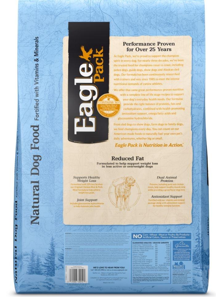 Shop / No Corn No Wheat No Soy / Eagle Pack Natural Reduced Fat Formula Dry Dog Food Eagle Pack Natural Reduced Fat Formula Dry Dog Food Eagle Pack Weight: 30 lb $73.99 30-lb Purchase Options Free In-Store Pick Up Not Available Save 10% on orders $49+ Set your store for inventory and store pickup details Zip Code Search Same-day Delivery* No minimum charge for delivery orders. *Order before 2pm and have it delivered today. Orders placed after 2pm will be delivered the next day. Must be inside delivery radius. Zip Code Unfortunately delivery is not available to this address. In order to ensure the best availability accuracy, changing your selected store will remove all items from your cart. You will need to re-add these items with your newly selected store if you choose to continue. Continue Cancel Ship it to Me Quantity Add To Cart Feeding guide disclaimer ✕ Feeding guides provide a starting point for the amount of food to give your pet each day. We recommend that you keep your pet in ideal body condition and not allow them to become overweight. The amount of food your pet needs can vary based on age, activity level or other food and treats given, so be sure to work with your veterinarian to determine an appropriate weight for your pet, and to make any necessary adjustments to their feeding. Information Our foods deliver the right balance of proteins, fats, carbohydrates, antioxidants and omega fatty acids for results you can see – shiny coat, bright eyes, good digestion and energetic spirit. Over the years, our formulas have been performance-proven with indoor sun loungers, neighborhood prowlers and outdoor butterfly chasers. You too can count on our American-made foods to naturally fuel your pet's daily adventures, both big and small. Eagle Pack is Nutrition in Action.™ Ingredients Pork Meal, Dehulled Barley, Peas, Ground Brown Rice, Oatmeal, Rice, Tomato Pomace, Chicken Meal, Turkey Meal, Flaxseed, Chicken Fat (preserved with Mixed Tocopherols), Brewers Dried Yeast, Potassium Chloride, Inulin, Vitamins [Vitamin E Supplement, Niacin, Vitamin A Supplement, Ascorbic Acid (Vitamin C), Thiamine Mononitrate, d-Calcium Pantothenate, Pyridoxine Hydrochloride, Riboflavin, Vitamin D3 Supplement, Biotin, Vitamin B12 Supplement, Folic Acid], Minerals [Zinc Proteinate, Zinc Sulfate, Iron Proteinate, Ferrous Sulfate, Copper Sulfate, Copper Proteinate, Manganese Proteinate, Manganese Sulfate, Sodium Selenite, Calcium Iodate], Taurine, Calcium Carbonate, Mixed Tocopherols added to preserve freshness, Glucosamine Hydrochloride, Dried Enterococcus faecium Fermentation Product, Dried Bacillus licheniformis Fermentation Product, Dried Bacillus subtilis Fermentation Product, Dried Aspergillus oryzae Fermentation Product, Dried Trichoderma reesei Fermentation Product, Dried Rhizopus oryzae Fermentation Product, Dried Lactobacillus acidophilus Fermentation Product, Dried Lactobacillus casei Fermentation Product, Rosemary Extract, Green Tea Extract. Guaranteed Analysis Nutrient Guaranteed Units Crude Protein 24.0% min Crude Fat 6.0% min Crude Fat 9.0% max Crude Fiber 4.0% max Moisture 10.0% max Calcium 1.5% min Phosphorus 1.0% min Vitamin E 120 IU/kg min Omega-6 Fatty Acids 1.4% min Omega-3 Fatty Acids 0.35% min Lactic Acid Microorganisms 70,000,000 CFU/lb Glucosamine 320 mg/kg min Customers also liked Customer Reviews