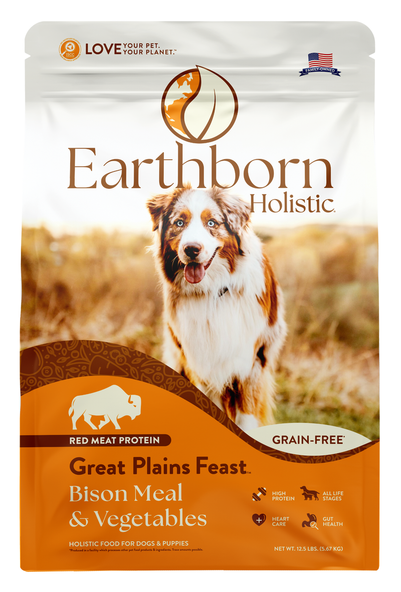 Earthborn Holistic Great Plains Feast is a high-quality dog food with bison and beef meal proteins and a mix of wholesome fruits and veggies. Enriched with Taurine for heart health and vitamins and minerals for optimal nutrition, this grain- and gluten-free recipe is a tasty option for your dog or puppy.