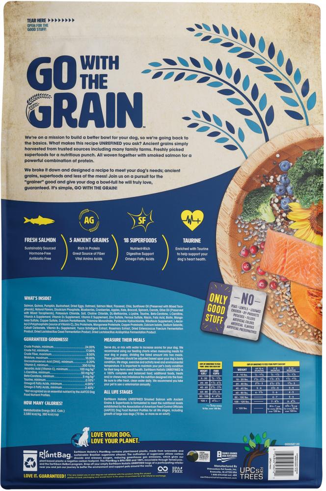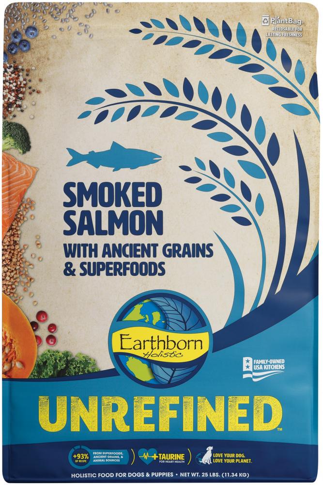Shop / Dog Food / Earthborn Holistic Unrefined Smoked Salmon with Ancient Grains & Superfoods Dry Dog Food Earthborn Holistic Unrefined Smoked Salmon with Ancient Grains & Superfoods Dry Dog Food Earthborn Holistic Weight: 25 lb $65.99 25-lb Purchase Options Free In-Store Pick Up Not Available Save 10% on orders $49+ Set your store for inventory and store pickup details Zip Code Search Same-day Delivery* No minimum charge for delivery orders. *Order before 2pm and have it delivered today. Orders placed after 2pm will be delivered the next day. Must be inside delivery radius. Zip Code Unfortunately delivery is not available to this address. In order to ensure the best availability accuracy, changing your selected store will remove all items from your cart. You will need to re-add these items with your newly selected store if you choose to continue. Continue Cancel Ship it to Me Quantity Add To Cart Feeding guide disclaimer ✕ Feeding guides provide a starting point for the amount of food to give your pet each day. We recommend that you keep your pet in ideal body condition and not allow them to become overweight. The amount of food your pet needs can vary based on age, activity level or other food and treats given, so be sure to work with your veterinarian to determine an appropriate weight for your pet, and to make any necessary adjustments to their feeding. Information We broke it down and designed a recipe to meet your dog’s needs; ancient grains, superfoods, sustainably caught salmon and less of the mess! Join us on a pursuit for the “grainer” good and give your dog a bowl-full they will truly love, guaranteed. It’s simple, GO WITH THE GRAIN!Why We Love It Fresh salmon that has been sustainably-sourced, hormone-free and antibiotic-free 5 ancient grains that are rich in protein, great sources of fiber, and contain vital amino acids 18 superfoods that are nutrient rich, provide digestive support and have omega fatty acids. About Earthborn HolisticPets are a part of your family, just as they are a part of ours. That’s why it’s important to make sure you are feeding a recipe that’s delicious, nutritious and safe. Learn why Earthborn Holistic is a great choice for your furry family. Our products are subject to rigorous testing in independent laboratories to ensure quality nutrition and safety. In our long history, Midwestern Pet Foods has an unblemished safety record, never having a product recall. With the health and safety of your pet in mind, we only choose sources we can trust. All products and ingredients are of the highest quality, naturally preserved and ethoxyquin-free. Ingredients Salmon, Quinoa, Pumpkin, Buckwheat, Dried Eggs, Oatmeal, Salmon Meal, Flaxseed, Chia, Sunflower Oil (Preserved with Mixed Tocopherols), Natural Flavors, Dicalcium Phosphate, Blueberries, Cranberries, Apples, Kale, Broccoli, Spinach, Carrots, Olive Oil (Preserved with Mixed Tocopherols), Potassium Chloride, Salt, Choline Chloride, DL-Methionine, L-Lysine, Taurine, Beta-Carotene, L-Carnitine, Vitamin A Supplement, Vitamin D3 Supplement, Vitamin E Supplement, Zinc Sulfate, Ferrous Sulfate, Niacin, Folic Acid, Biotin, Manganese Sulfate, Copper Sulfate, Calcium Pantothenate, Thiamine Mononitrate, Pyridoxine Hydrochloride, Riboflavin Supplement, L-Ascorbyl-2-Polyphosphate (source of Vitamin C), Zinc Proteinate, Manganese Proteinate, Copper Proteinate, Calcium Iodate, Sodium Selenite, Cobalt Carbonate, Vitamin B12 Supplement, Yucca Schidigera Extract, Rosemary Extract, Dried Enterococcus Faecium Fermentation Product, Dried Lactobacillus Casei Fermentation Product, Dried Lactobacillus Acidophilus Fermentation Product. Guaranteed Analysis Nutrient Guaranteed Units Crude Protein 24% min Crude Fat 17% min Crude Fiber 9.50% max Moisture 10% max DHA 0.20% min Vitamin E 300 IU/kg min Ascorbic Acid (Vitamin C) 100 mg/kg min L-Carnitine 50 mg/kg min Beta-Carotene 5 mg/kg min Taurine 0.10% min Omega-6 Fatty Acids 4% min Omega-3 Fatty Acids 2% min Customers also liked Customer Reviews