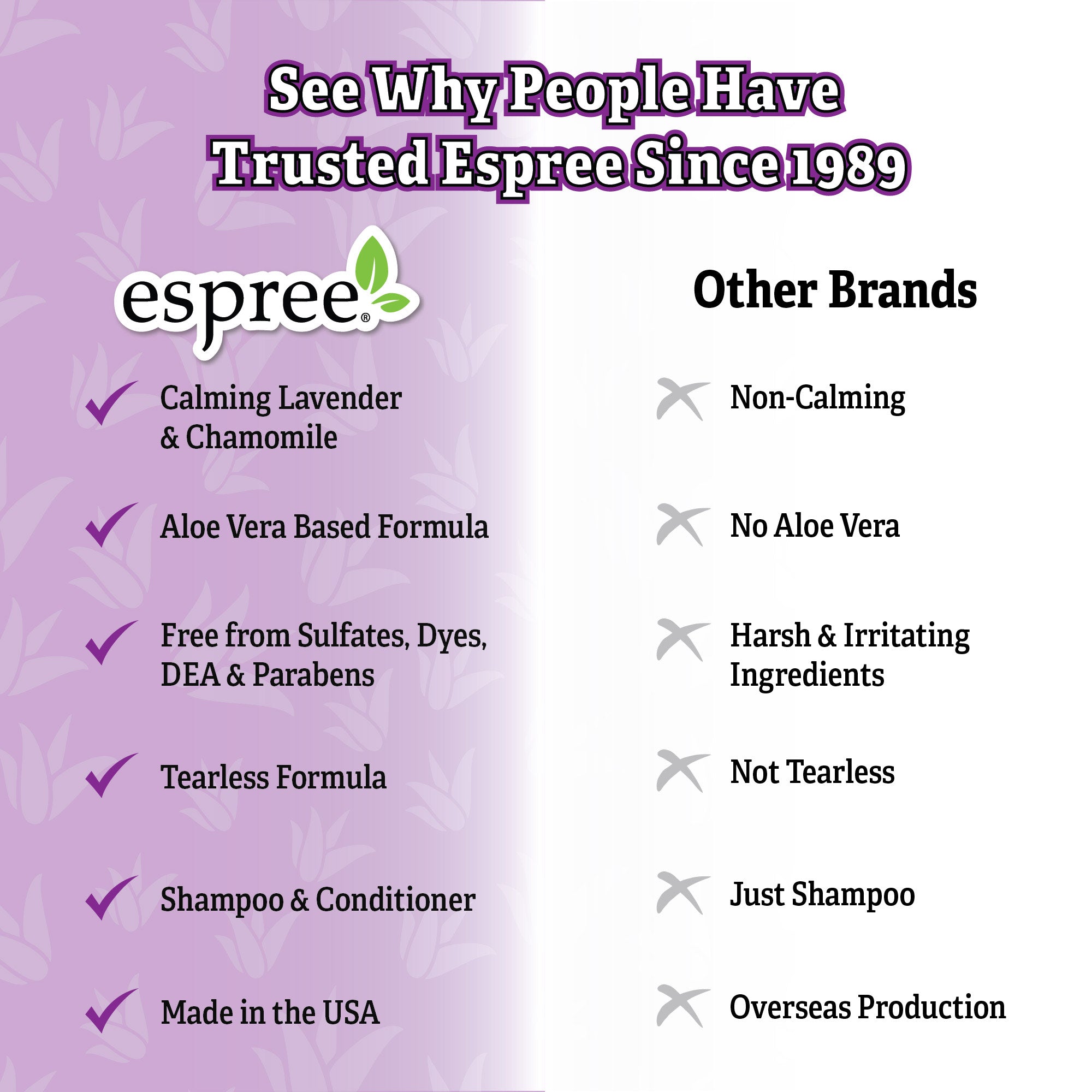 Shop / Unknown Type / Espree Calming Lavendar & Chamomile Shampoo & Conditioner 20oz Espree Calming Lavendar & Chamomile Shampoo & Conditioner 20oz Espree 20oz $12.99 20oz Purchase Options Free In-Store Pick Up Not Available Save 20% on orders $100+ Set your store for inventory and store pickup details Zip Code Search Same-day Delivery* No minimum charge for delivery orders. *Order before 2pm and have it delivered today. Orders placed after 2pm will be delivered the next day. Must be inside delivery radius. Zip Code Unfortunately delivery is not available to this address. In order to ensure the best availability accuracy, changing your selected store will remove all items from your cart. You will need to re-add these items with your newly selected store if you choose to continue. Continue Cancel Ship it to Me Quantity Add To Cart Information Deliver a spa-like experience for your dog with Espree Calming Lavender & Chamomile Shampoo & Conditioner. Infused with a soothing blend of lavender and chamomile, this dual-action formula helps ease stress and anxiety during bath time, making it ideal for nervous or sensitive pets. Chamomile’s anti-inflammatory properties work to calm irritated skin, while aloe vera provides deep hydration to revitalize and nourish the coat. Carefully selected humectants promote a soft, shiny finish, ensuring your clients’ pets leave with healthy, radiant coats. Designed for pets with sensitive skin, this gentle yet effective formula supports a calm and comfortable grooming process. Espree, trusted by professional groomers since 1989, delivers reliable, high-quality solutions to meet the needs of your clientele. Choose Espree for a relaxing experience that keeps your dogs looking and feeling their best after every bath. FEATURES: -CALMING LAVENDER & CHAMOMILE: Perfect for professional grooming, this soothing 2 in 1 is infused with lavender and chamomile to ease stress in anxious pets; Deliver a calming, spa-like experience that leaves dogs refreshed and relaxed after every bath. - ENHANCED WITH ALOE FOR SKIN CARE: Infused with Aloe Vera, this formula soothes and hydrates the skin while leaving coats soft and shiny; Perfect for maintaining healthy skin and coat during frequent grooming sessions. -PET PARENT APPROVED: No sulfates, parabens, DEA, harsh chemicals, or dyes; This natural formula is safe for your dog’s sensitive skin, making bath time worry-free! -EASY 2-IN-1 SOLUTION: Conveniently combines shampoo and conditioner in one bottle for a quicker and easier grooming routine, perfect for busy pet parents. -TRUSTED FOR 40 YEARS: Espree was created in 1989 in partnership with grooming professionals to provide pet care that is as gentle and safe as Mother Nature intended. INGREDIENTS: Purified Water, Organic Aloe Vera Barbadensis Leaf Juice, Plant Derived Cleansers and Conditioning Agents, Vitamin B5, Vitamin E, Lavender Extract, Chamomile Extract, Glycerin, Fragrance, Preservative Customers also liked Customer Reviews