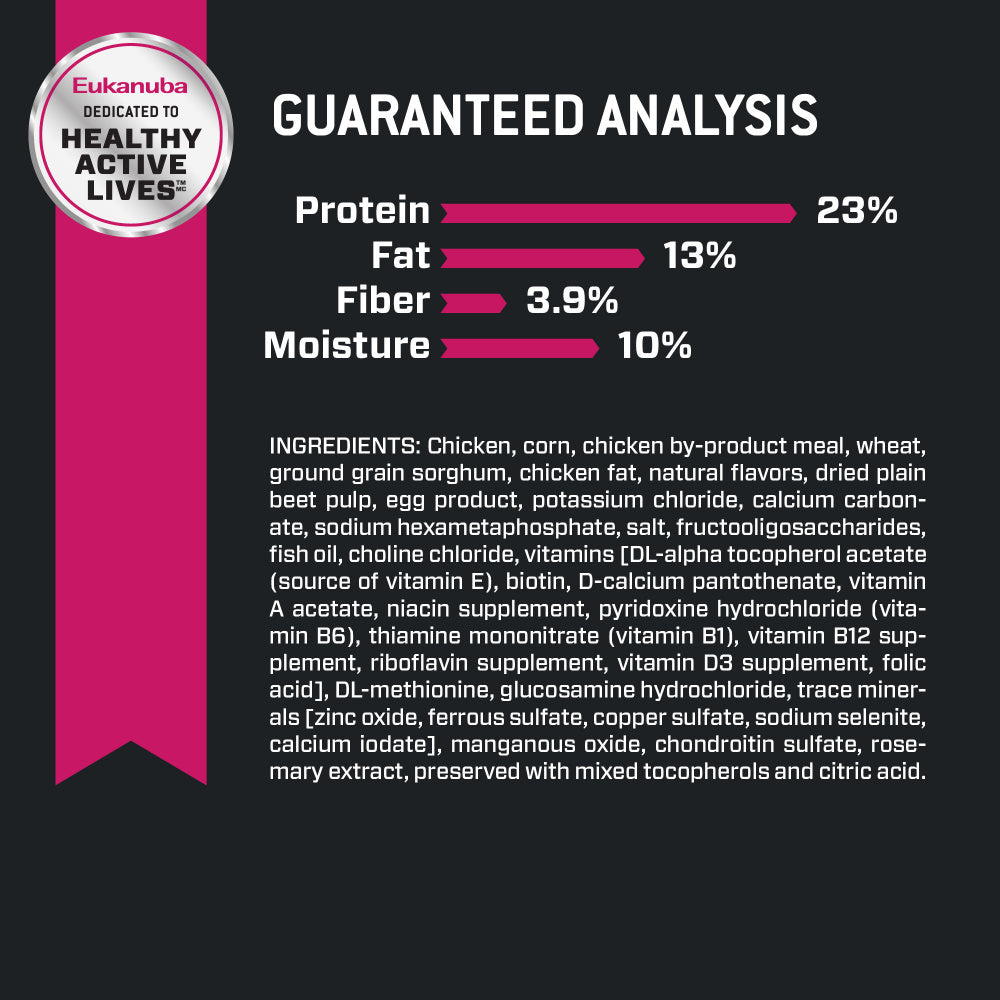 Shop / Unknown Type / Eukanuba Adult Large Breed Chicken Formula Dry Dog Food Eukanuba Adult Large Breed Chicken Formula Dry Dog Food EUKANUBA Weight: 30 lb $81.99 30-lb Purchase Options Free In-Store Pick Up Not Available Save 10% on orders $49+ Set your store for inventory and store pickup details Zip Code Search Same-day Delivery* No minimum charge for delivery orders. *Order before 2pm and have it delivered today. Orders placed after 2pm will be delivered the next day. Must be inside delivery radius. Zip Code Unfortunately delivery is not available to this address. In order to ensure the best availability accuracy, changing your selected store will remove all items from your cart. You will need to re-add these items with your newly selected store if you choose to continue. Continue Cancel Ship it to Me Quantity Add To Cart Feeding guide disclaimer ✕ Feeding guides provide a starting point for the amount of food to give your pet each day. We recommend that you keep your pet in ideal body condition and not allow them to become overweight. The amount of food your pet needs can vary based on age, activity level or other food and treats given, so be sure to work with your veterinarian to determine an appropriate weight for your pet, and to make any necessary adjustments to their feeding. Information Your large dog is anything but ordinary. And they require extraordinary nutrition to perform their best. Fuel your lively companion’s body, mind, and energy with Eukanuba Adult Large Breed dry dog food. Animal proteins, glucosamine, and chondroitin sulfate help keep muscles lean and joints limber and strong. DHA and vitamin E help support healthy brain function to help your dog stay sharp. Optimal levels of fats and carbohydrates help fuel an active lifestyle. 3D DentaDefense reduces tartar buildup for clean teeth and healthy gums. A natural fiber and prebiotic blend aids gentle digestion to help keep your large breed dog feeling healthy. And high-quality chicken is the first ingredient to power your big dog’s day. Pair this kibble with Eukanuba Adult wet dog food for the perfect complement. Your dog always puts their best paw forward for you. Return the favor by feeding them Eukanuba and fuel the extraordinary in every day—satisfaction guaranteed.Why We Love It FOR ADULT LARGE BREED DOGS: Eukanuba Adult Large Breed Dry Dog Food is complete and balanced nutrition for large breed dogs over 15 months old and weighing over 55 lb. MUSCLE & JOINT SUPPORT: A combination of animal protein, glucosamine, and chondroitin sulfate promotes lean muscle development and joint health in active adult dogs. HEALTHY BRAIN FUNCTION: DHA and vitamin E support healthy brain function and help keep dogs sharp. SUPPORTS ACTIVE ADULT DOGS: Optimal levels of fats and carbohydrates fuel an active lifestyle. HIGH-QUALITY PROTEIN: High-quality chicken is the first ingredient for protein that powers their day. Ingredients Chicken, Corn Meal Ground Whole Grain Sorghum, Chicken By-Product Meal (source of Glucosamine and Chondroitin Sulfate) , Ground Whole Grain Barley, Dried Beet Pulp, Natural Flavor, Chicken Fat (preserved with Mixed Tocopherols, a source of Vitamin E), Dried Egg Product, Potassium Chloride, Fish Oil (preserved with Mixed Tocopherols, a source of Vitamin E), Salt, Flax Meal, Sodium Hexametaphosphate, Fructooligosaccharides, Calcium Carbonate, Choline Choloride, DL-Methionine, Minerals (Ferrous Sulfate, Zinc Oxide, Manganese Sulfate, Copper Sulfate, Manganous Oxide, Potassium Iodide), Vitamins (Ascorbic Acid, Vitamin A Acetate, Calcium Pantothenate, Biotin, Thiamine Mononitrate (source of Vitamin B1), Vitamin B12 Supplement, Niacin, Riboflavin Supplement (source of Vitamin B2), Inositol, Pyridoxine Hydrochloride (source of Vitamin B6), Vitamin D3 Supplement, Folic Acid), Brewers Dried Yeast, Vitamin E Supplement, L-Carnitine, Beta-Carotene, Rosemary Extract Guaranteed Analysis Nutrient Guaranteed Units Crude Protein 23.0% min Crude Fat 13.0% min Crude Fiber 5.0% max Moisture 10.0% max Calcium 0.95% min Vitamin E 140 IU/kg min L-Carnitine 30 mg/kg min Omega-6 Fatty Acids 1.95% min Omega-3 Fatty Acids 0.30% min Glucosamine 374 mg/kg min Chondroitin Sulfate 35 mg/kg min Customers also liked Customer Reviews