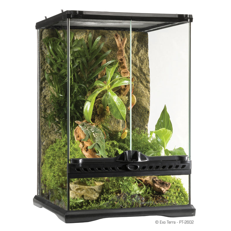 Shop / Unknown Type / Exo Terra Glass Terrarium 12"x12"x18" Exo Terra Glass Terrarium 12"x12"x18" ExoTerra 12x12x18 $106.99 12x12x18 Purchase Options Free In-Store Pick Up Not Available Save 10% on orders $49+ Set your store for inventory and store pickup details Zip Code Search Same-day Delivery* No minimum charge for delivery orders. *Order before 2pm and have it delivered today. Orders placed after 2pm will be delivered the next day. Must be inside delivery radius. Zip Code Unfortunately delivery is not available to this address. In order to ensure the best availability accuracy, changing your selected store will remove all items from your cart. You will need to re-add these items with your newly selected store if you choose to continue. Continue Cancel Ship it to Me Quantity Add To Cart Information The Exo Terra Glass Terrarium is the ideal reptile or amphibian housing designed by European herpetologists. The front opening doors allow easy access for maintenance and feeding. A specially designed lock will prevent escape and the doors can be opened separately. The full screen top ventilation allows UVB and infrared penetration, and is completely removable for easy access while decorating or cleaning. In the back of the screen cover are 5 closable wire or tube inlets on both sides to install Heat Wave Rocks, Waterfalls, sensors, etc. inside the terrarium. The bottom plate of the terrarium is raised to mount a substrate heater to heat a part of the extended ground surface. The extra high fixed front window is ideal for thick layers of substrates (burrowing reptiles), aquatic parts (paludarium) or to mount an Exo Terra reptile den. The natural background is in the same colour like all other Exo Terra decoration items (Water Dishes, Waterfalls, Heat Wave Rocks, etc.) and provides an extra climbing dimension. 30 x 30 x 45cm / 12" x 12" x 18" (WxDxH) Customers also liked Customer Reviews