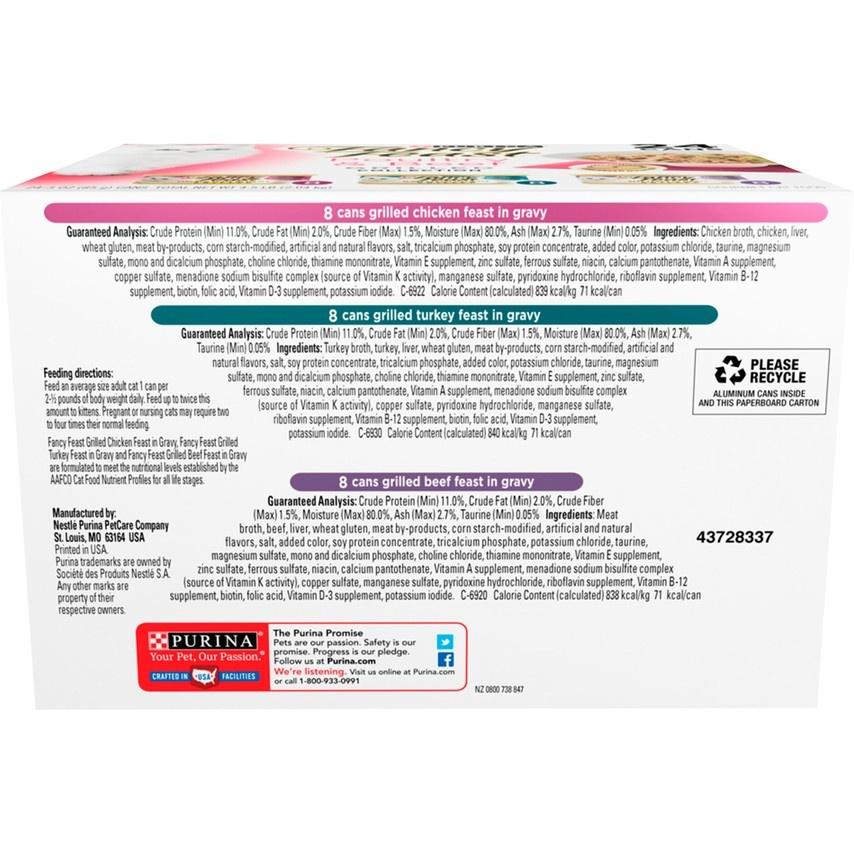 Shop / Wet Food / Fancy Feast Grilled Poultry and Beef Feast Variety Canned Cat Food Fancy Feast Grilled Poultry and Beef Feast Variety Canned Cat Food Fancy Feast Weight: 3 oz, case of 24 $22.99 3-oz, case of 24 Purchase Options Free In-Store Pick Up Not Available Save 10% on orders $49+ Set your store for inventory and store pickup details Zip Code Search Same-day Delivery* No minimum charge for delivery orders. *Order before 2pm and have it delivered today. Orders placed after 2pm will be delivered the next day. Must be inside delivery radius. Zip Code Unfortunately delivery is not available to this address. In order to ensure the best availability accuracy, changing your selected store will remove all items from your cart. You will need to re-add these items with your newly selected store if you choose to continue. Continue Cancel Ship it to Me Quantity Add To Cart Feeding guide disclaimer ✕ Feeding guides provide a starting point for the amount of food to give your pet each day. We recommend that you keep your pet in ideal body condition and not allow them to become overweight. The amount of food your pet needs can vary based on age, activity level or other food and treats given, so be sure to work with your veterinarian to determine an appropriate weight for your pet, and to make any necessary adjustments to their feeding. Information Give your cat more of the savory flavors she loves with Purina Fancy Feast Grilled Poultry & Beef Collection wet cat food. Turkey, chicken and beef recipes offer a delicious taste, and the slow-cooked, tender cuts deliver a tempting texture she's sure to adore. Each variety in this collection features a savory gravy to balance out the recipes, and high-quality ingredients give you added peace of mind every time you fill her dish. Give her an exceptional level of taste at mealtime, and watch as she delights in every meaty morsel. Essential vitamins and minerals in every serving support her overall health and wellness, helping you to feel good about the foods you put in her dish each day. Let your feline friend know you pay attention to her cravings for delectable meals every time you open a can from this Fancy Feast gourmet canned cat food variety pack. Indulge your cat's cravings for gourmet entrees when you offer up Purina Fancy Feast Grilled Poultry & Beef Collection wet cat food. This package contains Fancy Feast Grilled Chicken Feast in Gravy, Grilled Turkey Feast in Gravy and Grilled Beef Feast in Gravy, making it easy to change things up at mealtime to keep her excited about feedings. With 100% complete and balanced nutrition for adult cats in each serving, this wet cat food collection lets you keep her health at the top of your priority list while still giving her the tastes cats love. The tender texture of the slow-cooked meaty morsels gives her something to look forward to every time she hears you open a can of this Fancy Feast gourmet wet cat food. For over 30 years, we've been committed to creating ultimate delight for cats, balancing nutrition with flavor and presentation for quality canned cat foods, dry foods and treats for special times. We make quality the #1 ingredient in everything we do, and we strive to meet or exceed government standards for pet food, so you can feel confident every time you fill her dish with this gourmet wet cat food. This Fancy Feast collection is proudly crafted in our U.S. facilities to give you added peace of mind, and our staff performs hourly quality and safety checks throughout the production process. The result is delicious, high-quality food for your beloved cat. We know that life is better with pets, which is why we're constantly looking for ways to improve our recipes with results-based research that makes a delicious, nutritious adult cat food. Sustainability is a core concept for Purina pet foods, and we see that through by working toward a commitment to responsible sourcing and eco-friendly packaging. That's why each can in this canned cat food 24-pack is conveniently recyclable. Offer up a serving of Purina Fancy Feast Grilled Poultry & Beef Collection wet cat food, and give your cat the gourmet experience she truly deserves. Ingredients Grilled Turkey Feast In Gravy: Turkey Broth, Turkey, Liver, Wheat Gluten, Meat By-Products, Corn Starch-Modified, Artificial And Natural Flavors, Salt, Soy Protein Concentrate, Tricalcium Phosphate, Added Color, Minerals [Potassium Chloride, Magnesium Sulfate, Zinc Sulfate, Ferrous Sulfate, Copper Sulfate, Manganese Sulfate, Potassium Iodide], Taurine, Choline Chloride, Vitamins [Thiamine Mononitrate (Vitamin B-1), Vitamin E Supplement, Niacin (Vitamin B-3), Calcium Pantothenate (Vitamin B-5), Vitamin A Supplement, Menadione Sodium Bisulfite Complex (Vitamin K), Pyridoxine Hydrochloride (Vitamin B-6(, Riboflavin Supplement (Vitamin B-2), Vitamin B-12 Supplement, Biotin (Vitamin B-7), Folic Acid (Vitamin B-9I, Vitamin D-3 Supplement]. D-6930. Grilled Chicken Feast In Gravy: Chicken Broth, Chicken, Liver, Wheat Gluten, Meat By-Products, Corn Starch-Modified, Artificial And Natural Flavors, Salt, Tricalcium Phosphate, Soy Protein Concentrate, Minerals [Potassium Chloride, Magnesium Sulfate, Zinc Sulfate, Ferrous Sulfate, Copper Sulfate, Manganese Sulfate, Potassium Iodide], Added Color, Taurine, Choline Chloride, Vitamins [Thiamine Mononitrate (Vitamin B-1), Vitamin E Supplement, Niacin (Vitamin B-3), Calcium Pantothenate (Vitamin B-5), Vitamin A Supplement, Menadione Sodium Bisulfite Complex (Vitamin K), Pyridoxine Hydrochloride (Vitamin B-6), Riboflavin Supplement (Vitamin B-2), Vitamin B-12 Supplement, Biotin (Vitamin B-7), Folic Acid (Vitamin B-9), Vitamin D-3 Supplement]. D-6922. Grilled Beef Feast In Gravy: Meat Broth, Beef, Liver, Wheat Gluten, Meat By-Products, Corn Starch-Modified, Artificial And Natural Flavors, Salt, Added Color, Soy Protein Concentrate, Tricalcium Phosphate, Minerals [Potassium Chloride, Magnesium Sulfate, Zinc Sulfate, Ferrous Sulfate,