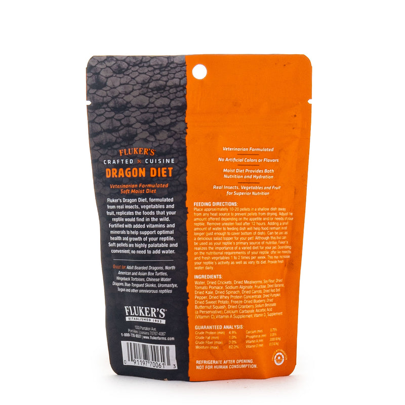 Shop / Unknown Type / Fluker's Crafted Cuisine Semi Moist Diet - Adult Dragon Fluker's Crafted Cuisine Semi Moist Diet - Adult Dragon Fluker Farms 6.75oz $5.99 6.75oz Purchase Options Free In-Store Pick Up Not Available Save 10% on orders $49+ Set your store for inventory and store pickup details Zip Code Search Same-day Delivery* No minimum charge for delivery orders. *Order before 2pm and have it delivered today. Orders placed after 2pm will be delivered the next day. Must be inside delivery radius. Zip Code Unfortunately delivery is not available to this address. In order to ensure the best availability accuracy, changing your selected store will remove all items from your cart. You will need to re-add these items with your newly selected store if you choose to continue. Continue Cancel Ship it to Me Quantity Add To Cart Feeding guide disclaimer ✕ Feeding guides provide a starting point for the amount of food to give your pet each day. We recommend that you keep your pet in ideal body condition and not allow them to become overweight. The amount of food your pet needs can vary based on age, activity level or other food and treats given, so be sure to work with your veterinarian to determine an appropriate weight for your pet, and to make any necessary adjustments to their feeding. Information Fluker’s knows exactly what reptiles crave and need, that’s why they formulated Crafted Cuisine Adult Bearded Dragon Diet Food. This veterinarian formulated meal is specifically made for adult bearded dragons and omnivorous reptiles. It has a soft, moist texture to help provide your sidekick with healthy hydration and it’s packed with vitamins and minerals for overall health and well-being. Your pet will love the ingredients that this food has to offer, including real fruits, vegetables and insects like dried crickets, mealworms, banana, kale, carrots, butternut squash, spinach, pumpkin and sweet potatoes. Ingredients: Water, Dried Crickets, Dried Mealworms, Soy Flour, Dried Tomato Pomace, Fructose, Dried Banana, Sodium Alginate, Dried Kale, Dried Spinach, Dried Carrot, Dried Red Bell Pepper, Dried Whey Protein Concentrate, Dried Pumpkin, Dried Sweet Potato, Freeze-Dried Blueberry, Dried Butternut Squash, Dried Cranberry, Potassium Sorbate (A Preservative), Sodium Benzoate (A Preservative), Calcium Carbonate, Ascorbic Acid (Vitamin C), Vitamin A Supplement, Vitamin D3 Supplement, Vitamin E Supplement. Guaranteed Analysis: Crude Protein not less than 4.89%; Crude Fat not less than 2.14%; Crude Fiber not more than 1.97%; Moisture not more than 82.20% Customers also liked Customer Reviews
