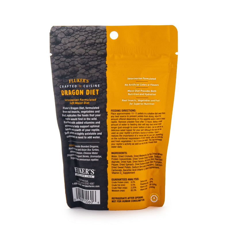 Shop / Unknown Type / Fluker's Crafted Cuisine Semi Moist Diet - Juvenile Dragon Fluker's Crafted Cuisine Semi Moist Diet - Juvenile Dragon Fluker Farms 6.75oz $5.99 6.75oz Purchase Options Free In-Store Pick Up Not Available Save 10% on orders $49+ Set your store for inventory and store pickup details Zip Code Search Same-day Delivery* No minimum charge for delivery orders. *Order before 2pm and have it delivered today. Orders placed after 2pm will be delivered the next day. Must be inside delivery radius. Zip Code Unfortunately delivery is not available to this address. In order to ensure the best availability accuracy, changing your selected store will remove all items from your cart. You will need to re-add these items with your newly selected store if you choose to continue. Continue Cancel Ship it to Me Quantity Add To Cart Feeding guide disclaimer ✕ Feeding guides provide a starting point for the amount of food to give your pet each day. We recommend that you keep your pet in ideal body condition and not allow them to become overweight. The amount of food your pet needs can vary based on age, activity level or other food and treats given, so be sure to work with your veterinarian to determine an appropriate weight for your pet, and to make any necessary adjustments to their feeding. Information Fluker’s knows exactly what reptiles crave and need, that’s why they formulated Crafted Cuisine Juvenile Bearded Dragon Diet Food. This veterinarian formulated meal is specifically made for juvenile bearded dragons and omnivorous reptiles. It has a soft, moist texture to help provide your sidekick with healthy hydration and it’s packed with vitamins and minerals for overall health and well-being. Your pet will love the ingredients that this food has to offer, including real fruits, vegetables and insects like dried crickets, mealworms, banana, kale, carrots, butternut squash, spinach, pumpkin and sweet potatoes. Ingredients: Water, Dried Crickets, Dried Mealworms, Soy Flour, Dried, Vitamin D Supplement, Vitamin E Supplement; Whey Protein Concentrate, Dried Tomato Pomace, Fructose, Sodium Alginate, Dried Kale, Dried Banana, Dried Carrot, Dried Red Bell Pepper, Dried Spinach, Dried Butternut Squash, Dried Red Bell Pepper, Dried Spinach, Dried Butternut Squash, Dried Pumpkin, Dried Sweet Potato, Potassium Sorbate, (A Preservative), Sodium Benzoate (A Preservative), Calcium, Carbonate, Ascorbic Acid (Vitamin C), Vitamin A Supplement. Guaranteed Analysis: Crude Protein not less than 5.35%; Crude Fat not less than 2.09%; Crude Fiber not more than 2.02%; Moisture not more than 85.69%. Customers also liked Customer Reviews