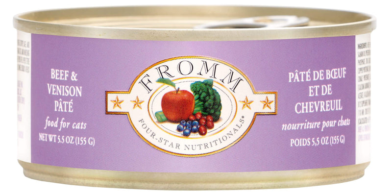 Shop / Wet Food / Fromm Four-Star Nutritionals Beef & Venison Paté Food for Cats Fromm Four-Star Nutritionals Beef & Venison Paté Food for Cats Fromm 5.5 oz $2.79 5.5 oz Purchase Options Free In-Store Pick Up Not Available Save 10% on orders $49+ Set your store for inventory and store pickup details Zip Code Search Same-day Delivery* No minimum charge for delivery orders. *Order before 2pm and have it delivered today. Orders placed after 2pm will be delivered the next day. Must be inside delivery radius. Zip Code Unfortunately delivery is not available to this address. In order to ensure the best availability accuracy, changing your selected store will remove all items from your cart. You will need to re-add these items with your newly selected store if you choose to continue. Continue Cancel Ship it to Me Quantity Add To Cart Feeding guide disclaimer ✕ Feeding guides provide a starting point for the amount of food to give your pet each day. We recommend that you keep your pet in ideal body condition and not allow them to become overweight. The amount of food your pet needs can vary based on age, activity level or other food and treats given, so be sure to work with your veterinarian to determine an appropriate weight for your pet, and to make any necessary adjustments to their feeding. Information Finely minced beef and venison cooked in beef broth Fromm Family Foods is a fifth generation family-owned-and-operated artisan pet food company Produced at Fromm's hands-on family-owned-and-operated facility Interchangable with other Four-Star can and dry recipes Paté provides a unique texture for finicky cats Free from artificial colors, flavors or preservatives Ingredients Beef, beef broth, beef liver, venison, lentils, sweet potatoes, tomato paste, salmon oil (preserved with mixed tocopherols), salt, potassium chloride, Minerals [dicalcium phosphate, zinc sulfate, magnesium sulfate, ferrous sulfate, zinc proteinate, calcium carbonate, copper sulfate, ferrous proteinate, sodium selenite, calcium iodate, manganese sulfate, copper proteinate, manganese proteinate], calcium sulfate, xanthan gum, locust bean gum, taurine, Vitamins [Vitamin E supplement, niacin supplement, thiamine mononitrate, Vitamin A supplement, calcium pantothenate, riboflavin supplement, pyridoxine hydrochloride, Vitamin B12 supplement, Vitamin D3 supplement, folic acid]. Guaranteed Analysis Crude Protein 11% Min, Crude Fat 5% Min, Crude Fiber 1.2% Max, Moisture 78% Max Customers also liked Customer Reviews