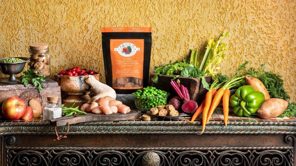 Shop / Unknown Type / Fromm Four Star Oven Baked Chicken with Carrots & Peas Recipe Dog Treats Fromm Four Star Oven Baked Chicken with Carrots & Peas Recipe Dog Treats Fromm Weight: 8 oz $5.89 8-oz Purchase Options Free In-Store Pick Up Not Available Save 10% on orders $49+ Set your store for inventory and store pickup details Zip Code Search Same-day Delivery* No minimum charge for delivery orders. *Order before 2pm and have it delivered today. Orders placed after 2pm will be delivered the next day. Must be inside delivery radius. Zip Code Unfortunately delivery is not available to this address. In order to ensure the best availability accuracy, changing your selected store will remove all items from your cart. You will need to re-add these items with your newly selected store if you choose to continue. Continue Cancel Ship it to Me Quantity Add To Cart Feeding guide disclaimer ✕ Feeding guides provide a starting point for the amount of food to give your pet each day. We recommend that you keep your pet in ideal body condition and not allow them to become overweight. The amount of food your pet needs can vary based on age, activity level or other food and treats given, so be sure to work with your veterinarian to determine an appropriate weight for your pet, and to make any necessary adjustments to their feeding. Information A delectable grain-free, oven baked treat made with chicken, whole peas, and carrotsWhy We Love It Fromm Family Foods is a fifth generation family-owned-and-operated artisan pet food company Produced in small batches in Wisconsin Only 12 calories per treat Crunchy texture Free from artificial colors, flavors or preservatives About FrommMaintaining a tradition of quiet innovation dedicated to the health and nutrition of dogs and cats since 1908, Fromm Family Foods is a family-owned and operated artisan dog and cat food company based in Wisconsin. Dedicated to food safety, Fromm ensures that every ingredient is tested and sampled before meeting their Wisconsin manufacturing facilities. With some of the highest inclusion levels of fresh meats, fish, fruits, vegetables, and real Wisconsin cheese, Fromm offers a holistic recipe for all types and tastes of dogs and cats, including grain-free, limited ingredient, puppy, and everything in between. Fromm Family Foods Products 2014 from Fromm Family Foods on Vimeo. Ingredients Chicken, pea flour, potato flour, tapioca, whole peas, chicken fat (preserved with mixed tocopherols), tomato pomace, cranberries, sweet potatoes, carrots, apples, split peas, green beans, green bell peppers, celery, beets, parsley, lettuce, spinach. Guaranteed Analysis Nutrient Guaranteed Units Crude Protein 12% min Crude Fat 5% min Crude Fiber 5% max Moisture 12% max Customers also liked Customer Reviews