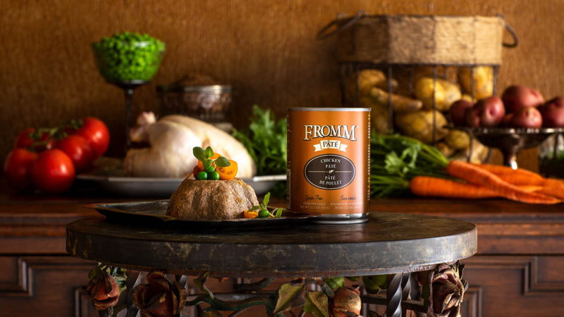 Shop / Unknown Type / Fromm Fromm Pate Grain Free Chicken Pate Canned Dog Food Fromm Fromm Pate Grain Free Chicken Pate Canned Dog Food Fromm Weight: 12.2 oz, case of 12 $34.99 12.2-oz, case of 12 Purchase Options Free In-Store Pick Up Not Available Save 10% on orders $49+ Set your store for inventory and store pickup details Zip Code Search Same-day Delivery* No minimum charge for delivery orders. *Order before 2pm and have it delivered today. Orders placed after 2pm will be delivered the next day. Must be inside delivery radius. Zip Code Unfortunately delivery is not available to this address. In order to ensure the best availability accuracy, changing your selected store will remove all items from your cart. You will need to re-add these items with your newly selected store if you choose to continue. Continue Cancel Ship it to Me Quantity Add To Cart Feeding guide disclaimer ✕ Feeding guides provide a starting point for the amount of food to give your pet each day. We recommend that you keep your pet in ideal body condition and not allow them to become overweight. The amount of food your pet needs can vary based on age, activity level or other food and treats given, so be sure to work with your veterinarian to determine an appropriate weight for your pet, and to make any necessary adjustments to their feeding. Information Perfect as a complete meal or accompanying your dog’s favorite dry food, Fromm Four Star Chicken Pate Canned Dog Food provides balanced and complete nutrition for all breeds and all stages of life. This recipe is made with high quality, finely minced chicken paired with potatoes, carrots, and peas cooked together in a chicken broth. Fromm Four Star Chicken Pate Canned Dog Food is grain free and made with no artificial colors, flavors, or preservatives.Why We Love It Fromm Family Foods is a fifth generation family-owned-and-operated artisan pet food company Produced at Fromm's hands-on family-owned-and-operated facility Free from artificial colors, flavors or preservatives About FrommMaintaining a tradition of quiet innovation dedicated to the health and nutrition of dogs and cats since 1908, Fromm Family Foods is a family-owned and operated artisan dog and cat food company based in Wisconsin. Dedicated to food safety, Fromm ensures that every ingredient is tested and sampled before meeting their Wisconsin manufacturing facilities. With some of the highest inclusion levels of fresh meats, fish, fruits, vegetables, and real Wisconsin cheese, Fromm offers a holistic recipe for all types and tastes of dogs and cats, including grain-free, limited ingredient, puppy, and everything in between. Ingredients Chicken, Chicken Broth, Chicken Liver, Potatoes, Carrots, Flaxseed, Peas, Tomato Paste, Dried Egg Product, Minerals [Dicalcium Phosphate, Zinc Sulfate, Magnesium Sulfate, Ferrous Sulfate, Zinc Proteinate, Calcium Carbonate, Copper Sulfate, Iron Proteinate, Sodium Selenite, Calcium Iodate, Manganese Sulfate, Copper Proteinate, Manganese Proteinate], Salmon Oil (preserved with mixed tocopherols),Agar-Agar, Xanthan Gum, Salt, Vitamins [Potassium Chloride, Vitamin E Supplement, Niacin Supplement, Calcium Pantothenate, Riboflavin Supplement, Vitamin A Supplement, Biotin, Thiamine Mononitrate, Vitamin B12 Supplement, Pyridoxine Hydrochloride, Vitamin D3 Supplement, Folic Acid] Guaranteed Analysis Nutrient Guaranteed Units Crude Protein 9% min Crude Fat 6% min Crude Fiber 1.5% max Moisture 78% max Customers also liked Customer Reviews