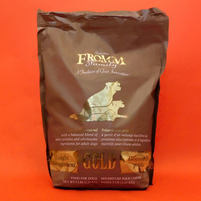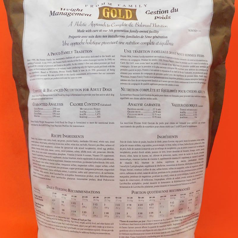 Shop / Dog Food / Fromm Gold Weight Management Dry Dog Food Fromm Gold Weight Management Dry Dog Food Fromm $17.99 5 lb 15 lb 30 lb 5-lb 15-lb 30-lb Purchase Options Free In-Store Pick Up Not Available Save 10% on orders $49+ Set your store for inventory and store pickup details Zip Code Search Same-day Delivery* No minimum charge for delivery orders. *Order before 2pm and have it delivered today. Orders placed after 2pm will be delivered the next day. Must be inside delivery radius. Zip Code Unfortunately delivery is not available to this address. In order to ensure the best availability accuracy, changing your selected store will remove all items from your cart. You will need to re-add these items with your newly selected store if you choose to continue. Continue Cancel Ship it to Me Quantity Add To Cart Feeding guide disclaimer ✕ Feeding guides provide a starting point for the amount of food to give your pet each day. We recommend that you keep your pet in ideal body condition and not allow them to become overweight. The amount of food your pet needs can vary based on age, activity level or other food and treats given, so be sure to work with your veterinarian to determine an appropriate weight for your pet, and to make any necessary adjustments to their feeding. Information Tastefully prepared with a balanced blend of select proteins and wholesome ingredients for adult dogs. Fromm Family Weight Management Gold Food for Dogs is formulated to provide your less active adult dog with complete and balanced nutrition.Why We Love It Fromm Family Foods is a fifth generation family-owned-and-operated artisan pet food company Produced at Fromm's hands-on family-owned-and-operated facility High nutrient digestibility and utilization Third party pathogenic bacteria testing on all production batches Fromm's specially developed blend of probiotics About FrommMaintaining a tradition of quiet innovation dedicated to the health and nutrition of dogs and cats since 1908, Fromm Family Foods is a family-owned and operated artisan dog and cat food company based in Wisconsin. Dedicated to food safety, Fromm ensures that every ingredient is tested and sampled before meeting their Wisconsin manufacturing facilities. With some of the highest inclusion levels of fresh meats, fish, fruits, vegetables, and real Wisconsin cheese, Fromm offers a holistic recipe for all types and tastes of dogs and cats, including grain-free, limited ingredient, puppy, and everything in between. Fromm Family Foods Products 2014 from Fromm Family Foods on Vimeo. Ingredients Turkey Liver, Chicken Meal, Turkey Broth, Oatmeal, Pearled Barley, Menhaden Fish Meal, Whole Oats, Dried Tomato Pomace, Whitefish, Whole Barley, Brown Rice, Millet, White Rice, Oat Hulls, Flaxseed, Pea Fiber, Dried Yeast, Salmon Oil (preserved with mixed tocopherols),Chicken Fat (preserved with mixed tocopherols),Dried Egg Product, Potatoes, Salt, Sweet Potatoes, Carrots, Celery, Cheese, Alfalfa Meal, Vitamins [Choline Chloride, Potassium Chloride, Vitamin E Supplement, Ascorbic Acid, Calcium Carbonate, Riboflavin Supplement, Niacin Supplement, Calcium Pantothenate, Vitamin A Supplement, Vitamin D3 Supplement, Pyridoxine Hydrochloride, Biotin, Vitamin B12 Supplement, Thiamine Mononitrate, Folic Acid],Taurine, Chicory Root Extract, Sorbic Acid (Preservative),Monosodium Phosphate, Minerals [Zinc Sulfate, Manganese Sulfate, Ferrous Sulfate, Magnesium Sulfate, Zinc Proteinate, Ferrous Proteinate, Manganese Proteinate, Copper Sulfate, Magnesium Proteinate, Copper Proteinate, Calcium Iodate], Yucca Schidigera Extract, L-Carnitine, DL-Methionine, L-Tryptophan, Sodium Selenite, Dried Lactobacillus paracasei Fermentation Product, Dried Lactobacillus reuteri Fermentation Product, Dried Lactobacillus acidophilus Fermentation Product, Dried Lactobacillus plantarum Fermentation Product. Guaranteed Analysis Nutrient Guaranteed Units Crude Protein 25% min Crude Fat 10% min Crude Fiber 10% max Moisture 10% max Customers also liked Customer Reviews