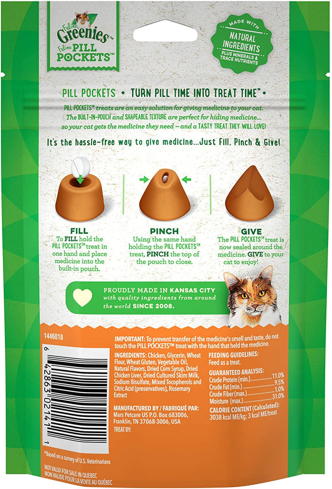 Shop / Treats / Greenies Pill Pockets Feline Chicken Flavor Cat Treats Greenies Pill Pockets Feline Chicken Flavor Cat Treats Greenies Weight: For capsules or tablets: 1.6 oz, 45 count $6.49 For capsules or tablets: 1.6-oz, 45 count Purchase Options Free In-Store Pick Up Not Available Save 10% on orders $49+ Set your store for inventory and store pickup details Zip Code Search Same-day Delivery* No minimum charge for delivery orders. *Order before 2pm and have it delivered today. Orders placed after 2pm will be delivered the next day. Must be inside delivery radius. Zip Code Unfortunately delivery is not available to this address. In order to ensure the best availability accuracy, changing your selected store will remove all items from your cart. You will need to re-add these items with your newly selected store if you choose to continue. Continue Cancel Ship it to Me Quantity Add To Cart Feeding guide disclaimer ✕ Feeding guides provide a starting point for the amount of food to give your pet each day. We recommend that you keep your pet in ideal body condition and not allow them to become overweight. The amount of food your pet needs can vary based on age, activity level or other food and treats given, so be sure to work with your veterinarian to determine an appropriate weight for your pet, and to make any necessary adjustments to their feeding. Information Take the stress out of giving your cat their medicine. Feline GREENIES Pill Pockets Treats for Cats easily hide most tablets and capsules in a great-tasting treat that’s made with natural ingredients plus minerals and trace nutrients. These soft cat treats are the #1 vet recommended choice for giving pills* and feature a delicious chicken flavor that helps disguise the taste of the medicine. It's the hassle-free way to give your cat medicine... just place their medicine inside the pocket, pinch the pocket closed to secure the pill or capsule, and share with your cat. Just like that, the treat (and medicine) disappears. When it comes to taking meds, your cat is smart. But you're smarter... because you've got Feline GREENIES Pill Pockets Cat Treats. * Based on a survey of U.S. veterinariansWhy We Love ItContains one (1) 1.6 oz. 45-count pack of Feline GREENIES Pill Pockets Natural Cat Treats Plus Minerals & Trace Nutrients, Chicken FlavorAbout GreeniesAs loving pet owners ourselves, the health and well-being of our pets is always our top priority. That’s why we make all GREENIES™ Dental Treats with delicious, healthy ingredients that are easy to digest and help promote overall pet health. As the popularity of natural pet food continues to grow, more and more pet food manufacturers are putting the term “natural” on their product labels. We understand that there is often confusion about what the term actually means for pet food products like GREENIES™ Dental Treats. Ingredients Wheat Flour, Chicken Liver, Glycerin, Chicken, Corn Syrup, Pregelantized Corn, Turkey Fat (preserved with mixed tocopherols and rosemary extract), Water (sufficient for processing), Gelatin, Natural Flavor, Wheat Gluten, Starch, Soy Protean, Brewers Yeast, Salt, Lecithin, Probiotics (Lactobacillus Acidolphilus, Lactobacillus Lactis, Lactobacillus Casei), Potassium Sorbate, Ascorbic Acid, Vitamin E Supplement. Guaranteed Analysis Nutrient Guaranteed Units Crude Protein 11.0% min Crude Fat 9.5% min Crude Fiber 1.0% max Moisture 31.0% max Customers also liked Customer Reviews