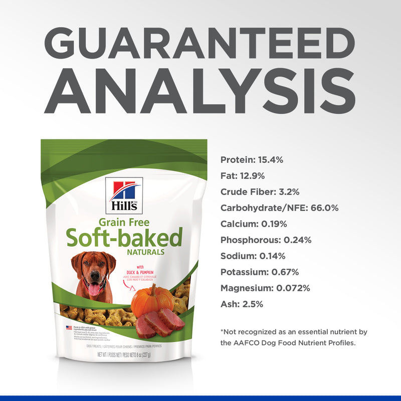 Shop / Treats / Hill's Science Diet Soft-Baked Naturals with Duck & Pumpkin Dog Treats Hill's Science Diet Soft-Baked Naturals with Duck & Pumpkin Dog Treats Hill's Ideal Balance Weight: 8 oz $8.99 8-oz Purchase Options Free In-Store Pick Up Not Available Save 10% on orders $49+ Set your store for inventory and store pickup details Zip Code Search Same-day Delivery* No minimum charge for delivery orders. *Order before 2pm and have it delivered today. Orders placed after 2pm will be delivered the next day. Must be inside delivery radius. Zip Code Unfortunately delivery is not available to this address. In order to ensure the best availability accuracy, changing your selected store will remove all items from your cart. You will need to re-add these items with your newly selected store if you choose to continue. Continue Cancel Ship it to Me Quantity Add To Cart Feeding guide disclaimer ✕ Feeding guides provide a starting point for the amount of food to give your pet each day. We recommend that you keep your pet in ideal body condition and not allow them to become overweight. The amount of food your pet needs can vary based on age, activity level or other food and treats given, so be sure to work with your veterinarian to determine an appropriate weight for your pet, and to make any necessary adjustments to their feeding. Information Hill's Soft-Baked Naturals with Duck & Pumpkin are delicious, natural dog treats with real duck to help maintain lean muscle. Grain free with no corn, wheat, soy, added artificial preservatives, colors or flavors. • Indulge your dog with a delicious, natural treat made with real duck and pumpkin. Ingredients Peas, Duck, Potatoes, Glycerin, Cane Molasses, Chicken Fat, Pumpkin, Technical Pork Gelatin, Natural Flavors, Mixed Tocopherols for freshness. Guaranteed Analysis Nutrient Guaranteed Units Crude Protein 7% min Crude Fat 5% min Crude Fiber 5% max Moisture 18% max Customers also liked Customer Reviews
