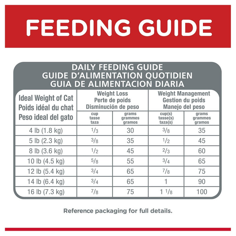 Shop / Cat Food / Hill's Science Diet Adult Hairball Control Light Chicken Recipe Dry Cat Food Hill's Science Diet Adult Hairball Control Light Chicken Recipe Dry Cat Food Hill's Science Diet $37.99 7 lb 15.5 lb 7-lb 15.5-lb Purchase Options Free In-Store Pick Up Not Available Save 10% on orders $49+ Set your store for inventory and store pickup details Zip Code Search Same-day Delivery* No minimum charge for delivery orders. *Order before 2pm and have it delivered today. Orders placed after 2pm will be delivered the next day. Must be inside delivery radius. Zip Code Unfortunately delivery is not available to this address. In order to ensure the best availability accuracy, changing your selected store will remove all items from your cart. You will need to re-add these items with your newly selected store if you choose to continue. Continue Cancel Ship it to Me Quantity Add To Cart Feeding guide disclaimer ✕ Feeding guides provide a starting point for the amount of food to give your pet each day. We recommend that you keep your pet in ideal body condition and not allow them to become overweight. The amount of food your pet needs can vary based on age, activity level or other food and treats given, so be sure to work with your veterinarian to determine an appropriate weight for your pet, and to make any necessary adjustments to their feeding. Information Hairballs are a natural occurrence for cats, but if they're more frequent than you'd like, you may need a nutritional solution. Hill's® Science Diet® Hairball Control Light Adult dry cat food provides nutrition to help avoid hairball formation for cats who would benefit from a lighter, healthy lifestyle. This cat food made from natural ingredients contains 13% fewer calories vs. Hill's™ Science Diet™ Adult Hairball Control, giving your grown cat a low-cal source of high-quality protein. The natural fibers are easy to digest, and work to comfortably reduce your adult cat's hairball issues. There’s more to love with the new look of Science Diet®. Some of our products also have new names, new kibble shapes & new formulas. ▸ Dry kibble food made with natural fibers to comfortably reduce hairballs in adult cats ▸ Low-cal kibble with 13% fewer calories vs. Hill's™ Science Diet™ Adult Hairball Control ▸ High-quality protein to help your adult cat build and maintain lean muscles ▸ High-quality protein to help your adult cat build and maintain lean muscles ▸ Made with natural ingredients Natural fiber comfortably reduces hairballs Ingredients Chicken, Corn Gluten Meal, Brewers Rice, Wheat Gluten, Powdered Cellulose, Whole Grain Wheat, Chicken Liver Flavor, Dried Beet Pulp, Soybean Oil, Calcium Sulfate, Lactic Acid, Chicken Fat, Potassium Chloride, Dicalcium Phosphate, Choline Chloride, Iodized Salt, Fish Oil, vitamins (Vitamin E Supplement, L-Ascorbyl-2-Polyphosphate (source of Vitamin C), Niacin Supplement, Thiamine Mononitrate, Vitamin A Supplement, Calcium Pantothenate, Riboflavin Supplement, Biotin, Vitamin B12 Supplement, Pyridoxine Hydrochloride, Folic Acid, Vitamin D3 Supplement), Taurine, minerals (Ferrous Sulfate, Zinc Oxide, Copper Sulfate, Manganous Oxide, Calcium Iodate, Sodium Selenite), L-Carnitine, Mixed Tocopherols for freshness, Natural Flavors, Green Peas, Apples, Cranberries, Carrots, Broccoli, Beta-Carotene. Guaranteed Analysis Nutrient Guaranteed Units Crude Protein 40.0 % Crude Fat 9.6 % Crude Fiber 8.0 % Carbohydrates 35.1 % Calcium 1.08 % Phosphorus 0.79 % Potassium 0.83 % Sodium 0.44 % Magnesium 0.076 % Taurine 0.23 % Vitamin C 94 ppm Vitamin E 725 IU/kg Omega-3 Fatty Acids 0.41 % Omega-6 Fatty Acids 3.46 % Customers also liked Customer Reviews