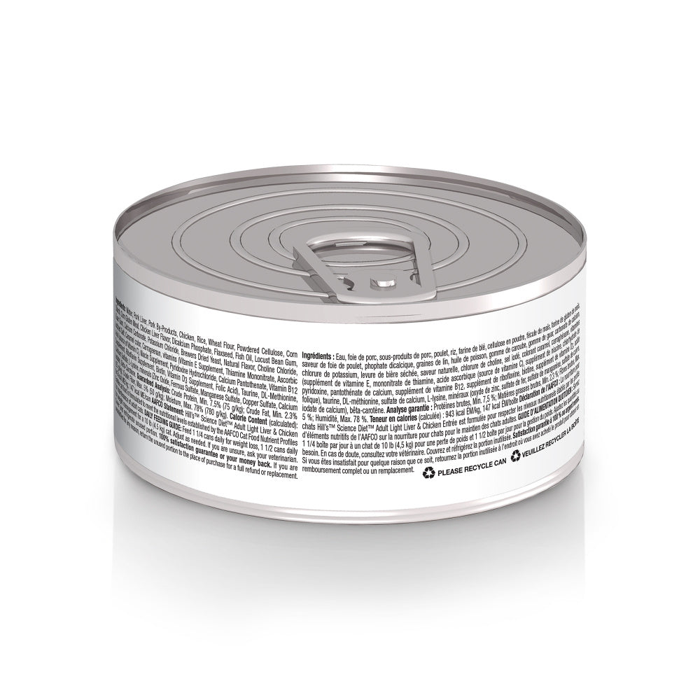 Shop / Unknown Type / Hill's Science Diet Adult Light Liver & Chicken Entree Canned Cat Food Hill's Science Diet Adult Light Liver & Chicken Entree Canned Cat Food Hill's Science Diet $42.99 2.9 oz, case of 24 5.5 oz, case of 24 2.9-oz, case of 24 5.5-oz, case of 24 Purchase Options Free In-Store Pick Up Not Available Save 10% on orders $49+ Set your store for inventory and store pickup details Zip Code Search Same-day Delivery* No minimum charge for delivery orders. *Order before 2pm and have it delivered today. Orders placed after 2pm will be delivered the next day. Must be inside delivery radius. Zip Code Unfortunately delivery is not available to this address. In order to ensure the best availability accuracy, changing your selected store will remove all items from your cart. You will need to re-add these items with your newly selected store if you choose to continue. Continue Cancel Ship it to Me Quantity Add To Cart Feeding guide disclaimer ✕ Feeding guides provide a starting point for the amount of food to give your pet each day. We recommend that you keep your pet in ideal body condition and not allow them to become overweight. The amount of food your pet needs can vary based on age, activity level or other food and treats given, so be sure to work with your veterinarian to determine an appropriate weight for your pet, and to make any necessary adjustments to their feeding. Information Low on calories and big on flavor, Science Diet® Adult Light Liver & Chicken Entrée wet cat food lets you indulge your grown cat with the delicious taste of liver & chicken while helping maintain an ideal weight. This canned cat food made with natural ingredients provides all of the essential nutrients your cat needs for optimum health with a low-calorie, low-fat formula to help your grown cat with weight control. There’s more to love with the new look of Science Diet® Some of our products also have new names, new kibble shapes & new formulas. ▸ High-quality protein to help your adult cat maintain lean muscle ▸ Low-cal wet cat food made with purposeful, easily digestible ingredients ▸ Canned food with antioxidants plus vitamins C+E for feline immune support ▸ Made with natural ingredients ▸ Made in the USA with global ingredients you can trust Low calorie formula with the delicious taste of minced liver & chicken to help promote an ideal body weight. Ingredients Water, Pork Liver, Pork By-Products, Chicken, Rice, Wheat Flour, Powdered Cellulose, Corn Starch, Corn Gluten Meal, Chicken Liver Flavor, Dicalcium Phosphate, Flaxseed, Fish Oil, Locust Bean Gum, Guar Gum, Calcium Carbonate, Potassium Chloride, Brewers Dried Yeast, Natural Flavor, Choline Chloride, Iodized Salt, Caramel color, Carrageenan, vitamins (Vitamin E Supplement, Thiamine Mononitrate, Ascorbic Acid (source of Vitamin C), Niacin Supplement, Pyridoxine Hydrochloride, Calcium Pantothenate, Vitamin B12 Supplement, Riboflavin Supplement, Biotin, Vitamin D3 Supplement, Folic Acid), Taurine, DL-Methionine, Calcium Sulfate, L-Lysine, minerals (Zinc Oxide, Ferrous Sulfate, Manganese Sulfate, Copper Sulfate, Calcium Iodate), Beta-Carotene. Guaranteed Analysis Nutrient Guaranteed Units Crude Protein 36.7 % Crude Fat 15 % Crude Fiber 3.0% max Carbohydrates 34.4 % Crude Fiber 7 % Calcium 1.01 % Phosphorus 0.8 % Potassium 0.9 % Sodium 0.46 % Magnesium 75.762 M% Taurine 0.46 % Vitamin C 172 ppm Vitamin E 830 IU/kg Omega-3 Fatty Acids 124.8 % Omega-6 Fatty Acids 134.73 % Customers also liked Customer Reviews
