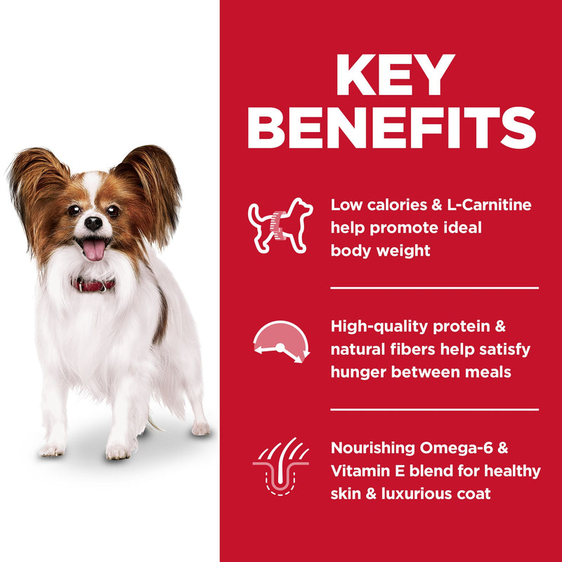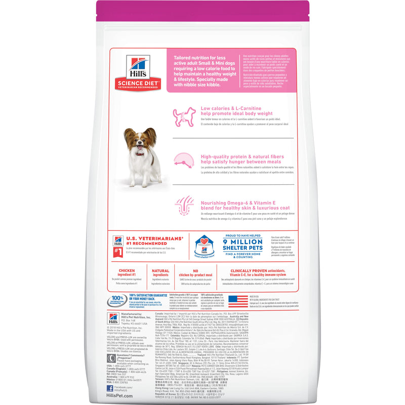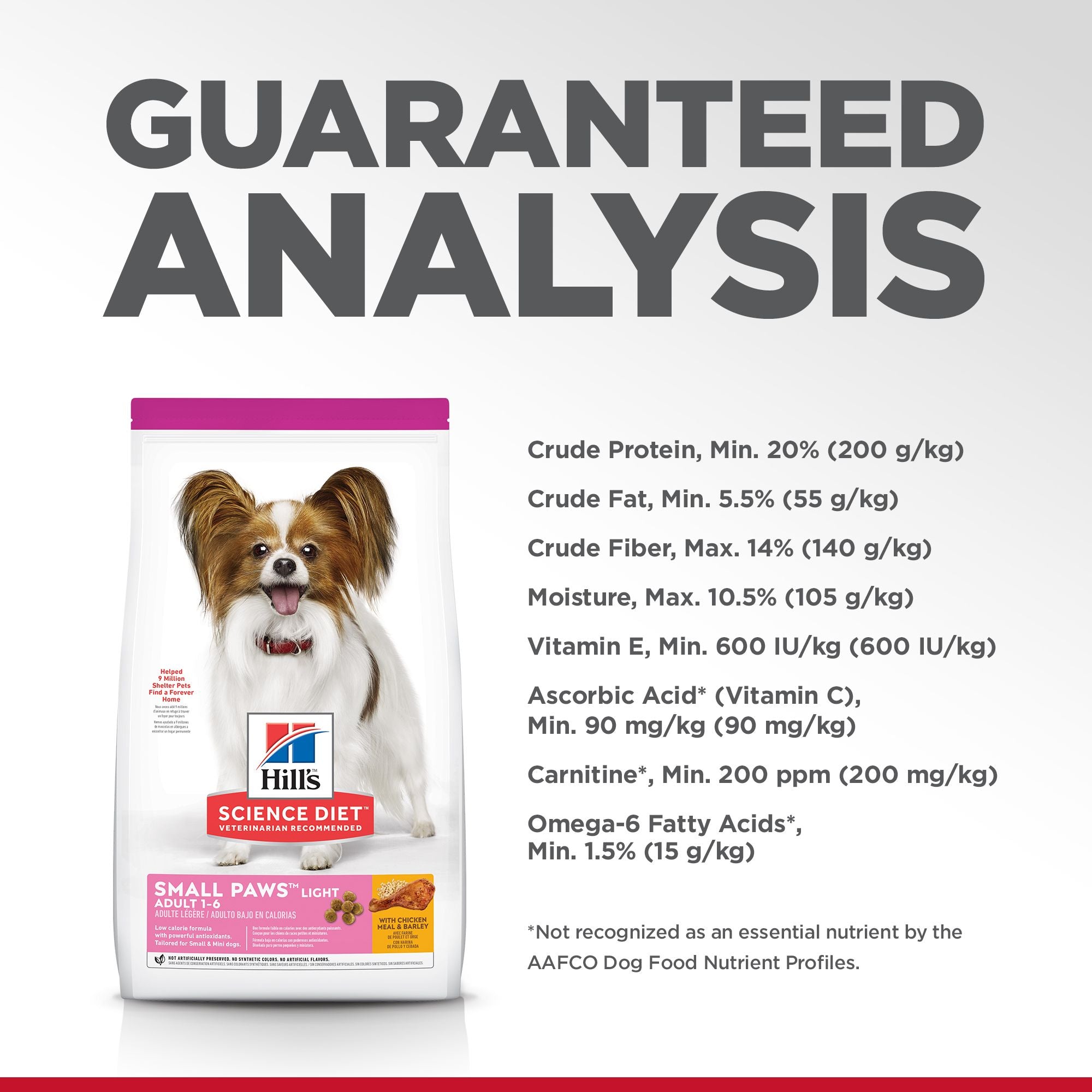 Shop / Dog Food / Hill's Science Diet Adult Light Small Paws Dry Dog Food, Chicken Meal & Barley Hill's Science Diet Adult Light Small Paws Dry Dog Food, Chicken Meal & Barley Hill's Science Diet 4.5 lb $23.99 4.5 lb Purchase Options Free In-Store Pick Up Not Available Save 10% on orders $49+ Set your store for inventory and store pickup details Zip Code Search Same-day Delivery* No minimum charge for delivery orders. *Order before 2pm and have it delivered today. Orders placed after 2pm will be delivered the next day. Must be inside delivery radius. Zip Code Unfortunately delivery is not available to this address. In order to ensure the best availability accuracy, changing your selected store will remove all items from your cart. You will need to re-add these items with your newly selected store if you choose to continue. Continue Cancel Ship it to Me Quantity Add To Cart Feeding guide disclaimer ✕ Feeding guides provide a starting point for the amount of food to give your pet each day. We recommend that you keep your pet in ideal body condition and not allow them to become overweight. The amount of food your pet needs can vary based on age, activity level or other food and treats given, so be sure to work with your veterinarian to determine an appropriate weight for your pet, and to make any necessary adjustments to their feeding. Information Big on Love, Small in Size.™ Hill's® Science Diet® Small Paws™ Light Adult dog food is tailored nutrition for less active adult Small & Mini dogs requiring a low calorie food to help maintain a healthy weight & lifestyle. Specially made with nibble size kibble. Low calories & L-Carnitine help promote ideal body weight, support healthy mobility & maintain heart function High-quality protein & natural fibers help satisfy hunger between meals Nourishing Omega-6 & Vitamin E blend for healthy skin & luxurious coat Contains our special Small & Mini antioxidant blend for lifelong immune support Ingredients Chicken Meal, Cracked Pearled Barley, Pea Fiber, Whole Grain Wheat, Whole Grain Corn, Corn Gluten Meal, Whole Grain Sorghum, Powdered Cellulose, Chicken Liver Flavor, Soybean Oil, Dried Beet Pulp, Flaxseed, Lactic Acid, Pork Flavor, Potassium Chloride, L-Lysine, Iodized Salt, vitamins (Vitamin E Supplement, L-Ascorbyl-2-Polyphosphate (source of Vitamin C), Niacin Supplement, Thiamine Mononitrate, Vitamin A Supplement, Calcium Pantothenate, Riboflavin Supplement, Biotin, Vitamin B12 Supplement, Pyridoxine Hydrochloride, Folic Acid, Vitamin D3 Supplement), Choline Chloride, Calcium Carbonate, minerals (Ferrous Sulfate, Zinc Oxide, Copper Sulfate, Manganous Oxide, Calcium Iodate, Sodium Selenite), Taurine, Oat Fiber, Mixed Tocopherols for freshness, L-Carnitine, Natural Flavors, Beta-Carotene, Apples, Broccoli, Carrots, Cranberries, Green Peas. Guaranteed Analysis Nutrient GA Min GA Max As Fed Dry Matter Caloric Basis Protein 20 % 23 % 25.3 % 7.7 g / 100 kcal Fat 5.5 % 7.6 % 8.4 % 2.5 g / 100 kcal Carbohydrate / NFE 43.8 % 48.1 % 14.7 g / 100 kcal Crude Fiber 14 % 11.3 % 12.4 % 3.8 g / 100 kcal Calcium 0.86 % 0.94 % 287 mg / 100 kcal Phosphorus 0.63 % 0.69 % 209 mg / 100 kcal Potassium 0.73 % 0.8 % 245 mg / 100 kcal Sodium 0.26 % 0.29 % 88 mg / 100 kcal Magnesium 0.123 % 0.135 % 41 mg / 100 kcal Vitamin C 90 mg/kg 112 ppm 124 ppm 3.76 mg / 100 kcal Vitamin E 600 IU/kg 923 IU/kg 1014 IU/kg 30.9 IU / 100 kcal Total Omega-3 FA 0.57 % 0.63 % 192 mg / 100 kcal Total Omega-6 FA 1.5 % 2.84 % 3.12 % 949 mg / 100 kcal Customers also liked Customer Reviews