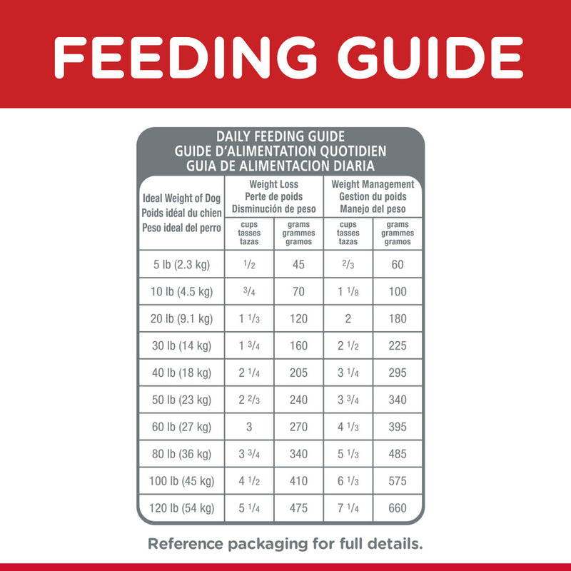Shop / Dog Food / Hill's Science Diet Adult Light with Chicken Meal & Barley Dry Dog Food Hill's Science Diet Adult Light with Chicken Meal & Barley Dry Dog Food Hill's Science Diet $48.99 15 lb 30 lb 15-lb 30-lb Purchase Options Free In-Store Pick Up Not Available Save 10% on orders $49+ Set your store for inventory and store pickup details Zip Code Search Same-day Delivery* No minimum charge for delivery orders. *Order before 2pm and have it delivered today. Orders placed after 2pm will be delivered the next day. Must be inside delivery radius. Zip Code Unfortunately delivery is not available to this address. In order to ensure the best availability accuracy, changing your selected store will remove all items from your cart. You will need to re-add these items with your newly selected store if you choose to continue. Continue Cancel Ship it to Me Quantity Add To Cart Feeding guide disclaimer ✕ Feeding guides provide a starting point for the amount of food to give your pet each day. We recommend that you keep your pet in ideal body condition and not allow them to become overweight. The amount of food your pet needs can vary based on age, activity level or other food and treats given, so be sure to work with your veterinarian to determine an appropriate weight for your pet, and to make any necessary adjustments to their feeding. Information Just because your adult dog has a big appetite, it doesn't mean his or her pet food should be big in calories. Hill's® Science Diet® Light Adult dry dog food is precise nutrition for less active adult dogs requiring a low-calorie food to help maintain a healthy weight & lifestyle. This premium dog food made with natural ingredients provides L-carnitine to promote healthy heart function in your canine friend. vitamin E and omega-6s work to nourish your dog's skin and coat, while quality protein and natural fibers keep your adult dog full between meals. There’s more to love with the new look of Science Diet®. Some of our products also have new names, new kibble shapes & new formulas. ▸ 18% fewer calories vs. Science Diet® Adult ▸ Provides L-carnitine to promote healthy body weight & heart function ▸ Quality protein and natural fibers help keep your dog satisfied between meals ▸ Supports healthy skin and coat with omega-6 fatty acids and vitamin E ▸ Made with natural ingredients Ingredients Chicken Meal, Cracked Pearled Barley, Pea Fiber, Whole Grain Wheat, Whole Grain Corn, Corn Gluten Meal, Whole Grain Sorghum, Powdered Cellulose, Chicken Liver Flavor, Soybean Oil, Dried Beet Pulp, Flaxseed, Lactic Acid, Pork Flavor, Potassium Chloride, L-Lysine, Iodized Salt, Choline Chloride, Calcium Carbonate, vitamins (Vitamin E Supplement, L-Ascorbyl-2-Polyphosphate (source of Vitamin C), Niacin Supplement, Thiamine Mononitrate, Vitamin A Supplement, Calcium Pantothenate, Riboflavin Supplement, Biotin, Vitamin B12 Supplement, Pyridoxine Hydrochloride, Folic Acid, Vitamin D3 Supplement), minerals (Ferrous Sulfate, Zinc Oxide, Copper Sulfate, Manganous Oxide, Calcium Iodate, Sodium Selenite), Taurine, Oat Fiber, Mixed Tocopherols for freshness, L-Carnitine, Natural Flavors, Beta-Carotene, Apples, Broccoli, Carrots, Cranberries, Green Peas. Guaranteed Analysis Nutrient Guaranteed Units Crude Protein 25.3 % Crude Fat 8.4 % Carbohydrates 48.2 % Calcium 0.92 % Phosphorus 0.69 % Potassium 0.81 % Sodium 0.29 % Magnesium 0.135 % Vitamin C 124 ppm Vitamin E 675 IU/kg Omega-3 Fatty Acids 0.63 % Omega-6 Fatty Acids 3.12 % Customers also liked Customer Reviews