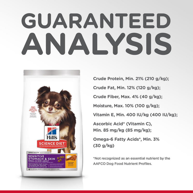 Shop / Dog Food / Hill's Science Diet Adult Sensitive Stomach & Skin Small & Mini Breed Chicken Recipe Dry Dry Dog Food Hill's Science Diet Adult Sensitive Stomach & Skin Small & Mini Breed Chicken Recipe Dry Dry Dog Food Hill's Science Diet Weight: 4 lb $23.99 4-lb Purchase Options Free In-Store Pick Up Not Available Save 10% on orders $49+ Set your store for inventory and store pickup details Zip Code Search Same-day Delivery* No minimum charge for delivery orders. *Order before 2pm and have it delivered today. Orders placed after 2pm will be delivered the next day. Must be inside delivery radius. Zip Code Unfortunately delivery is not available to this address. In order to ensure the best availability accuracy, changing your selected store will remove all items from your cart. You will need to re-add these items with your newly selected store if you choose to continue. Continue Cancel Ship it to Me Quantity Add To Cart Feeding guide disclaimer ✕ Feeding guides provide a starting point for the amount of food to give your pet each day. We recommend that you keep your pet in ideal body condition and not allow them to become overweight. The amount of food your pet needs can vary based on age, activity level or other food and treats given, so be sure to work with your veterinarian to determine an appropriate weight for your pet, and to make any necessary adjustments to their feeding. Information At Hill’s, we study pets’ biology to understand how nutrition impacts digestive & skin health. Prebiotic fiber is important for the gut microbiome, the unique mix of bacteria essential for a healthy digestive system. Vitamin E, Omega-6s & other nutrients help maintain & protect skin. Hill's® Science Diet® Sensitive Stomach & Skin Small & Mini dry dog food provides optimal digestive health while nourishing skin & promoting a lustrous coat. • Prebiotic fiber to fuel beneficial gut bacteria & support a balanced microbiome • High digestibility for optimal nutrient absorption & easier stool pick-up • Vitamin E & Omega-6 fatty acids for skin nourishment Ingredients Chicken, Brewers Rice, Chicken Meal, Yellow Peas, Cracked Pearled Barley, Whole Grain Sorghum, Egg Product, Chicken Fat, Soybean Oil, Brown Rice, Dried Beet Pulp, Chicken Liver Flavor, Lactic Acid, Pork Liver Flavor, Potassium Chloride, Flaxseed, vitamins (Vitamin E Supplement, L-Ascorbyl-2-Polyphosphate (source of Vitamin C), Niacin Supplement, Thiamine Mononitrate, Vitamin A Supplement, Calcium Pantothenate, Riboflavin Supplement, Biotin, Vitamin B12 Supplement, Pyridoxine Hydrochloride, Folic Acid, Vitamin D3 Supplement), Iodized Salt, Choline Chloride, Taurine, minerals (Ferrous Sulfate, Zinc Oxide, Copper Sulfate, Manganous Oxide, Calcium Iodate, Sodium Selenite), Mixed Tocopherols for freshness, Oat Fiber, Natural Flavors, Beta-Carotene, Apples, Broccoli, Carrots, Cranberries, Green Peas. Guaranteed Analysis Nutrient Guaranteed Units Crude Protein 26.0 % Crude Fat 15.9 % Crude Fiber 1.3 % Carbohydrates 51.4 % Calcium 0.97 % Phosphorus 0.79 % Potassium 0.74 % Sodium 0.29 % Magnesium 0.099 % Vitamin C 217 ppm Vitamin E 1038 IU/kg Omega-3 Fatty Acids 0.50 % Omega-6 Fatty Acids 4.57 % Customers also liked Customer Reviews