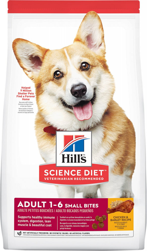 Shop / Dog Food / Hill's Science Diet Adult Small Bites Chicken & Barley Recipe Dry Dog Food Hill's Science Diet Adult Small Bites Chicken & Barley Recipe Dry Dog Food Hill's Science Diet $20.99 5 lb 15 lb 35 lb 5-lb 15-lb 35-lb Purchase Options Free In-Store Pick Up Not Available Save 10% on orders $49+ Set your store for inventory and store pickup details Zip Code Search Same-day Delivery* No minimum charge for delivery orders. *Order before 2pm and have it delivered today. Orders placed after 2pm will be delivered the next day. Must be inside delivery radius. Zip Code Unfortunately delivery is not available to this address. In order to ensure the best availability accuracy, changing your selected store will remove all items from your cart. You will need to re-add these items with your newly selected store if you choose to continue. Continue Cancel Ship it to Me Quantity Add To Cart Feeding guide disclaimer ✕ Feeding guides provide a starting point for the amount of food to give your pet each day. We recommend that you keep your pet in ideal body condition and not allow them to become overweight. The amount of food your pet needs can vary based on age, activity level or other food and treats given, so be sure to work with your veterinarian to determine an appropriate weight for your pet, and to make any necessary adjustments to their feeding. Information Your little pup is growing at a fast rate, and you'll need a quality dog food that can keep up with his or her growing needs. Hill’s Science Diet Puppy dry food provides the right balance of ingredients and minerals to support the puppy development, so they get the best start in life & grow to their full potential. To help your growing dog's brain and eye development, this puppy food made with natural ingredients contains DHA from fish oil, as well as quality protein for lean muscle growth. The balanced set of minerals helps promote your puppy's bones, as well as strong, healthy teeth. Plus, it's formulated with decades of cutting-edge research to be a great-tasting dog food puppies can truly enjoy. There’s more to love with the new look of Science Diet®. Some of our products also have new names, new kibble shapes & new formulas. • This dry puppy food is formulated to support a healthy immune system and overall growth for puppies • This puppy food provides DHA from fish oil for healthy brain & eye development • Supports lean muscle growth with quality protein Uses a balanced set of minerals to promote strong bones and strong teeth in young dogs • Made with natural ingredients • #1 Veterinarian Recommended Supports healthy brain, eye, muscle, bone & immune system development in growing puppies Ingredients Chicken, Cracked Pearled Barley, Whole Grain Wheat, Whole Grain Corn, Whole Grain Sorghum, Corn Gluten Meal, Soybean Meal, Chicken Fat, Chicken Liver Flavor, Brewers Rice, Chicken Meal, Dried Beet Pulp, Soybean Oil, Pork Flavor, Lactic Acid, Calcium Carbonate, Flaxseed, Potassium Chloride, Choline Chloride, Iodized Salt, vitamins (Vitamin E Supplement, L-Ascorbyl-2-Polyphosphate (source of Vitamin C), Niacin Supplement, Thiamine Mononitrate, Vitamin A Supplement, Calcium Pantothenate, Riboflavin Supplement, Biotin, Vitamin B12 Supplement, Pyridoxine Hydrochloride, Folic Acid, Vitamin D3 Supplement), Taurine, minerals (Ferrous Sulfate, Zinc Oxide, Copper Sulfate, Manganous Oxide, Calcium Iodate, Sodium Selenite), Oat Fiber, Mixed Tocopherols for freshness, Natural Flavors, Beta-Carotene, Apples, Broccoli, Carrots, Cranberries, Green Peas. Guaranteed Analysis Nutrient Guaranteed Units Crude Protein 23.9 % Crude Fat 14.7 % Crude Fiber 2.1 % Carbohydrates 53.9 % Calcium 0.77 % Phosphorus 0.57 % Potassium 0.76 % Sodium 0.3 % Magnesium 0.115 % Vitamin C 108 ppm Vitamin E 525 IU/kg Omega-3 Fatty Acids 0.5 % Omega-6 Fatty Acids 4.3 % Customers also liked Customer Reviews