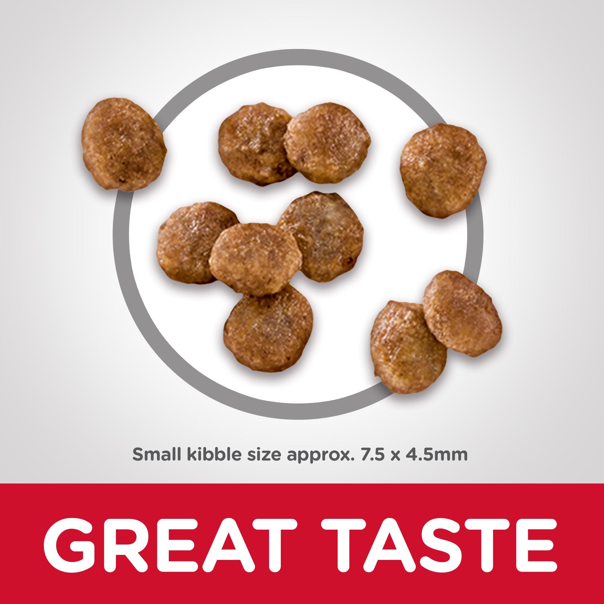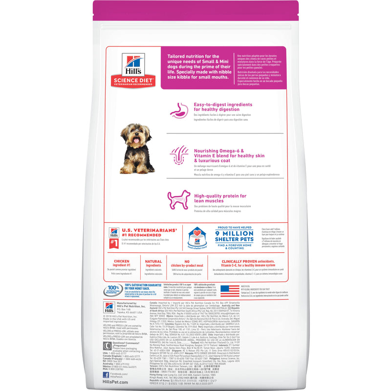 Shop / Dog Food / Hill's Science Diet Adult Small Paws Dry Dog Food, Chicken Meal & Rice Recipe Hill's Science Diet Adult Small Paws Dry Dog Food, Chicken Meal & Rice Recipe Hill's Science Diet 4.5 lb $23.99 4.5 lb Purchase Options Free In-Store Pick Up Not Available Save 10% on orders $49+ Set your store for inventory and store pickup details Zip Code Search Same-day Delivery* No minimum charge for delivery orders. *Order before 2pm and have it delivered today. Orders placed after 2pm will be delivered the next day. Must be inside delivery radius. Zip Code Unfortunately delivery is not available to this address. In order to ensure the best availability accuracy, changing your selected store will remove all items from your cart. You will need to re-add these items with your newly selected store if you choose to continue. Continue Cancel Ship it to Me Quantity Add To Cart Feeding guide disclaimer ✕ Feeding guides provide a starting point for the amount of food to give your pet each day. We recommend that you keep your pet in ideal body condition and not allow them to become overweight. The amount of food your pet needs can vary based on age, activity level or other food and treats given, so be sure to work with your veterinarian to determine an appropriate weight for your pet, and to make any necessary adjustments to their feeding. Information Big on Love, Small in Size.™ Hill's® Science Diet® Small Paws™ Adult dry dog food is tailored nutrition for the unique needs of Small & Mini dogs during the prime of their life. Specially made with nibble size kibble. Easy-to-digest ingredients for healthy digestion Nourishing Omega-6 & Vitamin E blend for healthy skin & luxurious coat High-quality protein for lean muscles Contains our special Small & Mini antioxidant blend for lifelong immune support Ingredients Chicken Meal, Brewers Rice, Whole Grain Wheat, Soybean Meal, Whole Grain Sorghum, Chicken Fat, Cracked Pearled Barley, Whole Grain Corn, Chicken Liver Flavor, Pork Liver Flavor, Flaxseed, Lactic Acid, Soybean Oil, Green Peas, Apples, vitamins (Vitamin E Supplement, L-Ascorbyl-2-Polyphosphate (source of Vitamin C), Niacin Supplement, Thiamine Mononitrate, Vitamin A Supplement, Calcium Pantothenate, Riboflavin Supplement, Biotin, Vitamin B12 Supplement, Pyridoxine Hydrochloride, Folic Acid, Vitamin D3 Supplement), Cranberries, Potassium Chloride, L-Lysine, Iodized Salt, Carrots, Choline Chloride, Broccoli, Taurine, minerals (Ferrous Sulfate, Zinc Oxide, Copper Sulfate, Manganous Oxide, Calcium Iodate, Sodium Selenite), Mixed Tocopherols for freshness, Natural Flavors, L-Carnitine, Beta-Carotene. Guaranteed Analysis Nutrient GA Min GA Max As Fed Dry Matter Caloric Basis Protein 20 % 22.9 % 24.9 % 6.1 g / 100 kcal Fat 12.5 % 15.1 % 16.4 % 4 g / 100 kcal Carbohydrate / NFE 47.2 % 51.3 % 12.6 g / 100 kcal Crude Fiber 4 % 1.6 % 1.8 % 0.4 g / 100 kcal Calcium 0.86 % 0.94 % 230 mg / 100 kcal Phosphorus 0.72 % 0.78 % 192 mg / 100 kcal Potassium 0.75 % 0.82 % 202 mg / 100 kcal Sodium 0.27 % 0.3 % 73 mg / 100 kcal Magnesium 0.12 % 0.13 % 32 mg / 100 kcal Vitamin C 90 ppm 240 ppm 260 ppm 6.41 mg / 100 kcal Vitamin E 700 IU/kg 1345 IU/kg 1462 IU/kg 35.96 IU / 100 kcal Total Omega-3 FA 0.61 % 0.66 % 162 mg / 100 kcal Total Omega-6 FA 2.5 % 3.52 % 3.83 % 941 mg / 100 kcal Customers also liked Customer Reviews
