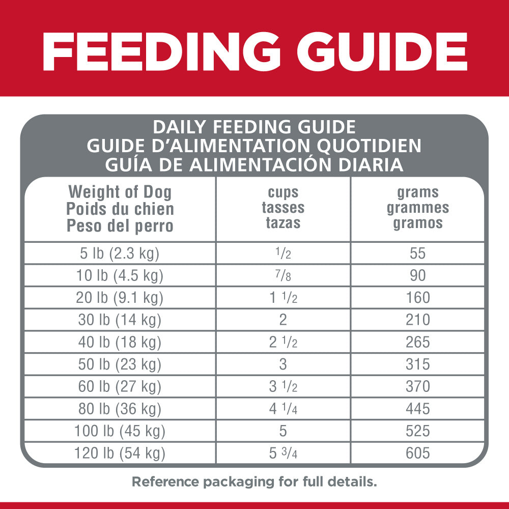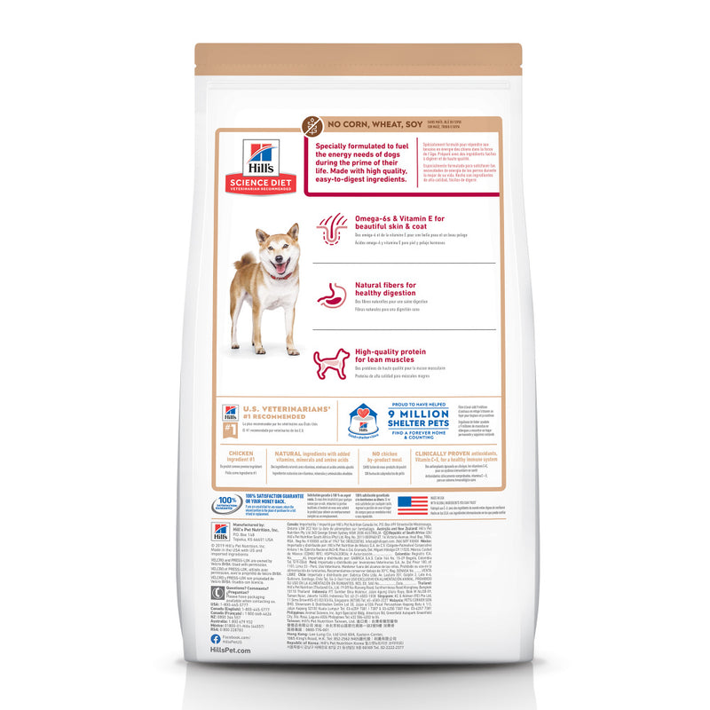 Shop / Dog Food / Hill's Science Diet No Corn, Wheat, Soy Chicken Adult Dry Dog Food Hill's Science Diet No Corn, Wheat, Soy Chicken Adult Dry Dog Food Hill's Science Diet $23.99 4 lb 15 lb 30 lb 4-lb 15-lb 30-lb Purchase Options Free In-Store Pick Up Not Available Save 10% on orders $49+ Set your store for inventory and store pickup details Zip Code Search Same-day Delivery* No minimum charge for delivery orders. *Order before 2pm and have it delivered today. Orders placed after 2pm will be delivered the next day. Must be inside delivery radius. Zip Code Unfortunately delivery is not available to this address. In order to ensure the best availability accuracy, changing your selected store will remove all items from your cart. You will need to re-add these items with your newly selected store if you choose to continue. Continue Cancel Ship it to Me Quantity Add To Cart Feeding guide disclaimer ✕ Feeding guides provide a starting point for the amount of food to give your pet each day. We recommend that you keep your pet in ideal body condition and not allow them to become overweight. The amount of food your pet needs can vary based on age, activity level or other food and treats given, so be sure to work with your veterinarian to determine an appropriate weight for your pet, and to make any necessary adjustments to their feeding. Information Now you can feed the biology-based nutrition of Hill’s Science Diet in recipes with no corn, wheat or soy. This dry dog food is made in the USA with global ingredients you can trust to provide the right balance of nutrients adult dogs need. It uses natural fibers for healthy digestion, high-quality protein for lean muscles, and omega-6s and vitamin E for beautiful skin and coat, and uses natural ingredients fortified with added vitamins, minerals and amino acids. Delicious and nutritious, Hill’s Science Diet No Corn, Wheat, Soy adult dog food is formulated with ingredients to support heart health and fuel the energy needs of your dog during the prime of their life. • Biology-based nutrition of Science Diet with no corn, wheat or soy • High-quality protein for lean muscles • Omega-6s and vitamin E for beautiful skin and coat • Supports a healthy immune system and is easy to digest • Dry dog food made with natural ingredients • Formulated with ingredients to support heart health • From Hill’s, the #1 Veterinarian Recommended pet food brand Ingredients Chicken, Brown Rice, Brewers Rice, Cracked Pearled Barley, Chicken Meal, Whole Grain Oats, Chicken Fat, Pea Protein, Flaxseed, Dried Beet Pulp, Chicken Liver Flavor, Lactic Acid, Potassium Chloride, Iodized Salt, Choline Chloride, Green Peas, DL-Methionine, Apples, vitamins (Vitamin E Supplement, L-Ascorbyl-2-Polyphosphate (source of Vitamin C), Niacin Supplement, Thiamine Mononitrate, Vitamin A Supplement, Calcium Pantothenate, Vitamin B12 Supplement, Pyridoxine Hydrochloride, Riboflavin Supplement, Biotin, Folic Acid, Vitamin D3 Supplement), Cranberries, Calcium Carbonate, Carrots, minerals (Ferrous Sulfate, Zinc Oxide, Copper Sulfate, Manganous Oxide, Calcium Iodate, Sodium Selenite), Taurine, Broccoli, Mixed Tocopherols for freshness, Natural Flavors, Beta-Carotene. Guaranteed Analysis Nutrient Guaranteed Units Crude Protein 23.6 % Crude Fat 16.4 % Carbohydrates 52.0 % Crude Fiber 1.7 % Calcium 0.96 % Phosphorus 0.77 % Potassium 0.88 % Sodium 0.38 % Magnesium 0.116% Vitamin C 182 ppm Vitamin E 705 IU/kg Omega-3 Fatty Acids 0.95 % Omega-6 Fatty Acids 3.56 % Customers also liked Customer Reviews