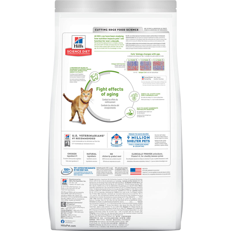 Shop / Cat Food / Hill's Science Diet Senior 7+ Senior Vitality Dry Cat Food, Chicken & Rice Recipe Hill's Science Diet Senior 7+ Senior Vitality Dry Cat Food, Chicken & Rice Recipe Hill's Science Diet 13lb $64.99 13lb Purchase Options Free In-Store Pick Up Not Available Save 10% on orders $49+ Set your store for inventory and store pickup details Zip Code Search Same-day Delivery* No minimum charge for delivery orders. *Order before 2pm and have it delivered today. Orders placed after 2pm will be delivered the next day. Must be inside delivery radius. Zip Code Unfortunately delivery is not available to this address. In order to ensure the best availability accuracy, changing your selected store will remove all items from your cart. You will need to re-add these items with your newly selected store if you choose to continue. Continue Cancel Ship it to Me Quantity Add To Cart Feeding guide disclaimer ✕ Feeding guides provide a starting point for the amount of food to give your pet each day. We recommend that you keep your pet in ideal body condition and not allow them to become overweight. The amount of food your pet needs can vary based on age, activity level or other food and treats given, so be sure to work with your veterinarian to determine an appropriate weight for your pet, and to make any necessary adjustments to their feeding. Information Hill's Science Diet Adult 7+ Senior Vitality Chicken & Rice cat food provides precisely balanced nutrition to improve everyday ability to get up and go in your Adult 7+ cat. A proprietary blend of ingredients supports brain health, interaction, energy & vitality Promotes a healthy fur with Vitamin E and Omega-6 fatty acids Easy-to-digest ingredients for healthy digestion Ingredients Chicken, Brown Rice, Corn Gluten Meal, Whole Grain Oats, Pea Protein, Chicken Fat, Chicken Liver Flavor, Lactic Acid, Soybean Oil, Dried Tomato Pomace, Calcium Sulfate, Fish Oil, Choline Chloride, DL-Methionine, Iodized Salt, Taurine, Broccoli, vitamins (Vitamin E Supplement, L-Ascorbyl-2-Polyphosphate (source of Vitamin C), Niacin Supplement, Thiamine Mononitrate, Vitamin A Supplement, Calcium Pantothenate, Riboflavin Supplement, Biotin, Vitamin B12 Supplement, Pyridoxine Hydrochloride, Folic Acid, Vitamin D3 Supplement), Potassium Chloride, minerals (Ferrous Sulfate, Zinc Oxide, Copper Sulfate, Manganous Oxide, Calcium Iodate, Sodium Selenite), L-Carnitine, Calcium Carbonate, Natural Flavors, Mixed Tocopherols for freshness, Beta-Carotene. Guaranteed Analysis Nutrient GA Min GA Max As Fed Dry Matter Caloric Basis Protein 30 % 33.3 % 35.4 % 8.6 g / 100 kcal Fat 13 % 15.5 % 16.5 % 4 g / 100 kcal Carbohydrate / NFE 38.7 % 41.2 % 10 g / 100 kcal Crude Fiber 3 % 1.3 % 1.4 % 0.3 g / 100 kcal Calcium 0.67 % 0.71 % 173 mg / 100 kcal Phosphorus 0.63 % 0.67 % 163 mg / 100 kcal Potassium 0.59 % 0.62 % 151 mg / 100 kcal Sodium 0.36 % 0.38 % 93 mg / 100 kcal Magnesium 0.098 % 0.104 % 25 mg / 100 kcal Taurine 0.38 % 0.4 % 97 mg / 100 kcal Vitamin C 100 mg/kg 193 ppm 205 ppm 4.98 mg / 100 kcal Vitamin E 650 IU/kg 1037 IU/kg 1103 IU/kg 26.78 IU / 100 kcal Total Omega-3 FA 0.25 % 0.44 % 0.47 % 113 mg / 100 kcal Total Omega-6 FA 2 % 3.78 % 4.02 % 978 mg / 100 kcal Carnitine 573 ppm 609.5 ppm 14.81 mg / 100 kcal Customers also liked Customer Reviews