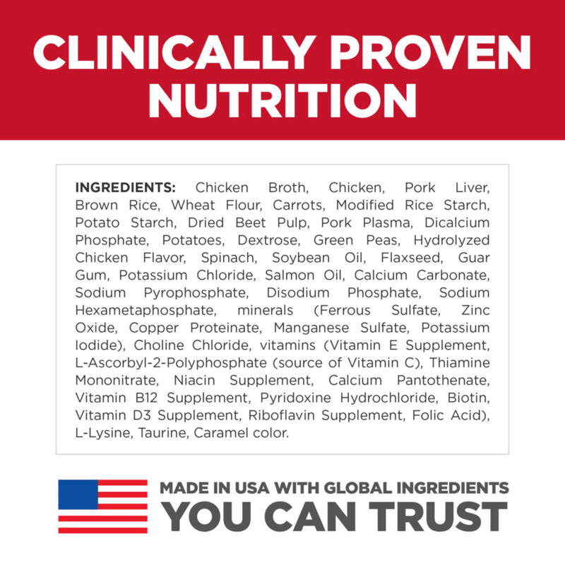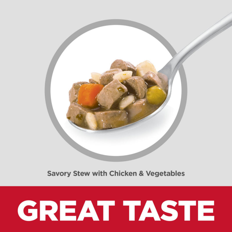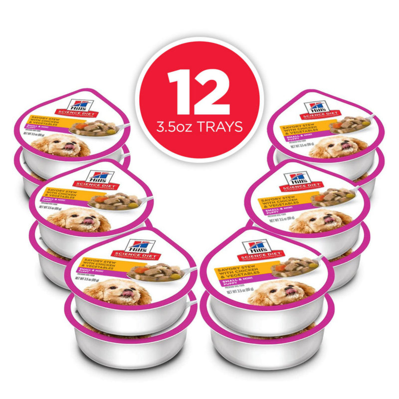 Shop / Wet Food / Hill's Science Diet Small & Toy Breed Puppy Savory Chicken & Vegetable Stew Dog Food Trays Hill's Science Diet Small & Toy Breed Puppy Savory Chicken & Vegetable Stew Dog Food Trays Hill's Science Diet Weight: 3.5 oz, case of 12 $34.99 3.5-oz, case of 12 Purchase Options Free In-Store Pick Up Not Available Save 10% on orders $49+ Set your store for inventory and store pickup details Zip Code Search Same-day Delivery* No minimum charge for delivery orders. *Order before 2pm and have it delivered today. Orders placed after 2pm will be delivered the next day. Must be inside delivery radius. Zip Code Unfortunately delivery is not available to this address. In order to ensure the best availability accuracy, changing your selected store will remove all items from your cart. You will need to re-add these items with your newly selected store if you choose to continue. Continue Cancel Ship it to Me Quantity Add To Cart Feeding guide disclaimer ✕ Feeding guides provide a starting point for the amount of food to give your pet each day. We recommend that you keep your pet in ideal body condition and not allow them to become overweight. The amount of food your pet needs can vary based on age, activity level or other food and treats given, so be sure to work with your veterinarian to determine an appropriate weight for your pet, and to make any necessary adjustments to their feeding. Information Hill's Science Diet Puppy Small & Mini Savory Stew with Chicken & Vegetables is a delicious small-breed dog food containing high-quality ingredients to ensure availability of key nutrients for the healthy development of your small-breed puppy. These convenient, single-serve trays contain real chicken, brown rice, and a medley of delectable vegetables all smothered in tasty gravy. This small dog food is made with natural ingredients and easy for your young dog to digest. Big on Love, Small in Size, this little dog food is a great source of high-quality protein, you'll help support muscle development in your tiny pup. There’s more to love with the new look of Science Diet. Some of our products also have new names & new formulas.Why We Love It Puppy food with quality ingredients for healthy development High-quality protein to help your pup build and maintain lean muscles Mouthwatering wet food made with natural ingredients in a convenient, single-serve tray. For more than 75 years, Hill's Pet Nutrition has helped enrich and lengthen the special relationship between people and their pets by putting their passion for the health and happiness of animals into everything they do. They even partner with shelters to provide Hill's food to more than 12 million shelter pets over the past 20 years. Ingredients Chicken Broth, Chicken, Pork Liver, Brown Rice, Wheat Flour, Carrots, Modified Rice Starch, Potato Starch, Dried Beet Pulp, Pork Plasma, Dicalcium Phosphate, Potatoes, Dextrose, Green Peas, Hydrolyzed Chicken Flavor, Spinach, Soybean Oil, Flaxseed, Guar Gum, Potassium Chloride, Salmon Oil, Calcium Carbonate, Sodium Pyrophosphate, Disodium Phosphate, Sodium Hexametaphosphate, minerals (Ferrous Sulfate, Zinc Oxide, Copper Proteinate, Manganese Sulfate, Potassium Iodide), Choline Chloride, vitamins (Vitamin E Supplement, L-Ascorbyl-2-Polyphosphate (source of Vitamin C), Thiamine Mononitrate, Niacin Supplement, Calcium Pantothenate, Vitamin B12 Supplement, Pyridoxine Hydrochloride, Biotin, Vitamin D3 Supplement, Riboflavin Supplement, Folic Acid), L-Lysine, Taurine, Caramel color. NutrientGA MinGA MaxAs FedDry MatterCaloric BasisProtein5.5 %6.8 %30.7 %7.4 g / 100 kcalFat3 %4 %18.1 %4.4 g / 100 kcalCarbohydrate / NFE8.8 %40.1 %9.7 g / 100 kcalCrude Fiber1.5 %0.4 %1.8 %0.4 g / 100 kcalCalcium0.37 %1.69 %407 mg / 100 kcalPhosphorus0.34 %1.53 %368 mg / 100 kcalPotassium0.18 %0.84 %203 mg / 100 kcalSodium0.13 %0.59 %143 mg / 100 kcalMagnesium0.017 %0.075 %18 mg / 100 kcalVitamin C49 ppm223 ppm5.38 mg / 100 kcalVitamin E183 IU/kg832 IU/kg20.08 IU / 100 kcalDHA0.002 %0.008 %1.9 mg / 100 kcal>20C Omega-3 FA0.01 %0.02 %6 mg / 100 kcal>20C Omega-6 FA0.03 %0.14 %34 mg / 100 kcal Guaranteed Analysis Nutrient Guaranteed Units Crude Protein 30.7 % Crude Fat 18.1 % Carbohydrates 40 % Crude Fiber 1.8 % Calcium 1.69 % Phosphorus 1.53 % Potassium 0.84 % Sodium 0.59 % Magnesium 0.075 % Vitamin C 223 ppm Vitamin E 832 IU/kg DHA 0.008 % Omega-3 Fatty Acids 0.15 % Omega-6 Fatty Acids 1.23 % Customers also liked Customer Reviews