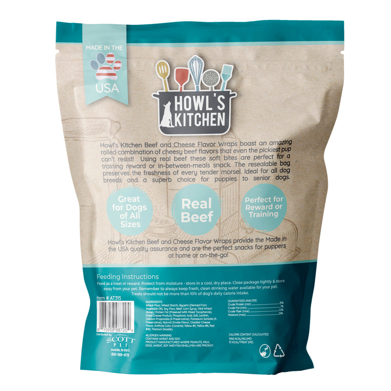 Shop / Unknown Type / Howl's Kitchen 12OZ Beef & Cheese Flavor Wraps Dog Treats Howl's Kitchen 12OZ Beef & Cheese Flavor Wraps Dog Treats Howl's Kitchen 12oz $4.99 12oz Purchase Options Free In-Store Pick Up Not Available Save 10% on orders $49+ Set your store for inventory and store pickup details Zip Code Search Same-day Delivery* No minimum charge for delivery orders. *Order before 2pm and have it delivered today. Orders placed after 2pm will be delivered the next day. Must be inside delivery radius. Zip Code Unfortunately delivery is not available to this address. In order to ensure the best availability accuracy, changing your selected store will remove all items from your cart. You will need to re-add these items with your newly selected store if you choose to continue. Continue Cancel Ship it to Me Quantity Add To Cart Feeding guide disclaimer ✕ Feeding guides provide a starting point for the amount of food to give your pet each day. We recommend that you keep your pet in ideal body condition and not allow them to become overweight. The amount of food your pet needs can vary based on age, activity level or other food and treats given, so be sure to work with your veterinarian to determine an appropriate weight for your pet, and to make any necessary adjustments to their feeding. Information In a dog’s world, there’s only one thing better than a pig-in-a-blanket, and that’s Howl's Kitchen Meaty Beef & Cheese Flavor Wraps. These soft, chewy snacks are made from scratch in the USA with high-quality ingredients for maximum flavor and texture. A delicious meaty center made with real beef is nestled inside a golden, cheesy wrap to create an irresistible taste that even the pickiest pooch can't resist!! These meaty, cheesy morsels are great for snacking and also make the ideal reward as a training treat when broken into smaller pieces. Your best friend will eagerly obey when mouthwatering beef and cheese are on the line. Ingredients Wheat Flour, Soy Flour, Wheat Starch, Beef, Vegetable Glycerin, Maple Flavor Corn Syrup, Chicken Fat (Preserved With Mixed Tocopherols), Vital Wheat Gluten, Dried Cheese Product, Phosphoric Acid, Salt, Lecithin, Calcium Propionate (A Preservative), Potassium Sorbate (A Preservative), Natural Smoke Flavor, Cheddar Cheese Flavor, Artificial Color (Caramel, Yellow #5, Yellow #6, Red #40, Titanium Dioxide). Guaranteed Analysis Crude Protein (min) 15.0% Crude Fat (min) 7.0% Crude Fiber (max) 1.5% Moisture (max) 29.0% Customers also liked Customer Reviews