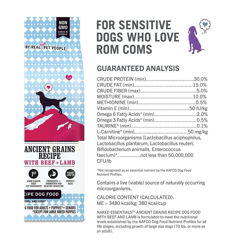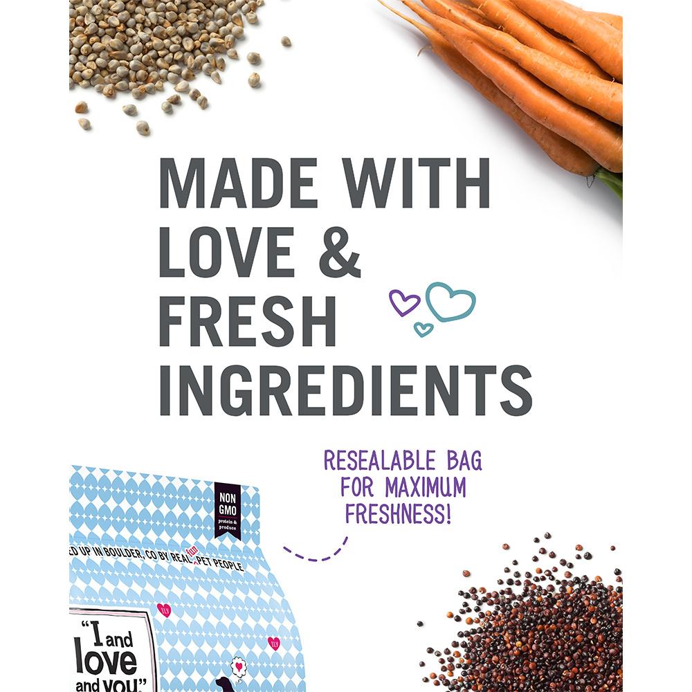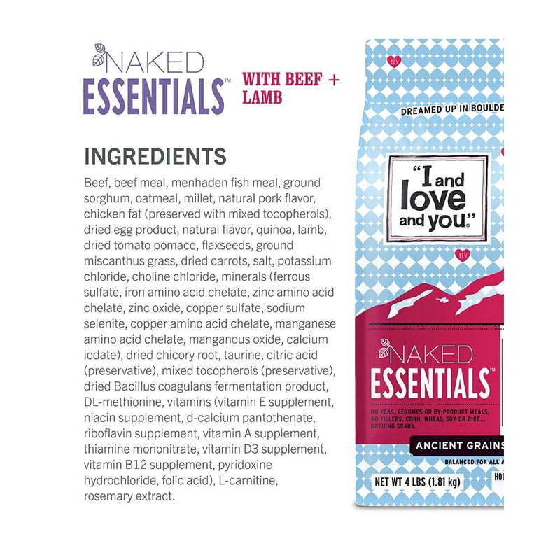 Shop / Dog Food / I and Love and You Naked Essentials Ancient Grains Beef & Lamb Recipe Dry Dog Food I and Love and You Naked Essentials Ancient Grains Beef & Lamb Recipe Dry Dog Food I and Love and You Weight: 23 lb $71.99 Sorry, this product is currently out of stock. Feeding guide disclaimer ✕ Feeding guides provide a starting point for the amount of food to give your pet each day. We recommend that you keep your pet in ideal body condition and not allow them to become overweight. The amount of food your pet needs can vary based on age, activity level or other food and treats given, so be sure to work with your veterinarian to determine an appropriate weight for your pet, and to make any necessary adjustments to their feeding. Information We are adding grains with a benefit to our new line of Naked Essentials Ancient Grains Dog Food- Sorghum, Oats, Millet & Quinoa. Ancient Grains Beef and Lamb brings all the benefits your dog loves from our Naked Essentials Line with the added bonus of good for you grains! No artificial ingredients EVER, prebiotics + probiotics for added digestistive benefits and real meat as the first ingredient, always.Why We Love It Farm Raised Beef 30% Protein Prebiotics & Probiotics for Healthy Digestion About I and Love and YouThe best love is the best food, and the best food should be available to ALL furry friends. Small and large, purebred and mixed, stray and rescue. We celebrate the incredible bond between human and pet. It’s why we’re called “I and love and you”. We get it. We are pet parents too—the type who match outfits with them, give them social media accounts, talk in their voices and bring their personalities to life, give up our beds to them, and stay home on Friday nights with them. Because love. Ingredients Beef, beef meal, menhaden fish meal, ground sorghum, oatmeal, millet, natural pork flavor, chicken fat (preserved with mixed tocopherols), dried egg product, natural flavor, quinoa, lamb, dried tomato pomace, flaxseeds, ground miscanthus grass, dried carrots, salt, potassium chloride, choline chloride, minerals (ferrous sulfate, iron amino acid chelate, zinc amino acid chelate, zinc oxide, copper sulfate, sodium selenite, copper amino acid chelate, manganese amino acid chelate, manganous oxide, calcium iodate), dried chicory root, taurine, citric acid (preservative), mixed tocopherols (preservative), dried Bacillus coagulans fermentation product, DL-methionine, vitamins (vitamin E supplement, niacin supplement, d-calcium pantothenate, riboflavin supplement, vitamin A supplement, thiamine mononitrate, vitamin D3 supplement, vitamin B12 supplement, pyridoxine hydrochloride, folic acid), L-carnitine, rosemary extract. Guaranteed Analysis Nutrient Guaranteed Units Crude Protein 30% min Crude Fat 15% min Crude Fiber 5% max Moisture 10% max Methionine 0.5% min Vitamin E 50 IU/kg min Omega-6 Fatty Acids 2% min Omega-3 Fatty Acids 0.5% min Taurine 0.1% min L-Carnitine 50 mg/kg min Customers also liked Customer Reviews