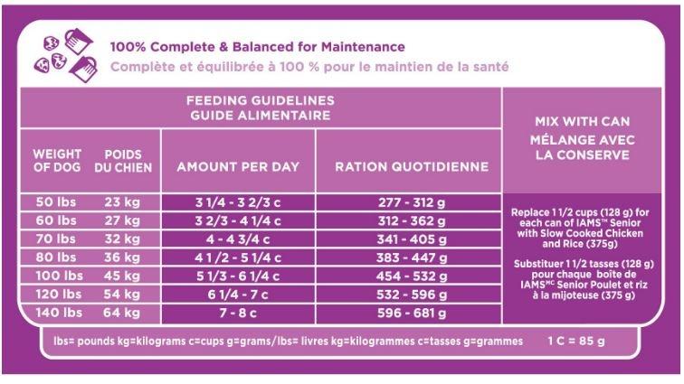 Shop / Dry Food / Iams ProActive Health Mature Adult Large Breed Dry Dog Food Iams ProActive Health Mature Adult Large Breed Dry Dog Food IAMS Weight: 30 lb $46.99 30-lb Purchase Options Free In-Store Pick Up Not Available Save 10% on orders $49+ Set your store for inventory and store pickup details Zip Code Search Same-day Delivery* No minimum charge for delivery orders. *Order before 2pm and have it delivered today. Orders placed after 2pm will be delivered the next day. Must be inside delivery radius. Zip Code Unfortunately delivery is not available to this address. In order to ensure the best availability accuracy, changing your selected store will remove all items from your cart. You will need to re-add these items with your newly selected store if you choose to continue. Continue Cancel Ship it to Me Quantity Add To Cart Feeding guide disclaimer ✕ Feeding guides provide a starting point for the amount of food to give your pet each day. We recommend that you keep your pet in ideal body condition and not allow them to become overweight. The amount of food your pet needs can vary based on age, activity level or other food and treats given, so be sure to work with your veterinarian to determine an appropriate weight for your pet, and to make any necessary adjustments to their feeding. Information Your big dog has big nutritional needs, especially as they get older, so feed them IAMS PROACTIVE HEALTH Mature Adult Large Breed Dog Food. IAMS’ delicious recipe is specifically formulated for your senior dog. With real chicken as the first ingredient, this dry dog food promotes strong muscles with quality protein. This IAMS recipe features wholesome grains and garnishes of veggies in every meal. It has all the essential vitamins and minerals big dogs need for healthy bones and joints and maintaining strong immune systems, plus a crunchy kibble that helps clean teeth. See why vets recommend IAMS: Give your old dog something new with IAMS PROACTIVE HEALTH Mature Adult Large Breed Dog Food, for nutrition as unique as they are. Contains one (1) 30 lb. bag of IAMS PROACTIVE HEALTH Mature Adult Large Breed Dog Food with Chicken Farm-raised chicken is the first ingredient in this formula and promotes muscle support in aging dogs Supports healthy energy with wholesome grains that provide essential nutrients and carbohydrates Helps maintain a strong immune system in mature adult dogs with antioxidants like vitamin E and beta-carotene Formulated with essential vitamins and minerals to meet the specific nutritional needs of senior large breed dogs Crunchy kibble that helps reduce plaque and tartar buildup as your big dog chews Ingredients Chicken, Ground Whole Grain Corn, Chicken By-Product Meal, Ground Whole Grain Sorghum, Dried Beet Pulp, Natural Flavor, Chicken Fat (preserved with mixed Tocopherols), Dried Egg Product, Fish Oil (preserved with mixed Tocopherols), Potassium Chloride, Dried Brewers Yeast, Dicalcium Phosphate, Caramel Color, Salt, Choline Chloride, Monosodium Phosphate, Carrots, L-Lysine Monohydrochloride, Tomatoes, Fructooligosaccharides, Spinach, Green Peas, Minerals (Ferrous Sulfate, Calcium Carbonate, Zinc Oxide, Sodium Selenite, Manganese Sulfate, Copper Sulfate, Manganous Oxide, Potassium Iodide), Vitamins (Vitamin E Supplement, Ascorbic Acid, Calcium Pantothenate, Vitamin A Supplement, Biotin, Thiamine Mononitrate (source of Vitamin B1), Vitamin B12 supplement, Niacin, Riboflavin Supplement (source of Vitamin B2), Inositol, Pyridoxine Hydrochloride (source of Vitamin B6), Vitamin D3 Supplement, Folic Acid), DL-Methionine, Calcium Carbonate, Dried Apple Pomace, Dried Blueberry Pomace, Mixed Tocopherols, Rosemary Extract. Guaranteed Analysis Nutrient Guaranteed Units Crude Protein 26.0% min Crude Fat 10.0% min Crude Fat 12.5% max Crude Fiber 5.0% max Moisture 10.0% max Ash 7.5% max Calcium 0.75% min Calcium 1.35% max Phosphorus 0.7% min Phosphorus 1.2% max Vitamin E 140 IU/kg min Beta-Carotene 10 mg/kg min L-Carnitine 40 mg/kg min Omega-6 Fatty Acids 1.78% min Omega-3 Fatty Acids 0.12% min Glucosamine 350 mg/kg min Chondroitin Sulfate 35 mg/kg min Customers also liked Customer Reviews