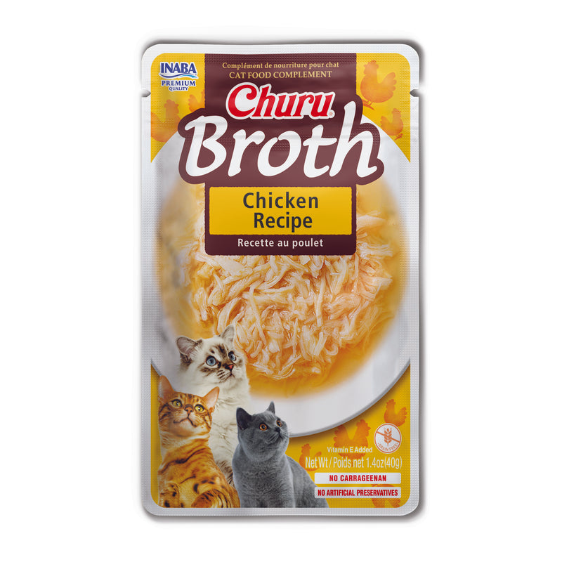 Shop / Unknown Type / Inaba Churu Chicken Broth Pouch Cat Treat Inaba Churu Chicken Broth Pouch Cat Treat Inaba 1.4oz $1.50 $1.89 1.4oz Purchase Options Free In-Store Pick Up Not Available Save 10% on orders $49+ Set your store for inventory and store pickup details Zip Code Search Same-day Delivery* No minimum charge for delivery orders. *Order before 2pm and have it delivered today. Orders placed after 2pm will be delivered the next day. Must be inside delivery radius. Zip Code Unfortunately delivery is not available to this address. In order to ensure the best availability accuracy, changing your selected store will remove all items from your cart. You will need to re-add these items with your newly selected store if you choose to continue. Continue Cancel Ship it to Me Quantity Add To Cart Feeding guide disclaimer ✕ Feeding guides provide a starting point for the amount of food to give your pet each day. We recommend that you keep your pet in ideal body condition and not allow them to become overweight. The amount of food your pet needs can vary based on age, activity level or other food and treats given, so be sure to work with your veterinarian to determine an appropriate weight for your pet, and to make any necessary adjustments to their feeding. Information These convenient individual pouches make a purr-fect side-dish or complement to your furbaby’s meal. The first ingredient is chicken broth made from 100% natural chicken—then, Inaba mixes in succulent flakes of natural chicken plus tuna, scallop or salmon your cat is sure to love. Each delicious, creamy Churu pouch contains 90% moisture and only 16 calories, which makes it a hydrating, healthy snack you can feel good about feeding. Ingredients: Chicken Broth, Chicken, Natural Flavors, Guar Gum, Tapioca Starch, Xanthan Gum, Vitamin E Supplement. Guaranteed analysis: Crude Protein (min) 9.00% Crude Fat (min) 0.20% Crude Fiber (max) 0.30% Moisture (max) 90.00% Vitamin E (min) 50 IU/kg Customers also liked Customer Reviews