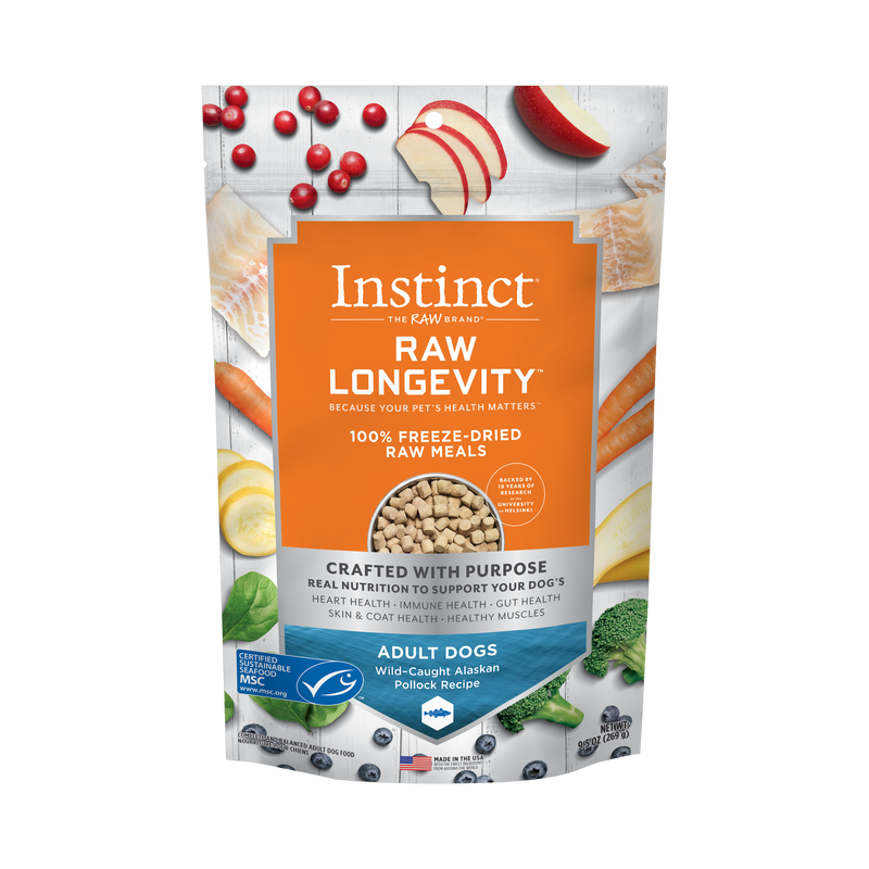 Shop / Unknown Type / Instinct Raw Longevity Adult Freeze Dried Pollock Bites Dog Food, 9.5 oz. Bag Instinct Raw Longevity Adult Freeze Dried Pollock Bites Dog Food, 9.5 oz. Bag Instinct Default Title $31.99 Default Title Purchase Options Free In-Store Pick Up Not Available Save 10% on orders $49+ Set your store for inventory and store pickup details Zip Code Search Same-day Delivery* No minimum charge for delivery orders. *Order before 2pm and have it delivered today. Orders placed after 2pm will be delivered the next day. Must be inside delivery radius. Zip Code Unfortunately delivery is not available to this address. In order to ensure the best availability accuracy, changing your selected store will remove all items from your cart. You will need to re-add these items with your newly selected store if you choose to continue. Continue Cancel Ship it to Me Quantity Add To Cart Feeding guide disclaimer ✕ Feeding guides provide a starting point for the amount of food to give your pet each day. We recommend that you keep your pet in ideal body condition and not allow them to become overweight. The amount of food your pet needs can vary based on age, activity level or other food and treats given, so be sure to work with your veterinarian to determine an appropriate weight for your pet, and to make any necessary adjustments to their feeding. Information We want all pets to live longer, happier, healthier lives and that starts with the food they eat. That's why Instinct® Raw Longevity ™ is raising the bar for raw pet nutrition using recipes intentionally crafted by our pet nutrition scientists. We've figured out how to provide not just the right nutrients, but the right amounts to support optimal health - from your pet's coat to their gut to their heart. Because your pet deserves the best life possible - and it starts with the real nutrition of raw. Ingredients Pollock, Sunflower Oil, Pumpkinseeds, Yellow Squash, Apples, Carrots, Montmorillonite Clay, Ground Flaxseed, Ground Miscanthus Grass, Fish Oil, Spinach, Broccoli, Blueberries, Cranberries, Tricalcium Phosphate, Yeast Culture, Choline Chloride, Vitamins (d-Calcium Pantothenate, Vitamin E Supplement, Thiamine Mononitrate, Vitamin D3 Supplement, Vitamin A Supplement), Potassium Chloride, Minerals (Zinc Proteinate, Iron Proteinate, Copper Proteinate, Manganese Proteinate, Sodium Selenite, Ethylenediamine Dihydriodide), Salt, Taurine, Mixed Tocopherols (for freshness), Rosemary Extract, Dried Bacillus coagulans Fermentation Product. Guaranteed Analysis Crude Protein (min): 58.0%, Crude Fat (min): 16.0%, Crude Fiber (max): 5.0%, Moisture (max): 6.0%, Zinc (min): 200 mg/kg, Selenium (min): 0.75 mg/kg, Vitamin A (min): 60,000 IU/kg, Vitamin E (min): 100 IU/kg, *Taurine (min): 0.35%, *Omega 3 Fatty Acid (min) 2.00%, *Omega 6 Fatty Acid (min) 1.75%, *Bacillus coagulans (min): 75,000,000 CFU/lb, *Not recognized as an essential nutrient by the AAFCO Dog Food Nutrient Profiles Customers also liked Customer Reviews