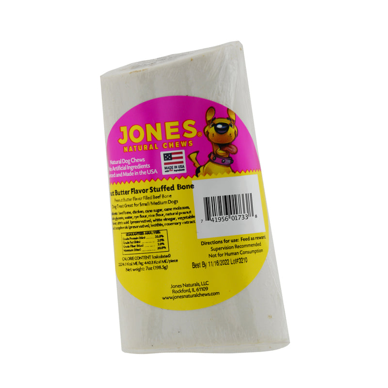 Shop / Unknown Type / Jones Natural Chews 4" Stuffed Bone Peanut Butter Flavor Dog Bone Jones Natural Chews 4" Stuffed Bone Peanut Butter Flavor Dog Bone Jones Natural Chews Peanut Butter $8.99 Peanut Butter Purchase Options Free In-Store Pick Up Not Available Save 10% on orders $49+ Set your store for inventory and store pickup details Zip Code Search Same-day Delivery* No minimum charge for delivery orders. *Order before 2pm and have it delivered today. Orders placed after 2pm will be delivered the next day. Must be inside delivery radius. Zip Code Unfortunately delivery is not available to this address. In order to ensure the best availability accuracy, changing your selected store will remove all items from your cart. You will need to re-add these items with your newly selected store if you choose to continue. Continue Cancel Ship it to Me Quantity Add To Cart Feeding guide disclaimer ✕ Feeding guides provide a starting point for the amount of food to give your pet each day. We recommend that you keep your pet in ideal body condition and not allow them to become overweight. The amount of food your pet needs can vary based on age, activity level or other food and treats given, so be sure to work with your veterinarian to determine an appropriate weight for your pet, and to make any necessary adjustments to their feeding. Information Jones Peanut Butter Flavor Stuffed Bone is a 4? natural USA white bare bone filled with peanut butter flavored goodies. These extremely popular bones will keep small to medium size dogs busy for hours, digging for the awesome treat buried inside. The mix of texture, between the filling and the bone offer a great chewing experience for dogs. All Jones products are raised, sourced and handcrafted in the United States. Ingredients: beef bone, chicken, cane sugar, rice flour, cane molasses, vegetable glycerin, water, natural peanut butter flavor, citric acid (preservative), white vinegar, vegetable oil, mixed tocopherols (preservative), lecithin, rosemary extract. Guaranteed Analysis: Protein Min. 18%, Fat Min. 3.5%, Fiber Max. 2%, Moisture Max. 22% Customers also liked Customer Reviews