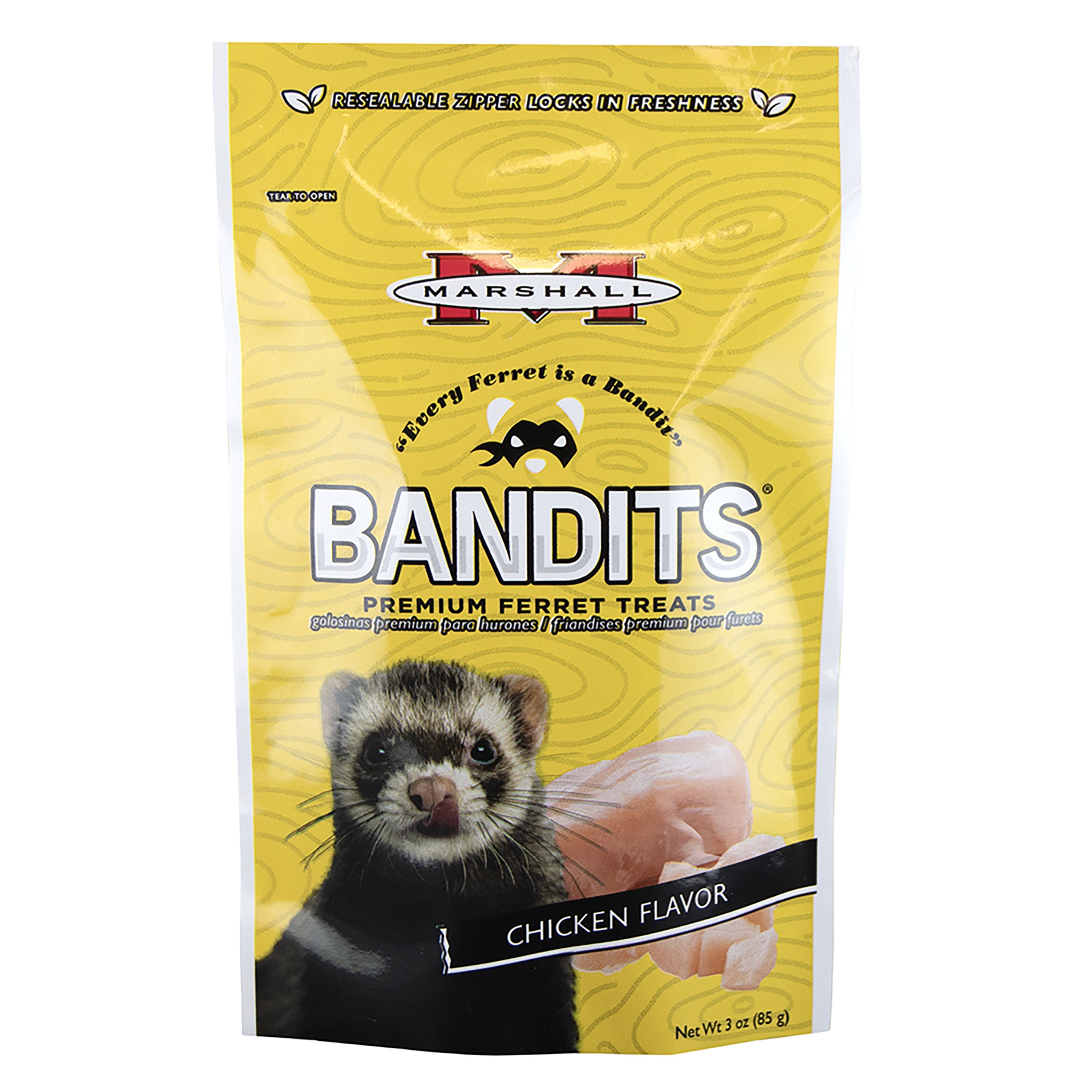 Shop / Unknown Type / Marshall Bandits Ferret Treat, Chicken Flavor, Dry, 3 oz Bag Marshall Bandits Ferret Treat, Chicken Flavor, Dry, 3 oz Bag Marshall Pet Products 3 oz $5.99 3 oz Purchase Options Free In-Store Pick Up Not Available Save 10% on orders $49+ Set your store for inventory and store pickup details Zip Code Search Same-day Delivery* No minimum charge for delivery orders. *Order before 2pm and have it delivered today. Orders placed after 2pm will be delivered the next day. Must be inside delivery radius. Zip Code Unfortunately delivery is not available to this address. In order to ensure the best availability accuracy, changing your selected store will remove all items from your cart. You will need to re-add these items with your newly selected store if you choose to continue. Continue Cancel Ship it to Me Quantity Add To Cart Feeding guide disclaimer ✕ Feeding guides provide a starting point for the amount of food to give your pet each day. We recommend that you keep your pet in ideal body condition and not allow them to become overweight. The amount of food your pet needs can vary based on age, activity level or other food and treats given, so be sure to work with your veterinarian to determine an appropriate weight for your pet, and to make any necessary adjustments to their feeding. Information At Marshall we believe that every pet deserves to be happy and healthy. Our delicious line of Bandits treats are available in many ferret-friendly flavors. Every recipe starts with fresh meat and all flavoring is natural. Rest assured that our treats are high in protein and low in sugar for healthy snacking and rewarding! Customers also liked Customer Reviews