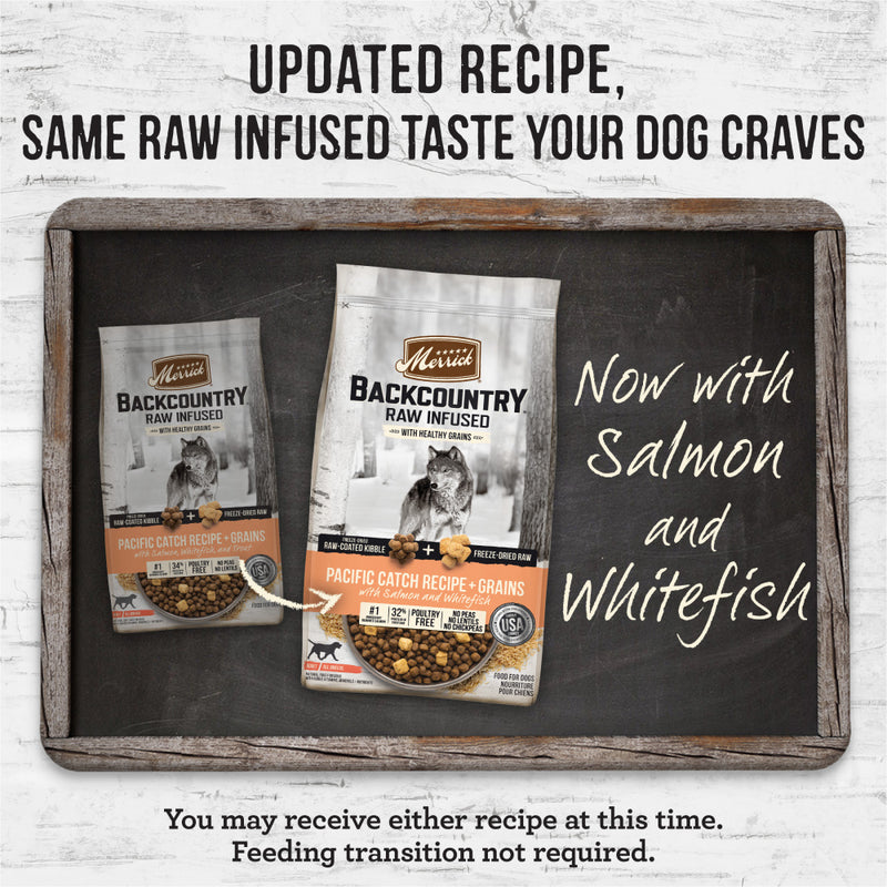 Shop / Dog Food / Merrick Backcountry Raw Infused with Healthy Grains Pacific Catch Recipe Dry Dog Food Merrick Backcountry Raw Infused with Healthy Grains Pacific Catch Recipe Dry Dog Food Merrick $27.99 4 lb 20 lb 4-lb 20-lb Purchase Options Free In-Store Pick Up Not Available Save 10% on orders $49+ Set your store for inventory and store pickup details Zip Code Search Same-day Delivery* No minimum charge for delivery orders. *Order before 2pm and have it delivered today. Orders placed after 2pm will be delivered the next day. Must be inside delivery radius. Zip Code Unfortunately delivery is not available to this address. In order to ensure the best availability accuracy, changing your selected store will remove all items from your cart. You will need to re-add these items with your newly selected store if you choose to continue. Continue Cancel Ship it to Me Quantity Add To Cart Feeding guide disclaimer ✕ Feeding guides provide a starting point for the amount of food to give your pet each day. We recommend that you keep your pet in ideal body condition and not allow them to become overweight. The amount of food your pet needs can vary based on age, activity level or other food and treats given, so be sure to work with your veterinarian to determine an appropriate weight for your pet, and to make any necessary adjustments to their feeding. Information Backcountry means back to nature. It’s an all-natural, ancestral diet packed with the protein dogs crave and loaded with the nutrients they need. It mixes freeze-dried raw-coated kibble with freeze-dried raw pieces of real meat, poultry or fish—all with a texture and taste so delicious your dog will go wild for it. Backcountry offers both healthy grain and grain free dog food recipes and is best for all life stages and all breed sizes. PROTEIN-PACKED KIBBLE + FREEZE-DRIED RAW-COATED KIBBLE + REAL WHOLE PIECES OF FREEZE-DRIED RAW MEAT Freeze dried raw meat, safely processed for a convenient and nutritious option for those pet parents interested in a raw-style diet. Ingredients Deboned Salmon, Salmon Meal, Whitefish Meal, Brown Rice, Oatmeal, Barley, Sunflower Oil, Natural Flavor, Potato Protein, Whitefish, Trout, Flaxseed, Potassium Chloride, Salt, Apples, Blueberries, Organic Dehydrated Alfalfa Meal, Choline Chloride, Minerals (Iron Amino Acid Complex, Zinc Amino Acid Complex, Zinc Sulfate, Sodium Selenite, Manganese Amino Acid Complex, Copper Amino Acid Complex, Copper Sulfate, Potassium Iodide, Cobalt Proteinate, Cobalt Carbonate), Taurine, Yucca Schidigera Extract, Mixed Tocopherols for freshness, Vitamins (Vitamin E Supplement, Vitamin B12 Supplement, Vitamin A Acetate, d-Calcium Pantothenate, Thiamine Mononitrate, Niacin, Riboflavin Supplement, Biotin, Vitamin D3 Supplement, Folic Acid, Pyridoxine Hydrochloride), Citric Acid for freshness, Dried Lactobacillus plantarum Fermentation Product, Dried Lactobacillus casei Fermentation Product, Dried Enterococcus faecium Fermentation Product, Dried Lactobacillus acidophilus Fermentation Product. Guaranteed Analysis Nutrient Guaranteed Units Crude Protein 34% min Crude Fat 16% min Crude Fiber 3.5% max Moisture 11% max Customers also liked Customer Reviews